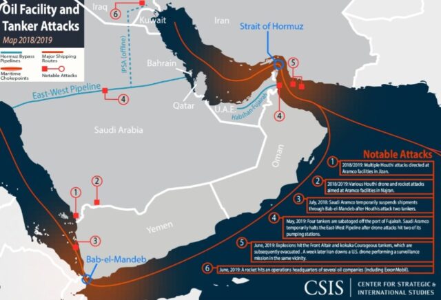 Selat Hormuz merupakan titik persimpangan maritim paling kritis di dunia, karena menghubungkan Teluk Persia dengan perairan terbuka, yang lebarnya hanya 21 mil pada titik tersempitnya. Selain itu sepertiga minyak dunia yang diangkut melalui laut mengalir melalui wilayah ini, serta digunakan oleh lebih dari 30 persen ekspor LNG secara global.