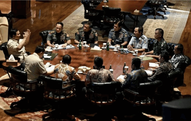 Dalam rapat terbatas itu, Presiden Prabowo berbicara langsung dengan Menteri Pertahanan (Menhan) Sjafrie Sjamsoeddin, yang tepat duduk di sebelah kanan Presiden, kemudian, Panglima TNI Jenderal TNI Agus Subiyanto, yang duduk tepat di sebelah kiri Presiden.