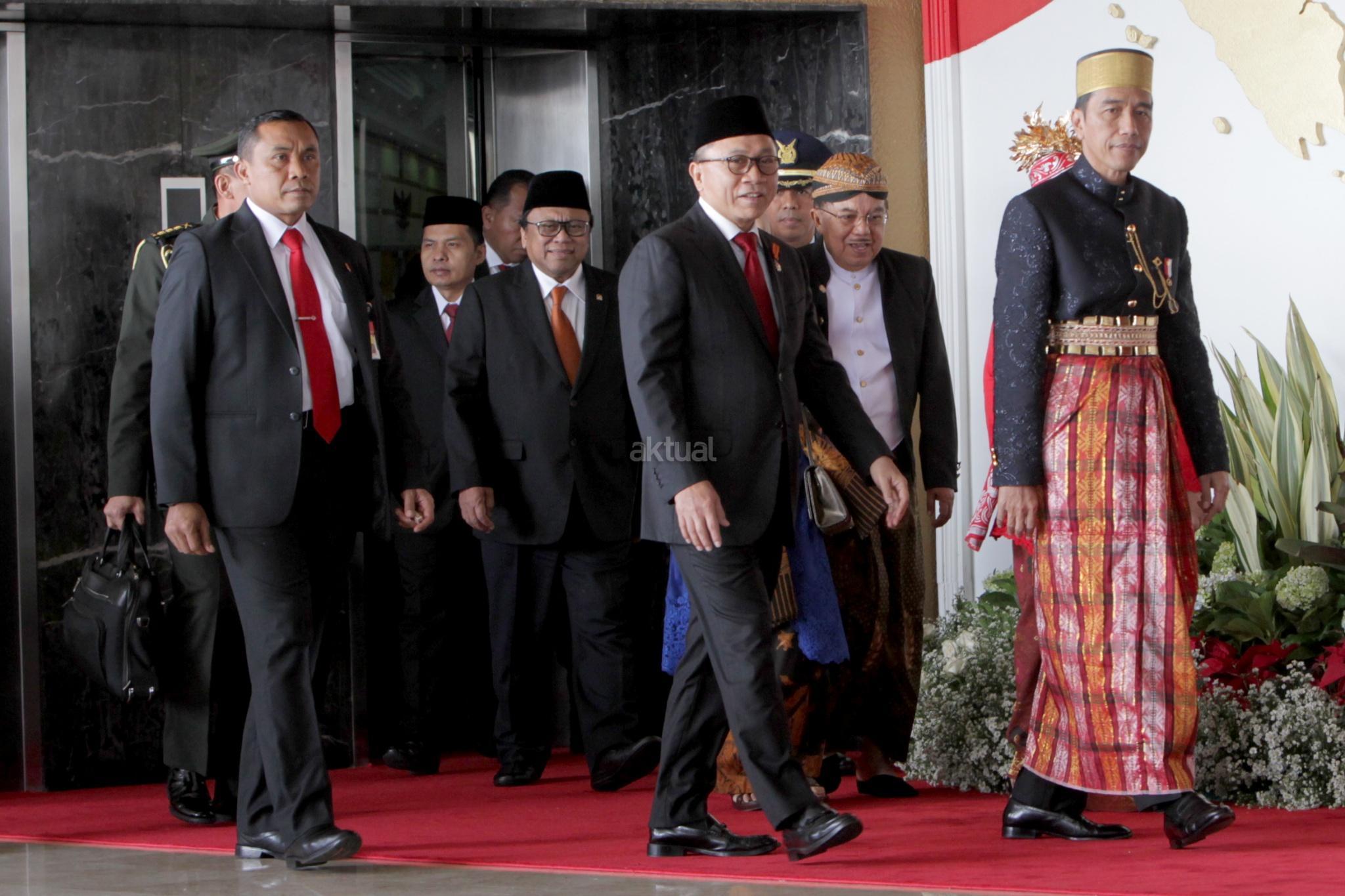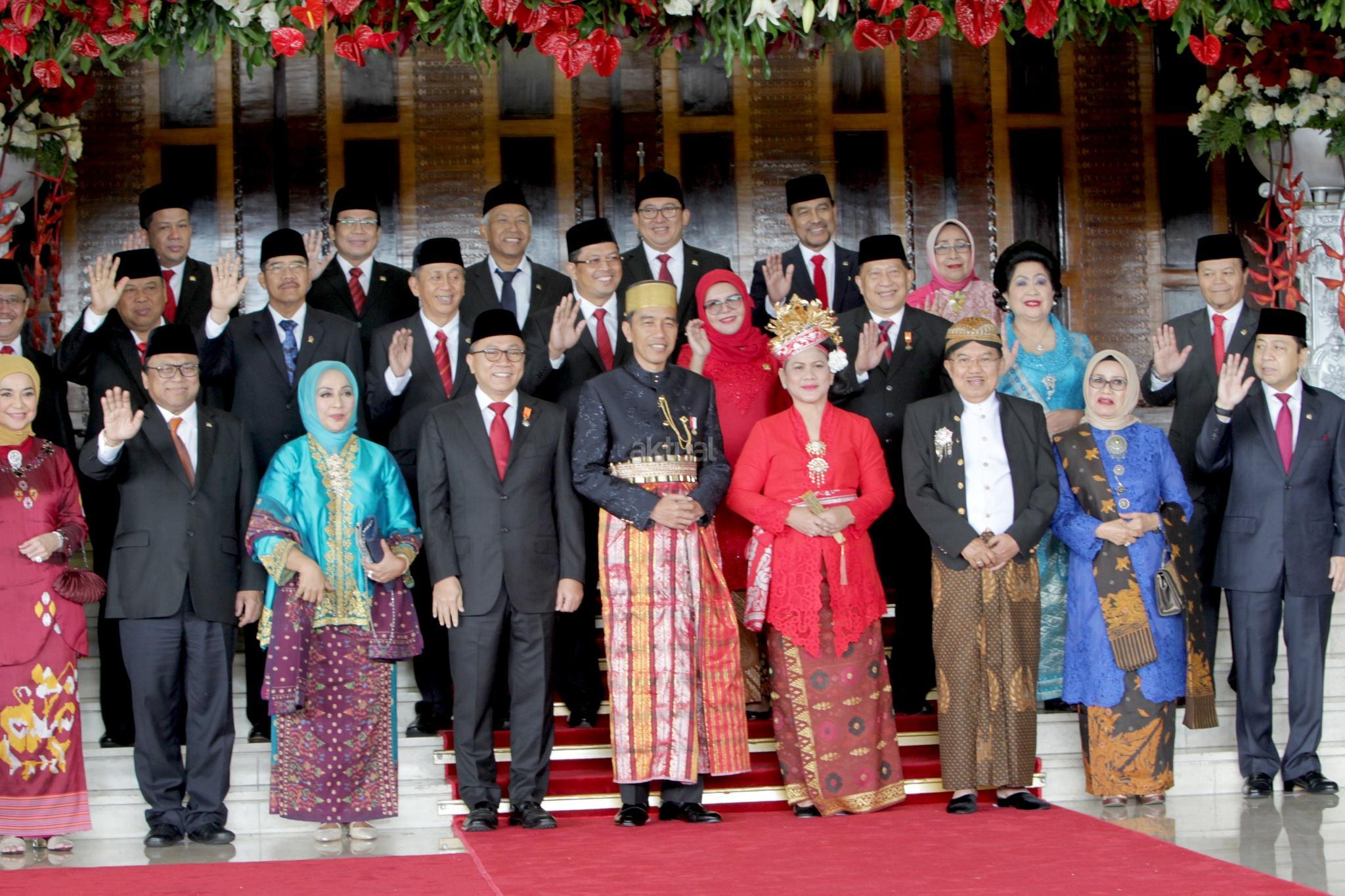 Presiden Jokowi dan Wakil Presiden Jusuf Kalla serta para pimpinan tinggi lembaga negara berfoto bersama sebelum menghadiri pembukaan Sidang Tahunan MPR RI Tahun 2017 di Kompleks Parlemen, Senayan, Jakarta, Rabu (16/8). AKTUAL/Tino Oktaviano