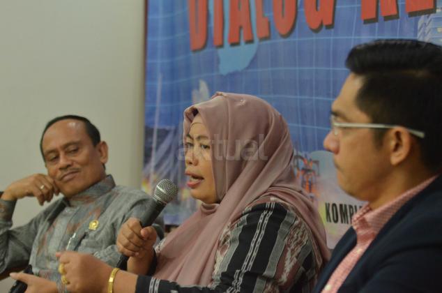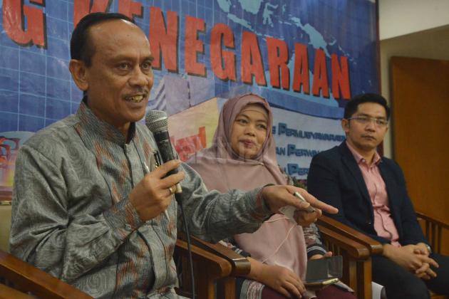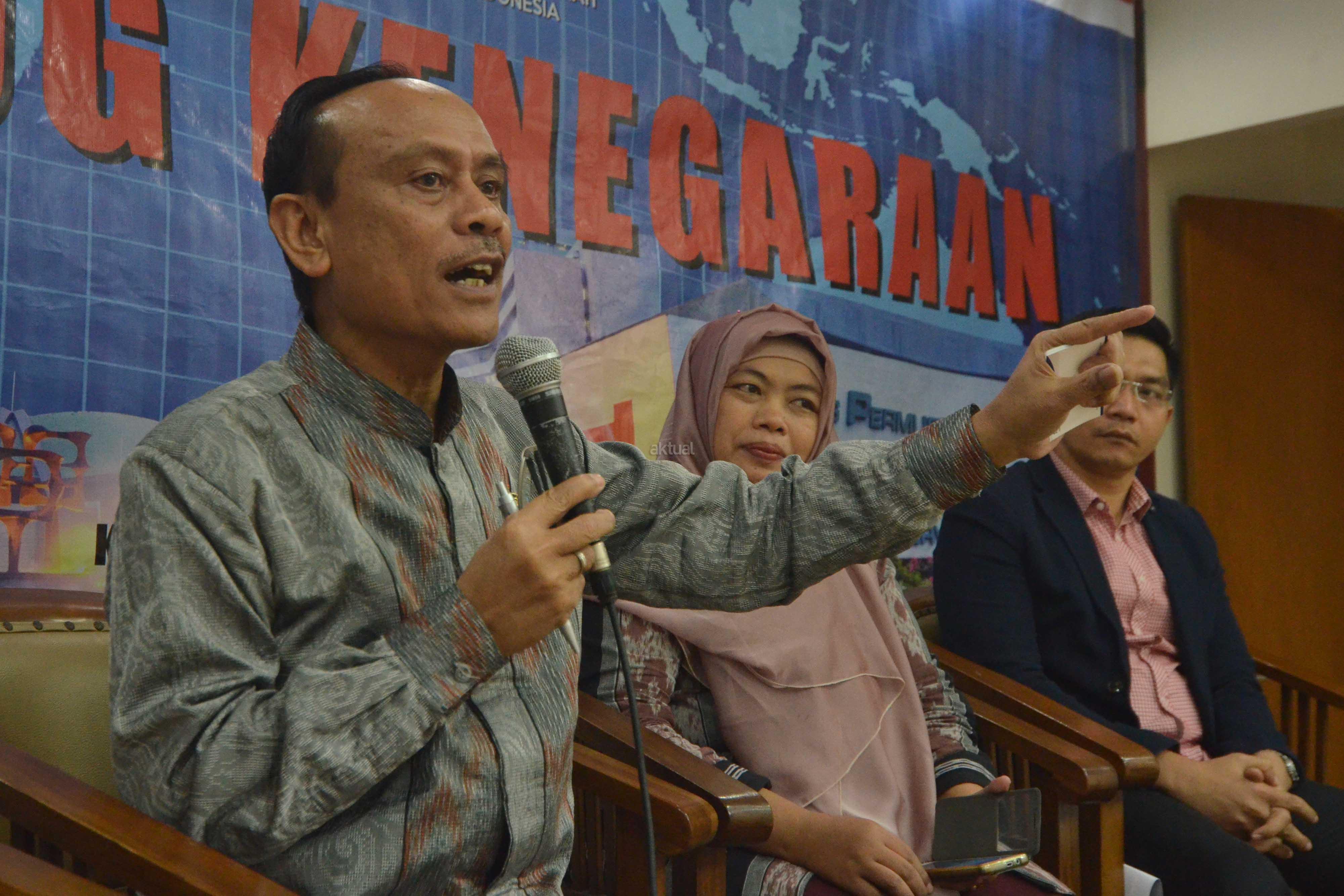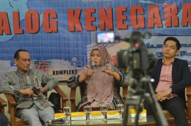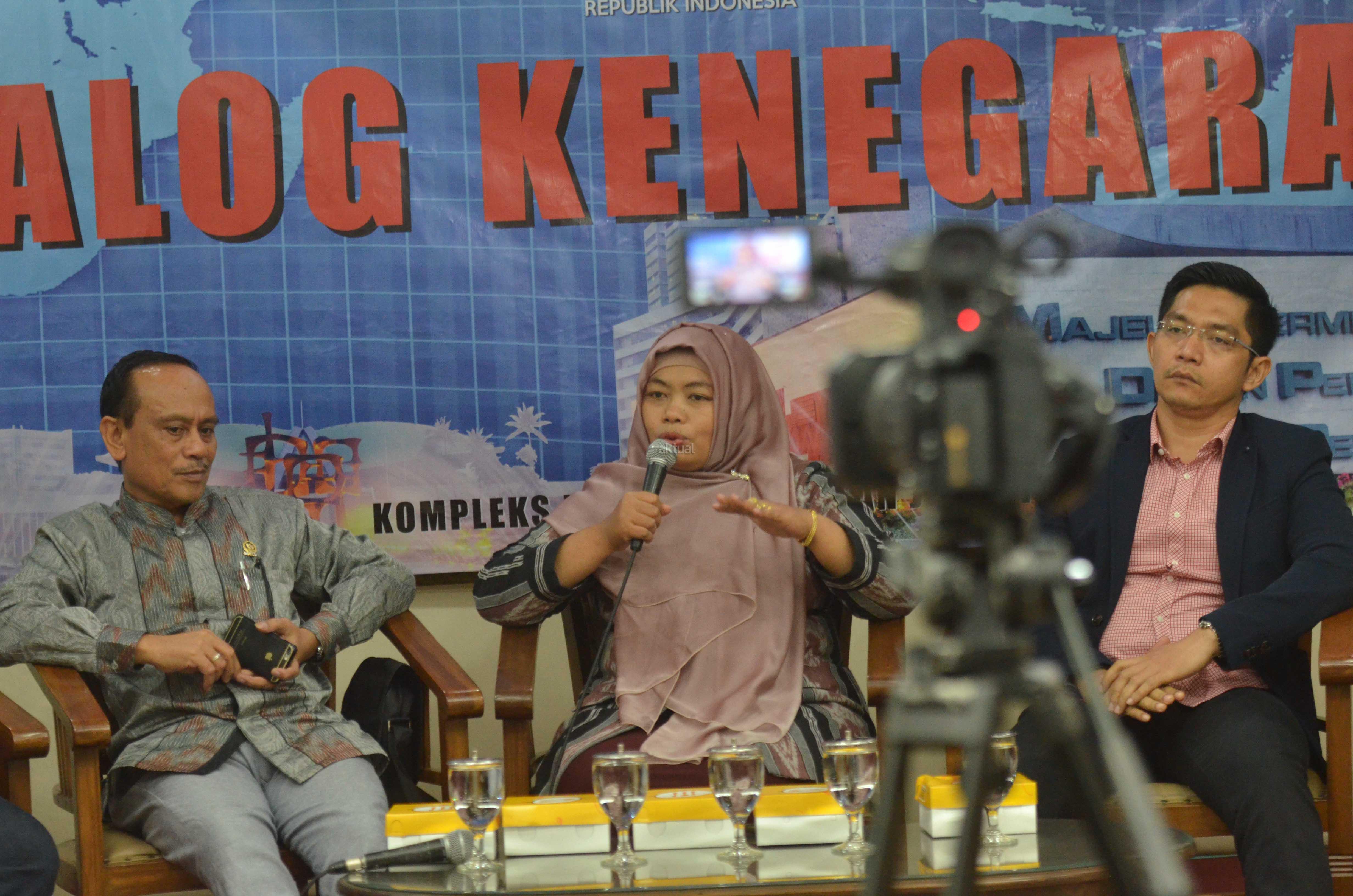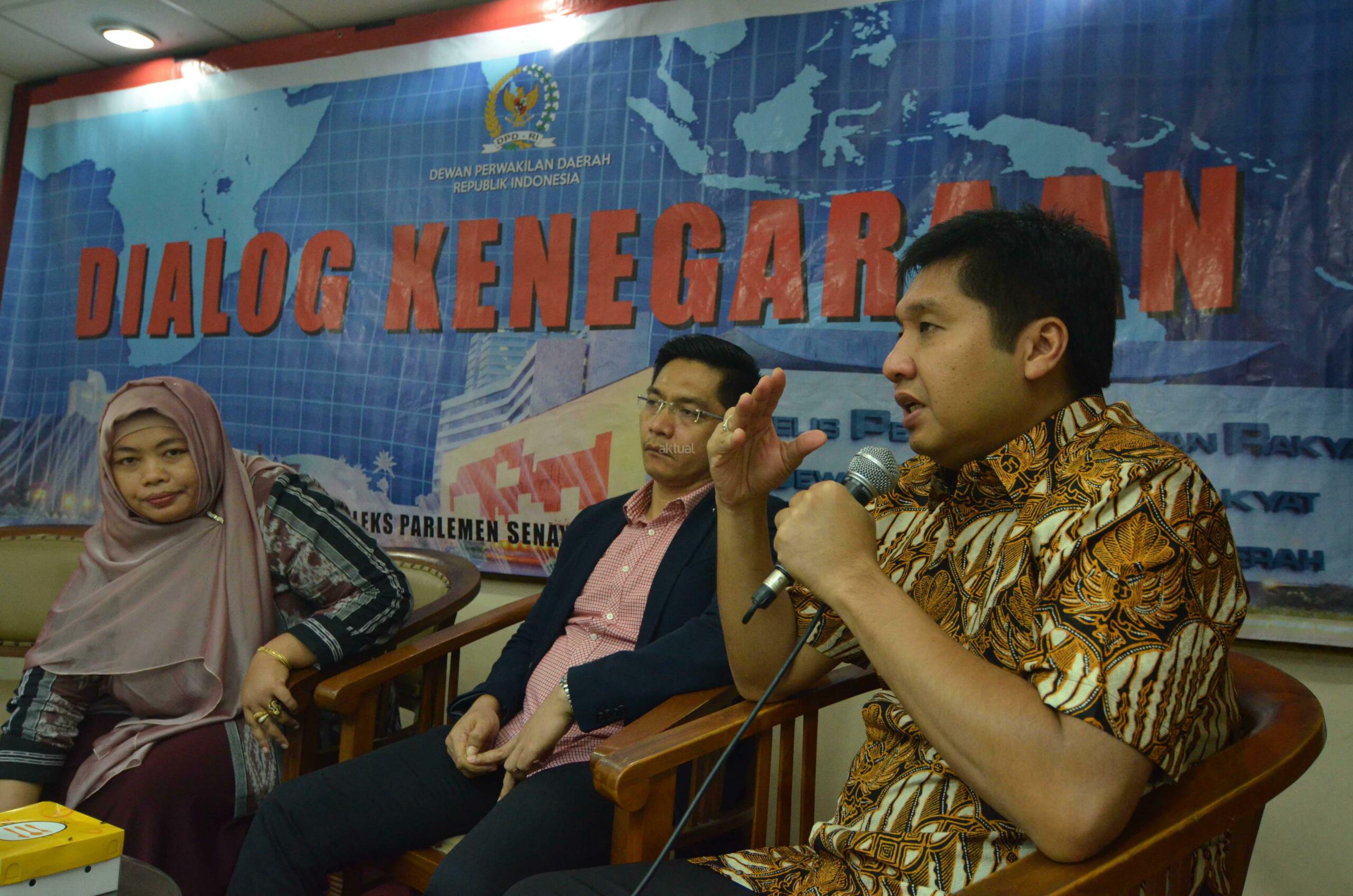 Paket Ekonomi Jokowi dan Pengaruhnya: Direktur Eksekutif INDEF Enny Sri Hartati (tengah), Ketua Komite IV DPD RI Ajiep Padindang (kiri) dan Pengamat Ekonomi Universitas Sahid Yusuf menjadi narasumber pada dialog kenegaraan "Paket ekonomi Jokowi dan Pengaruhnya terhadap perekonomian rakyat di Komplek Parlemen Senayan , Jakarta, Rabu (7/10/2015).