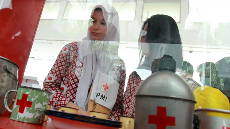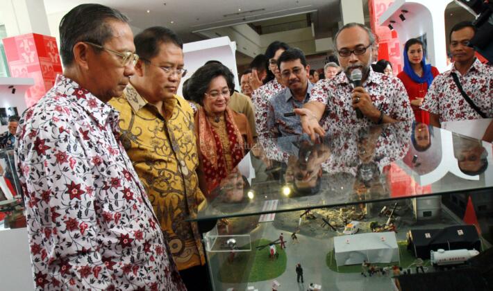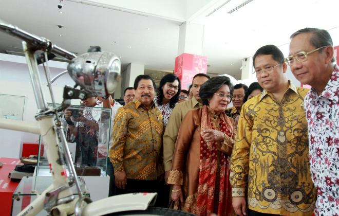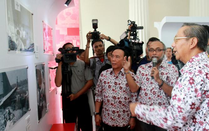 Wakil Ketua Umum PMI Ginanjar Kartasasmita didampingi Menkominfo Rudiantara dan Mutia Hatta saat meninjau pameran dan peluncuran prangko peringatan 70 tahu PMI di Museum Nasional, Jakarta, Kamis (10/9/2015). Pameran 70 tahun PMI diselenggarakan selama 7 (hari) hari dimulai dari tanggal 10/17 Semptember 2015 di Museum Nasional dan dibuka untuk