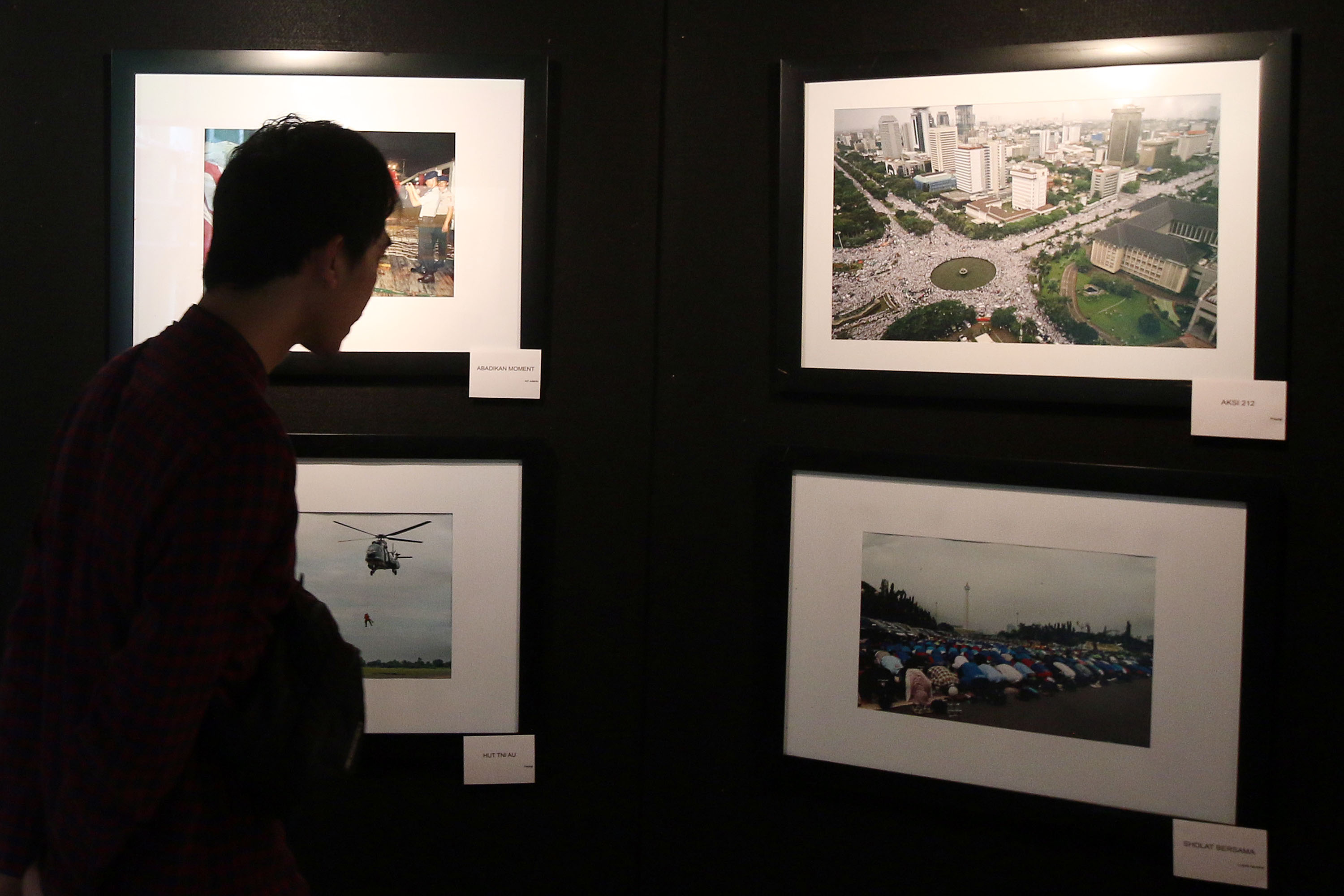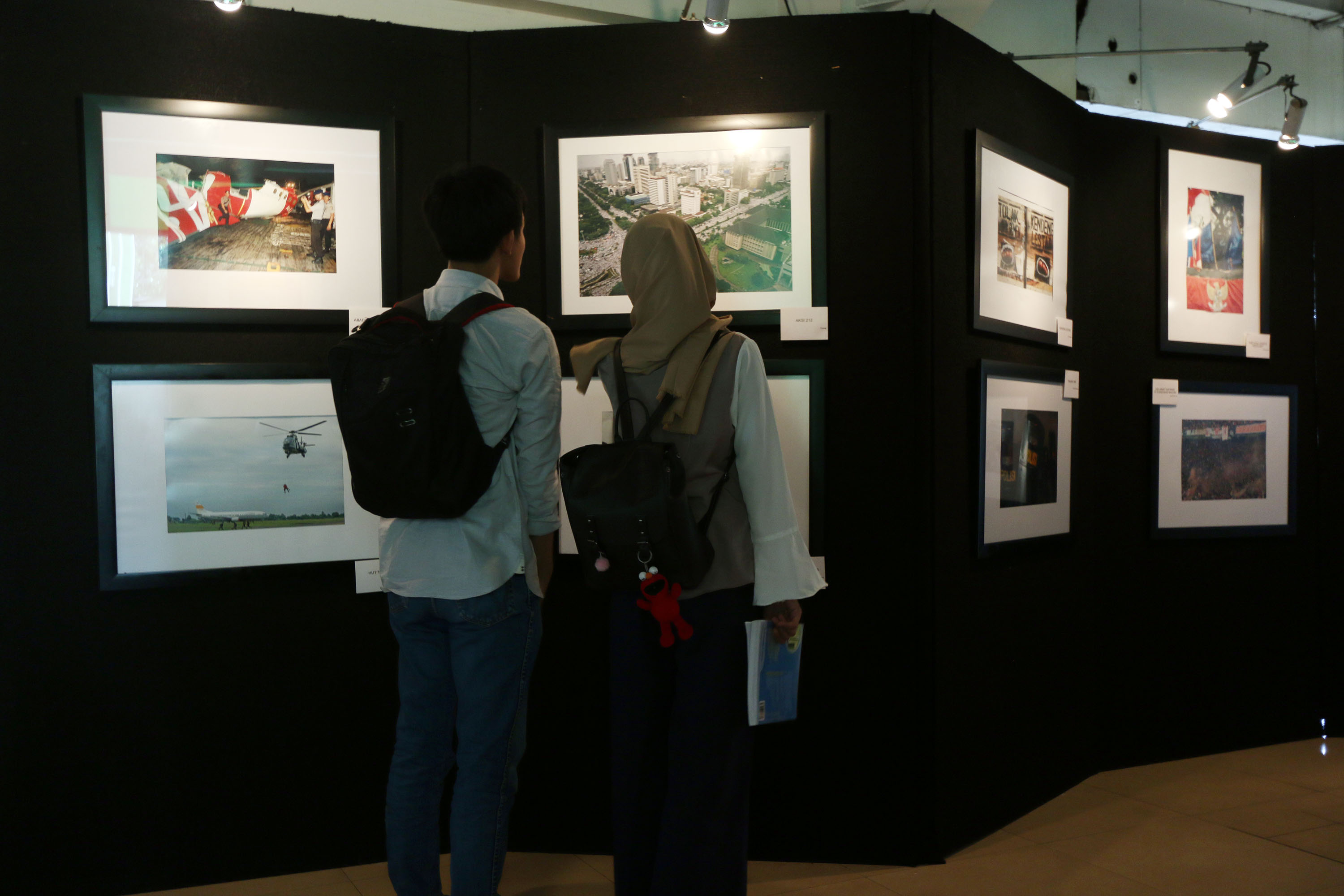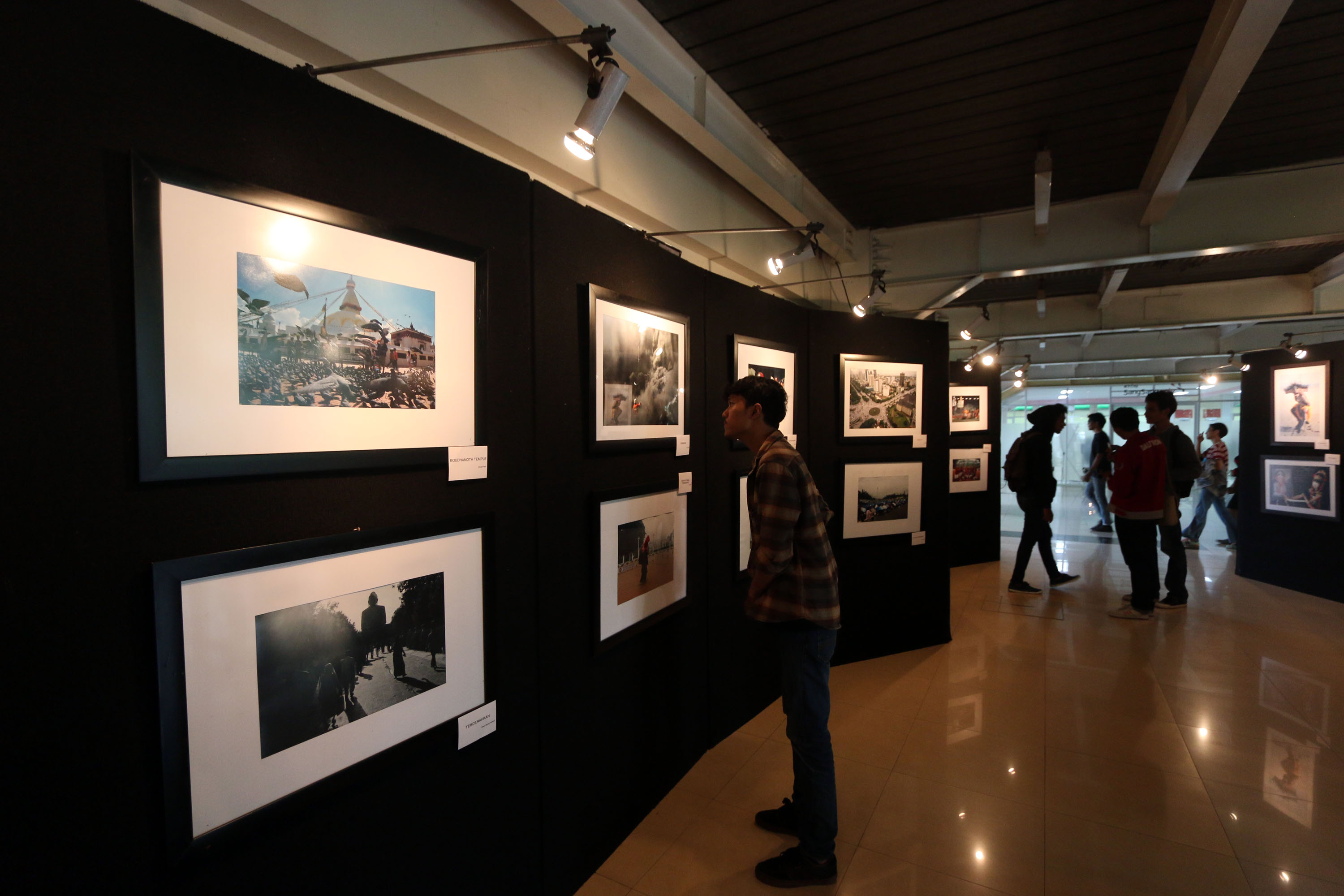 Mahasiswa mengamati karya foto yang dipamerkan dalam pameran fotografi jurnalistik di selasar Universitas Nasional, Jakarta, Senin (20/11/2017). Pameran fotografi bertajuk “Reborn” tersebut diikuti oleh 17 peserta dan berlangsung dari tanggal 20 hingga 25 November 2017. AKTUAL/HO