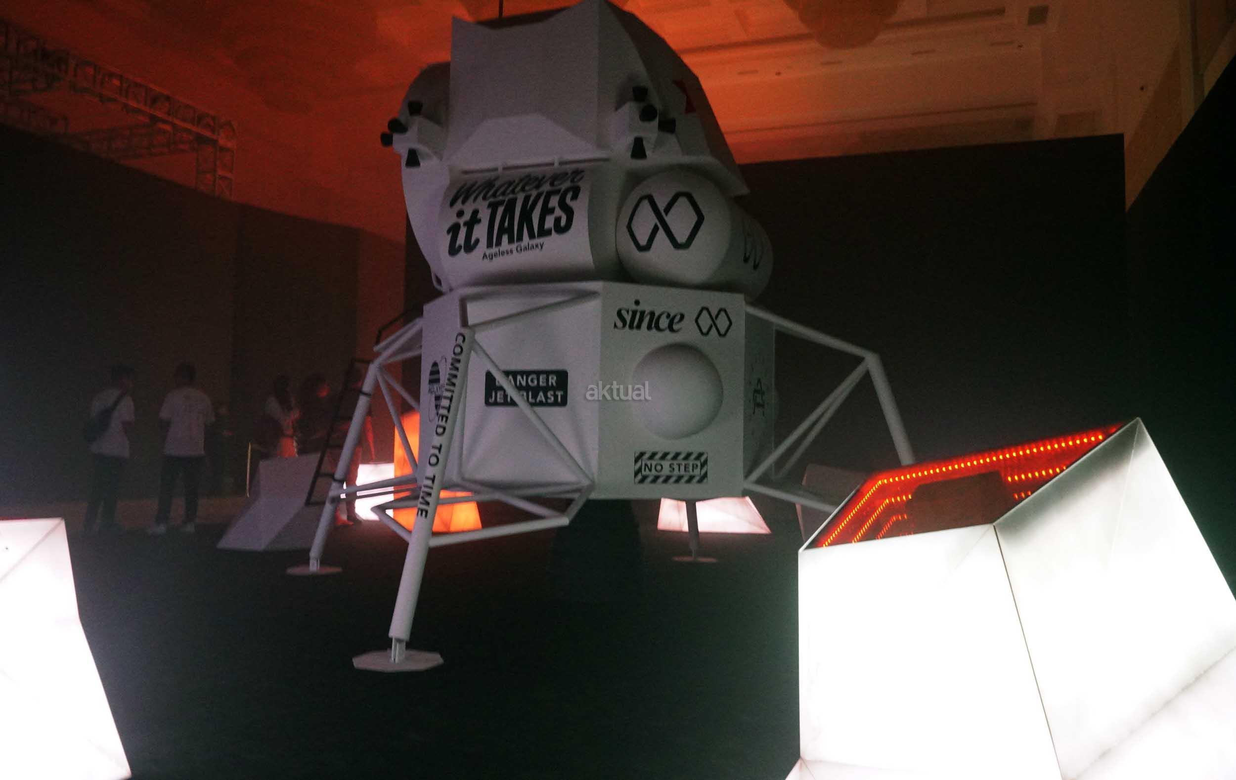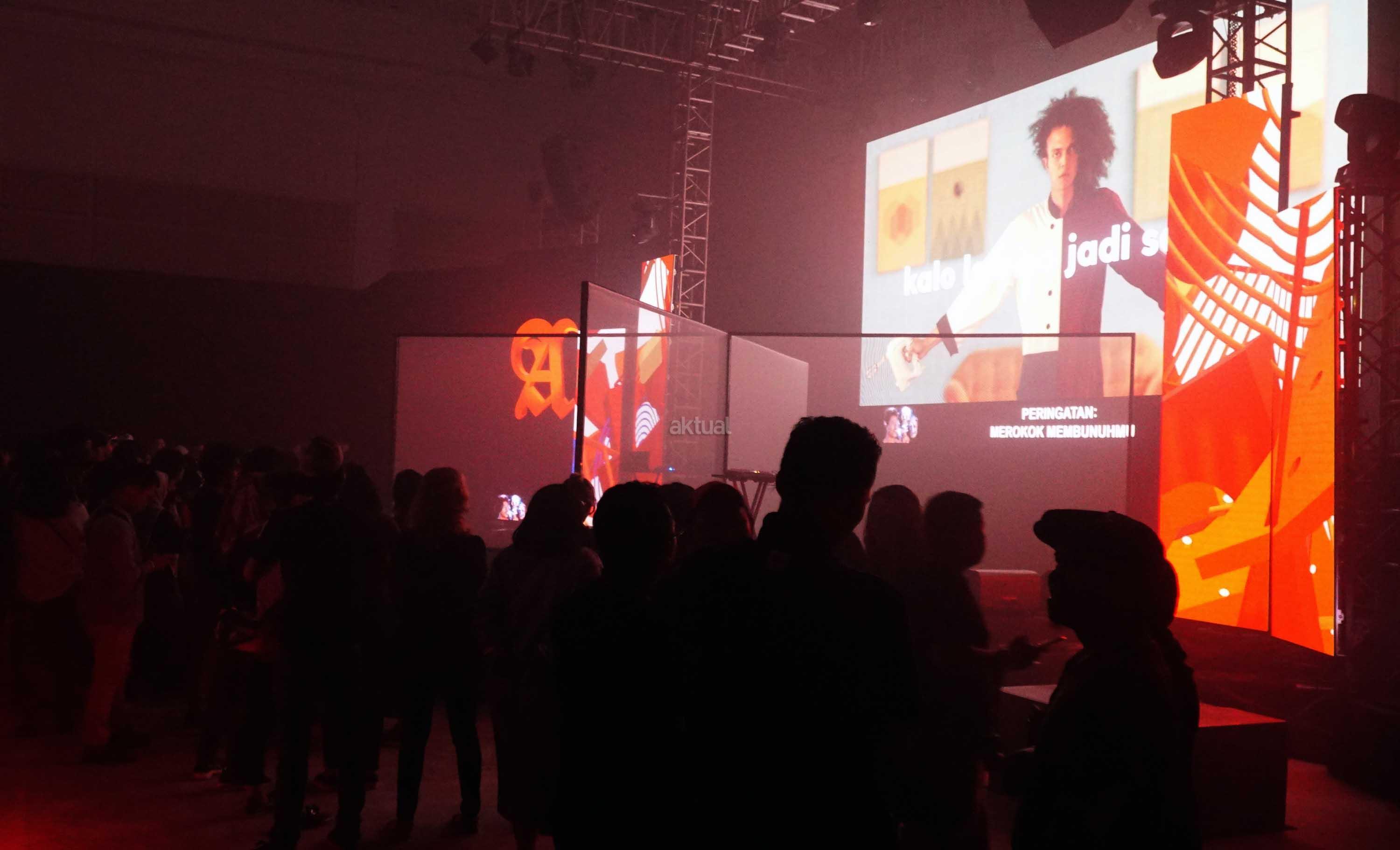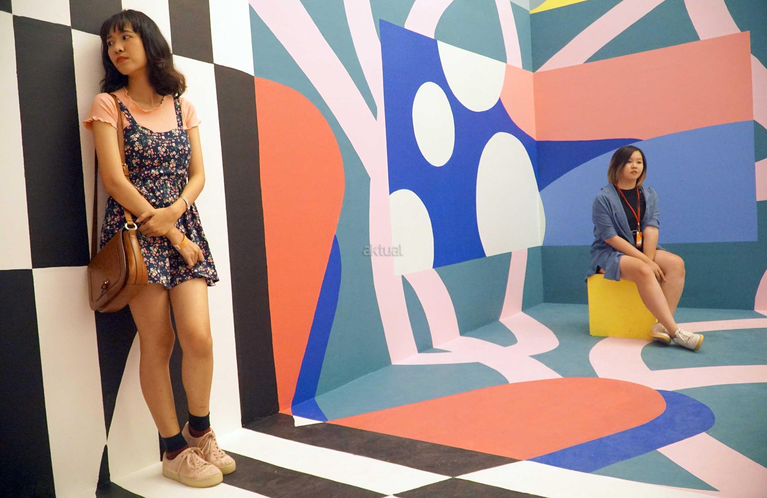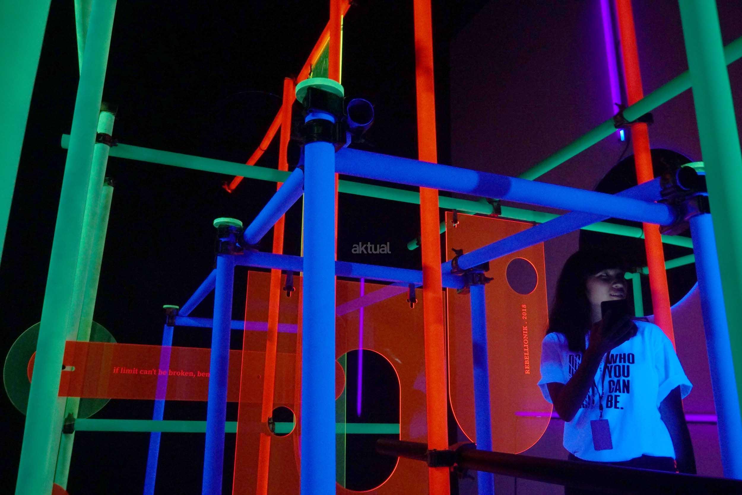 Pengunjung melihat seni instalasi karya sembilan matahari pada acara Jakarta Wave of Tomorrow 2018 di Tribrata Grand Ballroom, Jakarta, Sabtu (20/10). Festival seni instalasi berbasis teknologi digelar pada 19-28 Oktober 2018. AKTUAL/Eko S Hilman