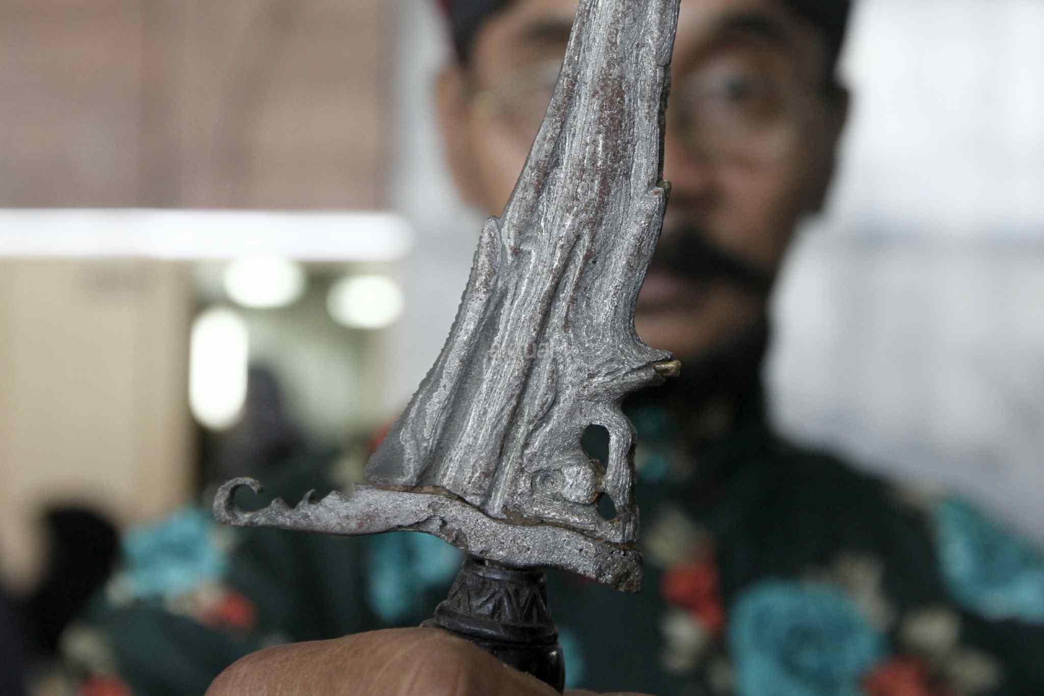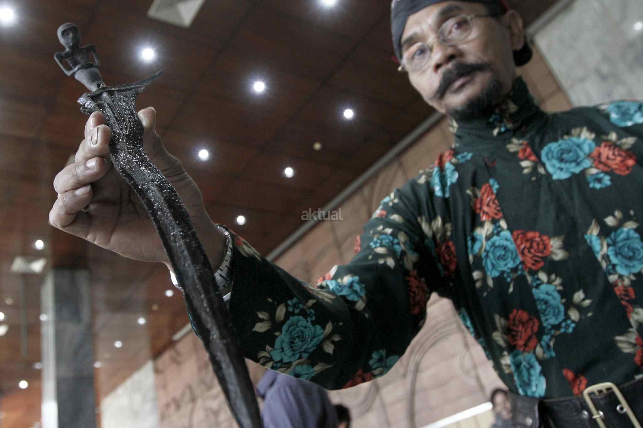 Seorang penjual memperlihatkan keris pameran keris di Kompleks Parlemen, Senayan, Jakarta, Rabu (15/3/2017). DPR bersama komunitas dari Bali dan Lombok gelar pameran keris hingga 17 Maret 2017 mendatang. AKTUAL/Tino Oktaviano