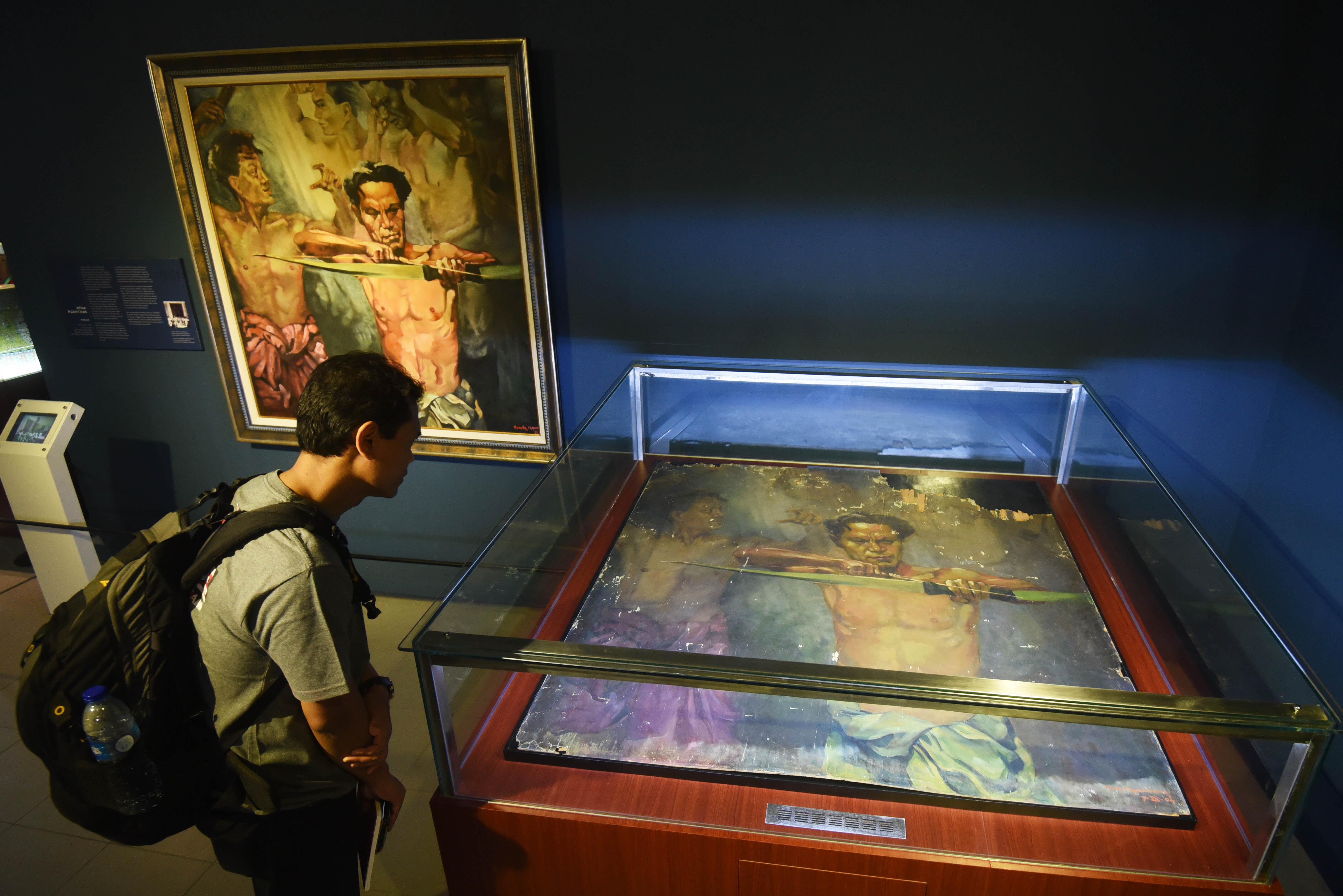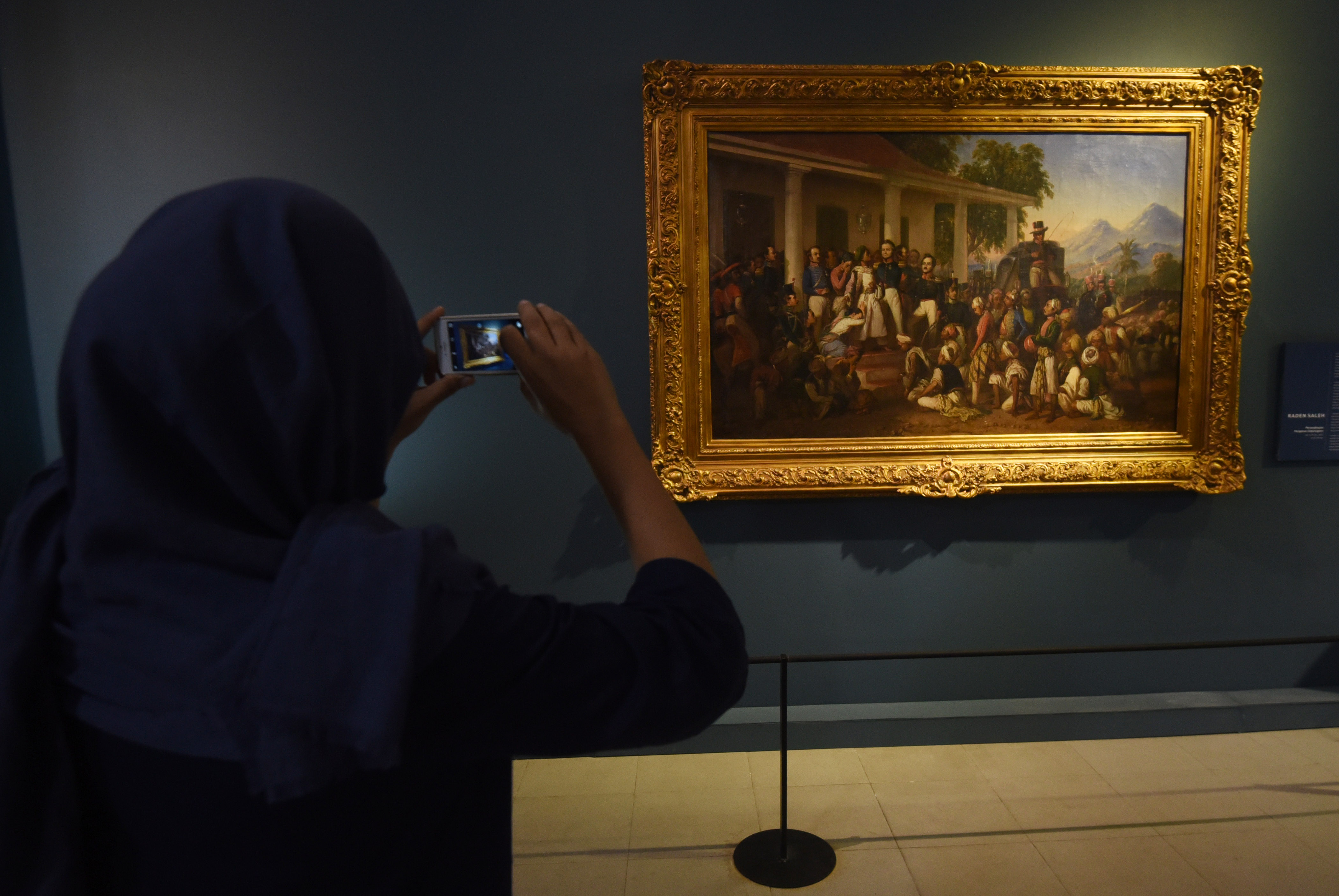 Pengunjung memperhatikan lukisan karya Raden Saleh berjudul Penangkapan Pangeran Dipenegoro tahun 1857 yang dipamerkan di Galeri Nasional, Jakarta, Senin (1/8). Pameran bertajuk 17|71 Goresan Juang Kemerdekaan itu menampilkan 28 lukisan koleksi Istana di Indonesia berlangsung dalam rangka memeriahkan HUT Kemerdekaan RI ke-71. ANTARA FOTO/Akbar Nugroho Gumay/foc/16.