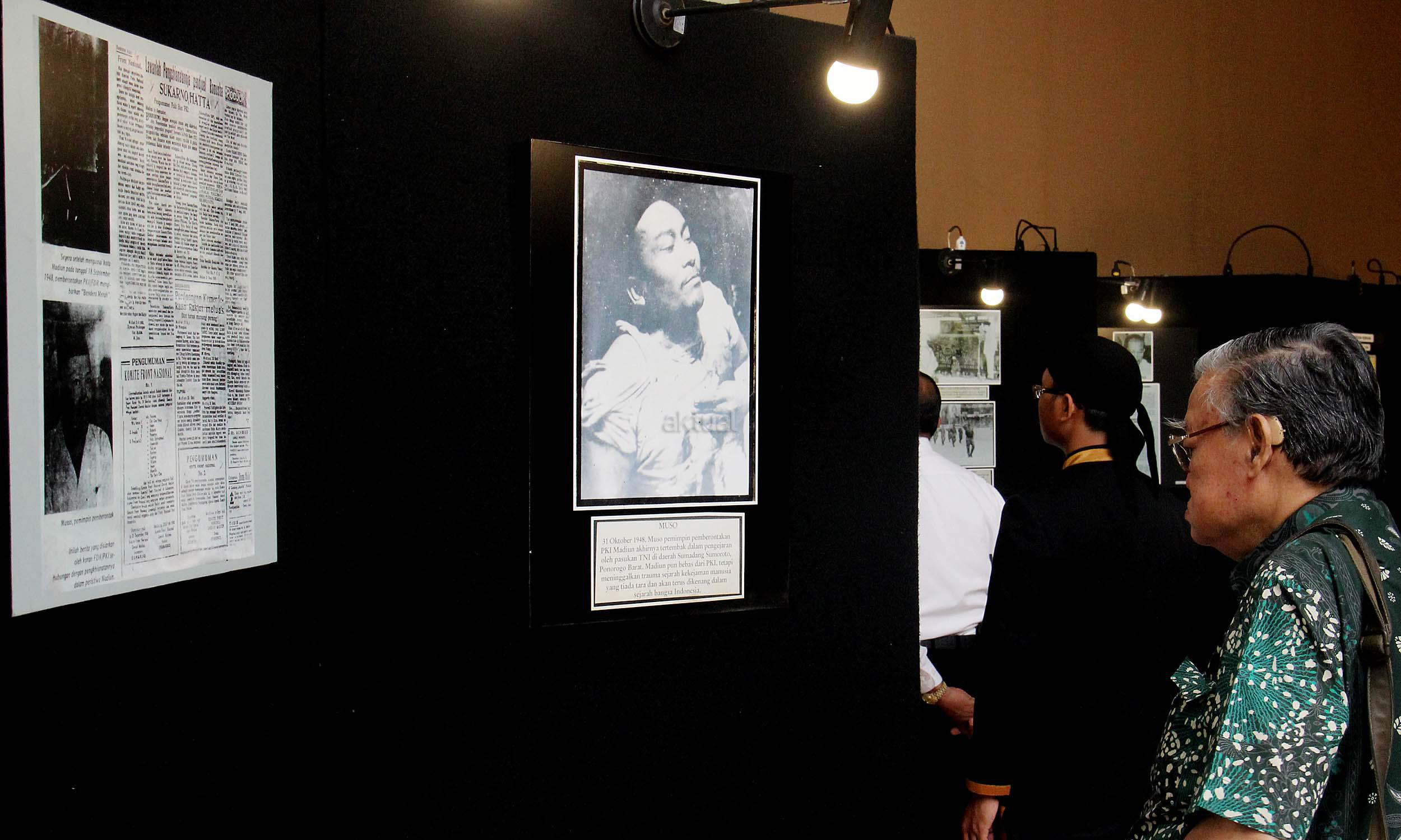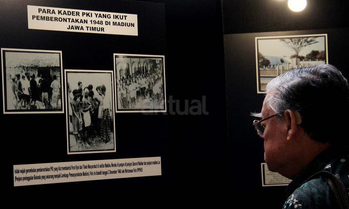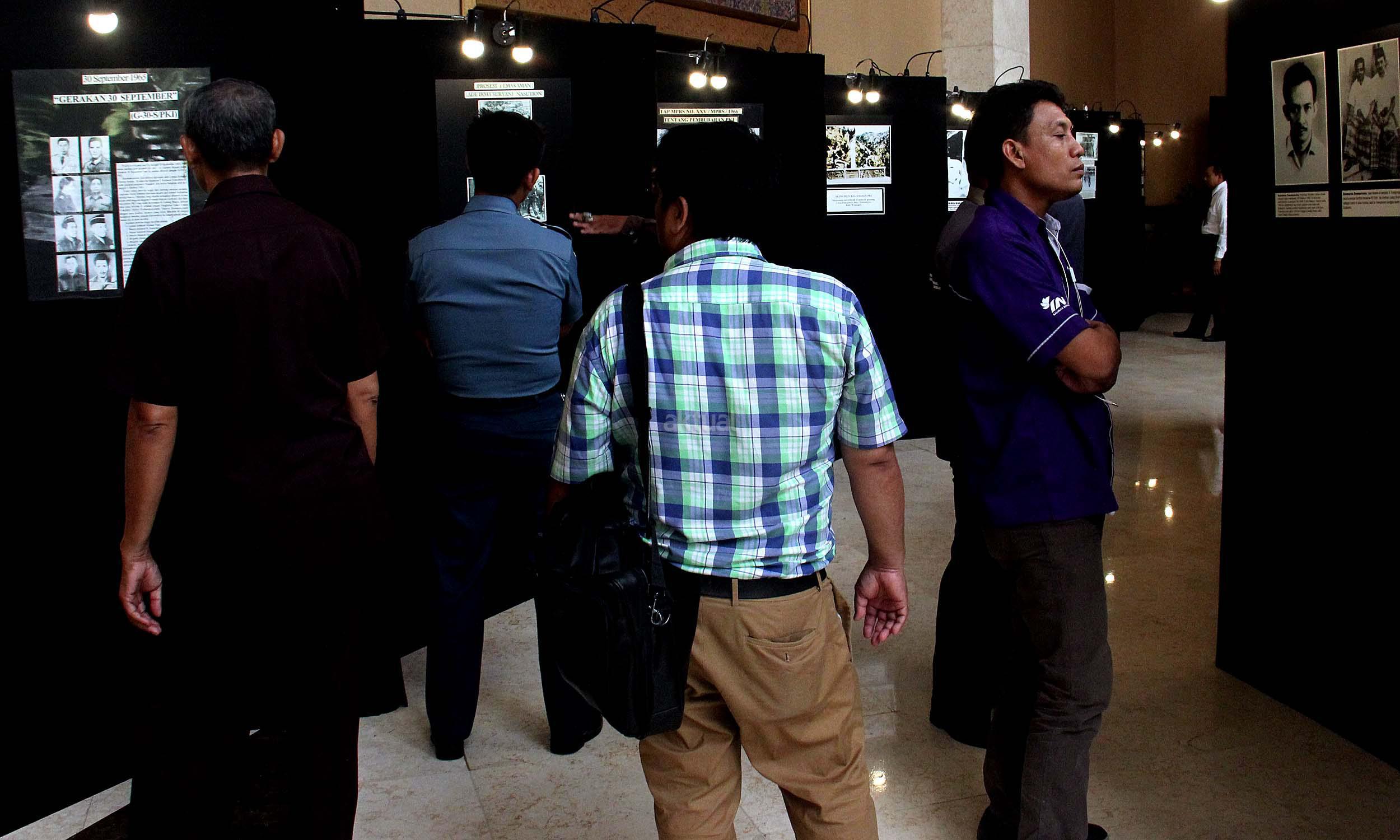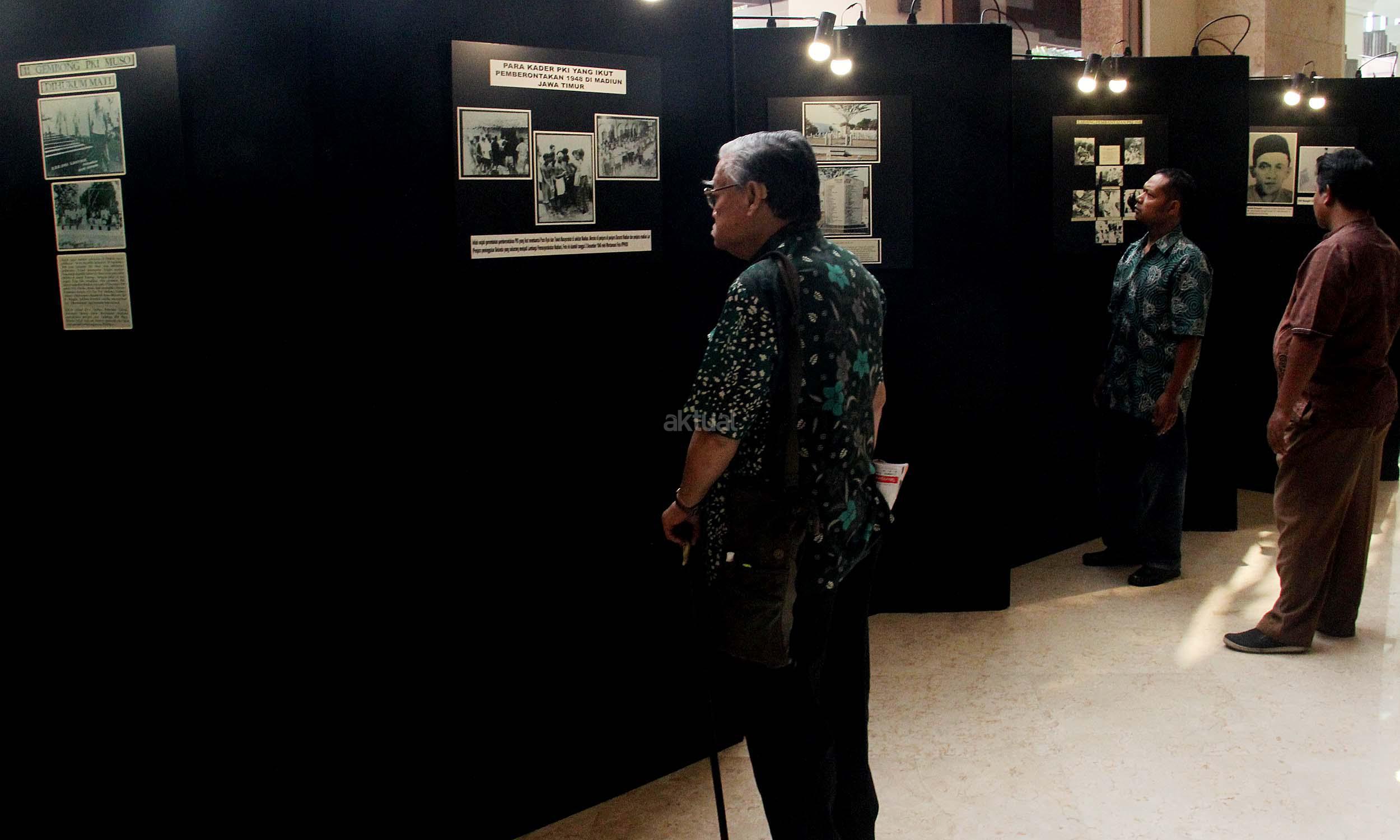 Para pengunjung saat melihat pameran foto saat acara simposium Mengamankan Pancasila dari Ancaman Kebangkitan PKI dan Ideologi Lain di Balai Kartini, Jakarta, Rabu (1/6/2016). Selain acara simposium Mengamankan Pancasila dari Ancaman Kebangkitan PKI dan Ideologi Lain ada pameran foto yang dimana kekejaman PKI dan pemberontakan PKI di masa lalu.