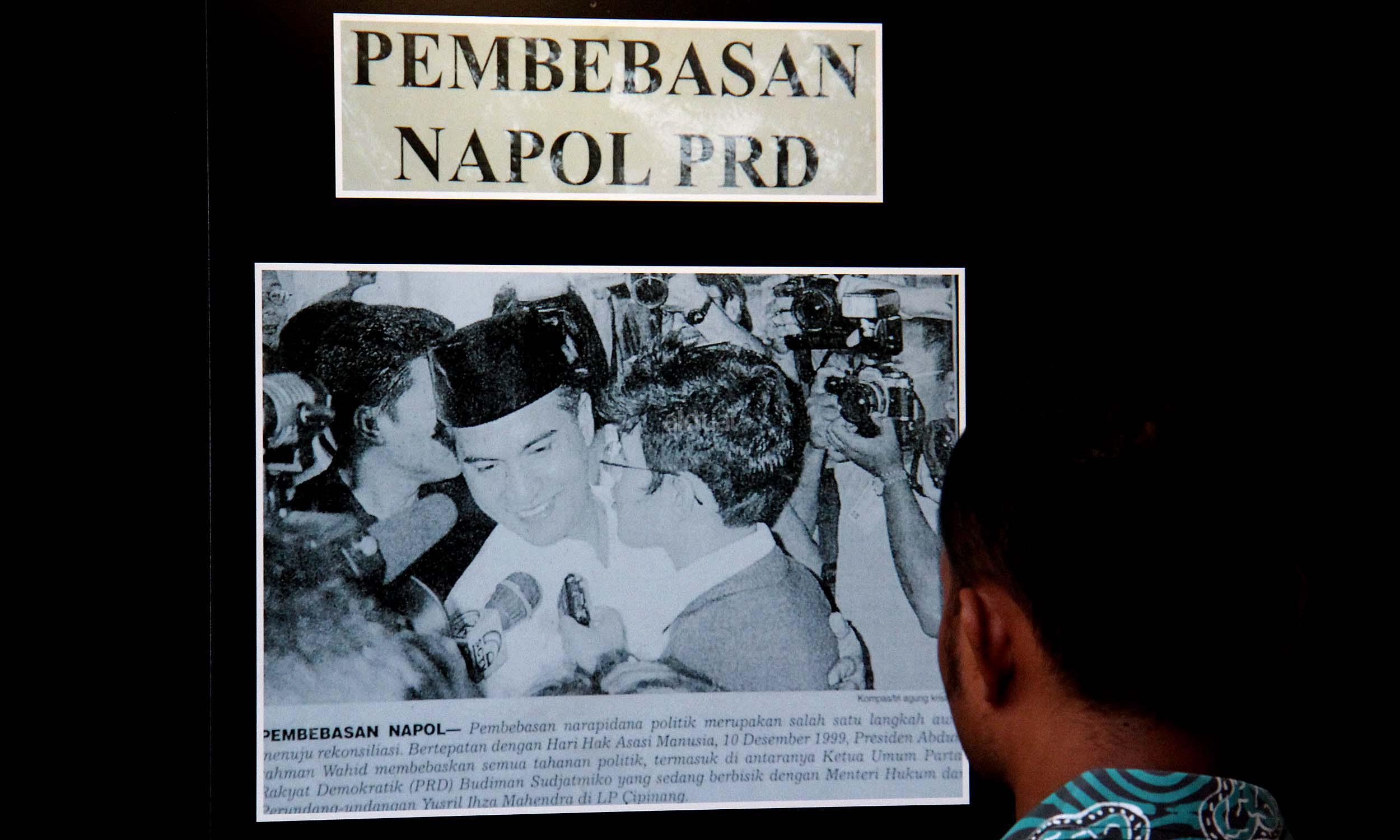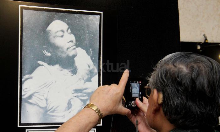 Seorang pengunjung memotret foto Muso salah satu tokoh Partai Komunis Indonesia (PKI) saat acara simposium Mengamankan Pancasila dari Ancaman Kebangkitan PKI dan Ideologi Lain di Balai Kartini, Jakarta, Rabu (1/6/2016). Selain acara simposium Mengamankan Pancasila dari Ancaman Kebangkitan PKI dan Ideologi Lain ada pameran foto yang dimana kekejaman PKI dan pemberontakan PKI di masa lalu.