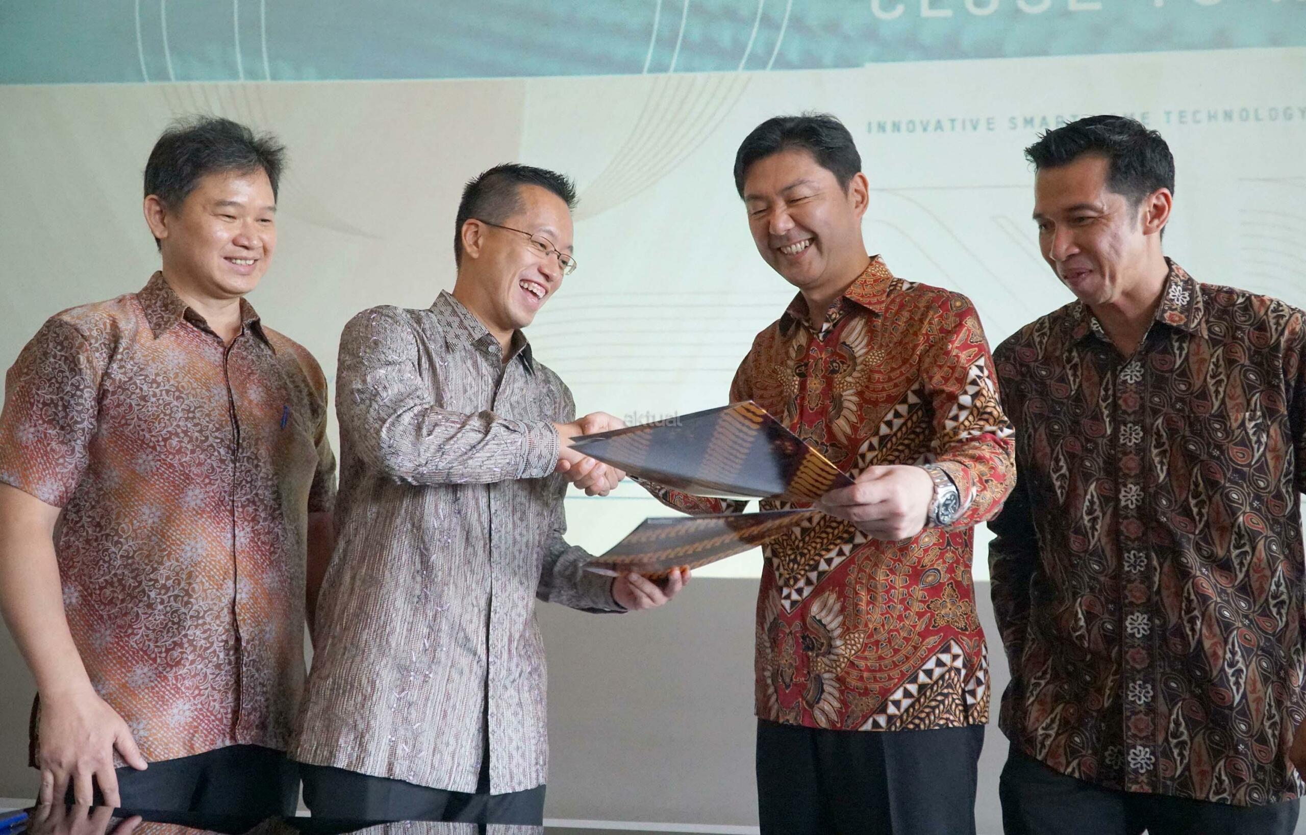 (dari kiri ke kanan) Direktur Keuangan PT Intiland Development Tbk, Ricky Holil, Executive Director Intiland Development,Utama Gondokusumo, Presiden Direktur Panasonic Gobel Indonesia, Hiroyoshi Suga, Corporate Proyek Manager Panasonic Indonesia, Ari Syarif melakukan penandatangan nota kesepahaman kerjasama atau MOU untuk mewujudkan konsep smart community di kawasan perumahan Serenia Hills, Jakarta Selatan, senin (24/7). Smart Community adalah sebuah konsep gagasan pengembangan sebuah kawasan hunian yang mengedepankan aspek pendayagunaan piranti dan infrastruktur teknologi yang dapat meningkatkan kenyamanan, keamanan, dan kemudahan serta ramah lingkungan ,hemat energi dan kemudahan akses berbasis mobile internet bagi penghuninya. Dalam kerja sama ini Panasonic menyediakan sistem dan piranti teknologi untuk smart home solution serta network & surveillance system pada seluruh unit unit rumah di klaster Quantum yang merupakan pengembangan terbaru di kawasan perumahan Serenia Hills.Serenia Hills merupakan sebuah kawasan perumahan seluas 26 hektar di jakarta selatan dan sudah mulai dikembangkan sejak tahun 2011. AKTUAL/Eko S Hilman