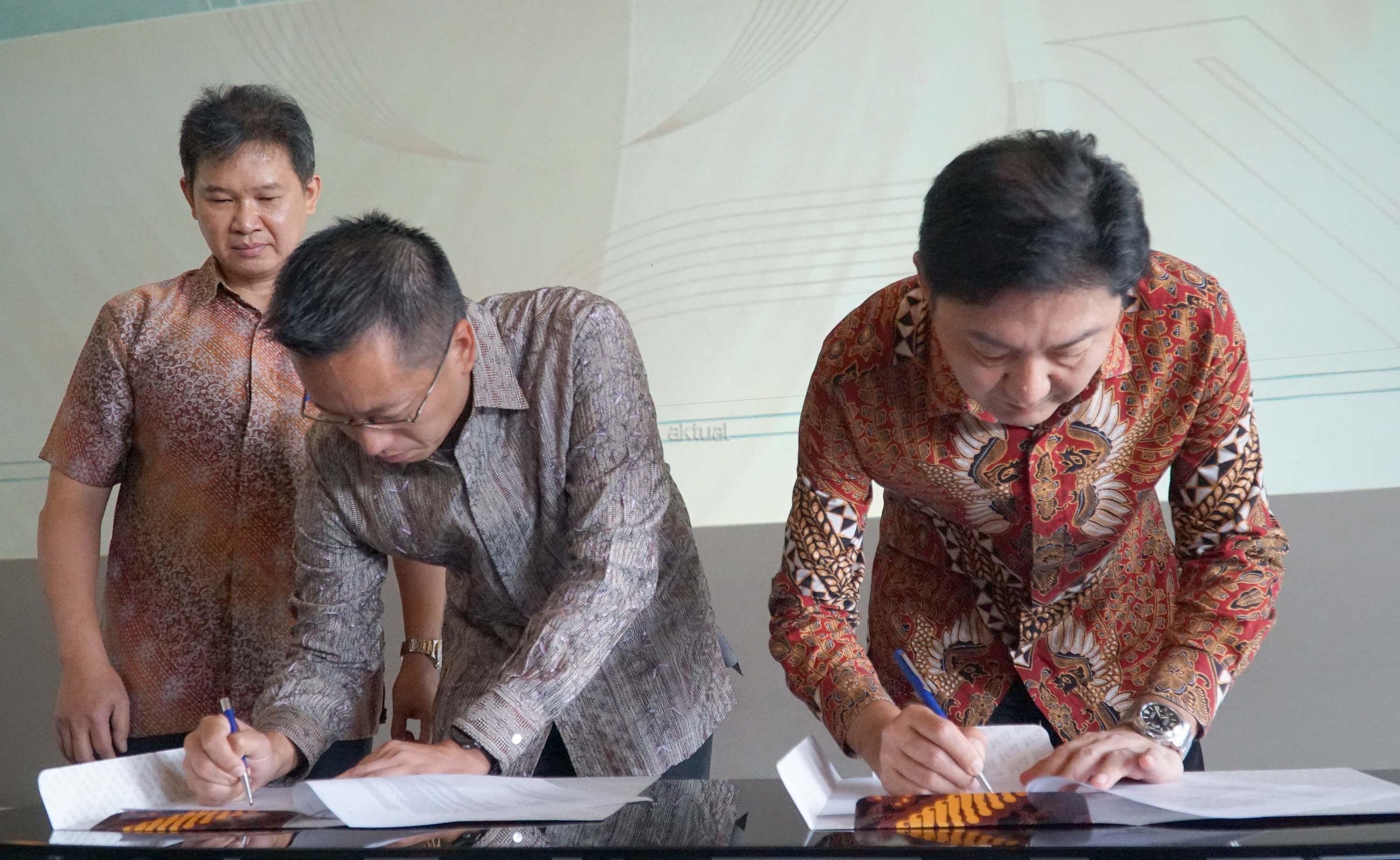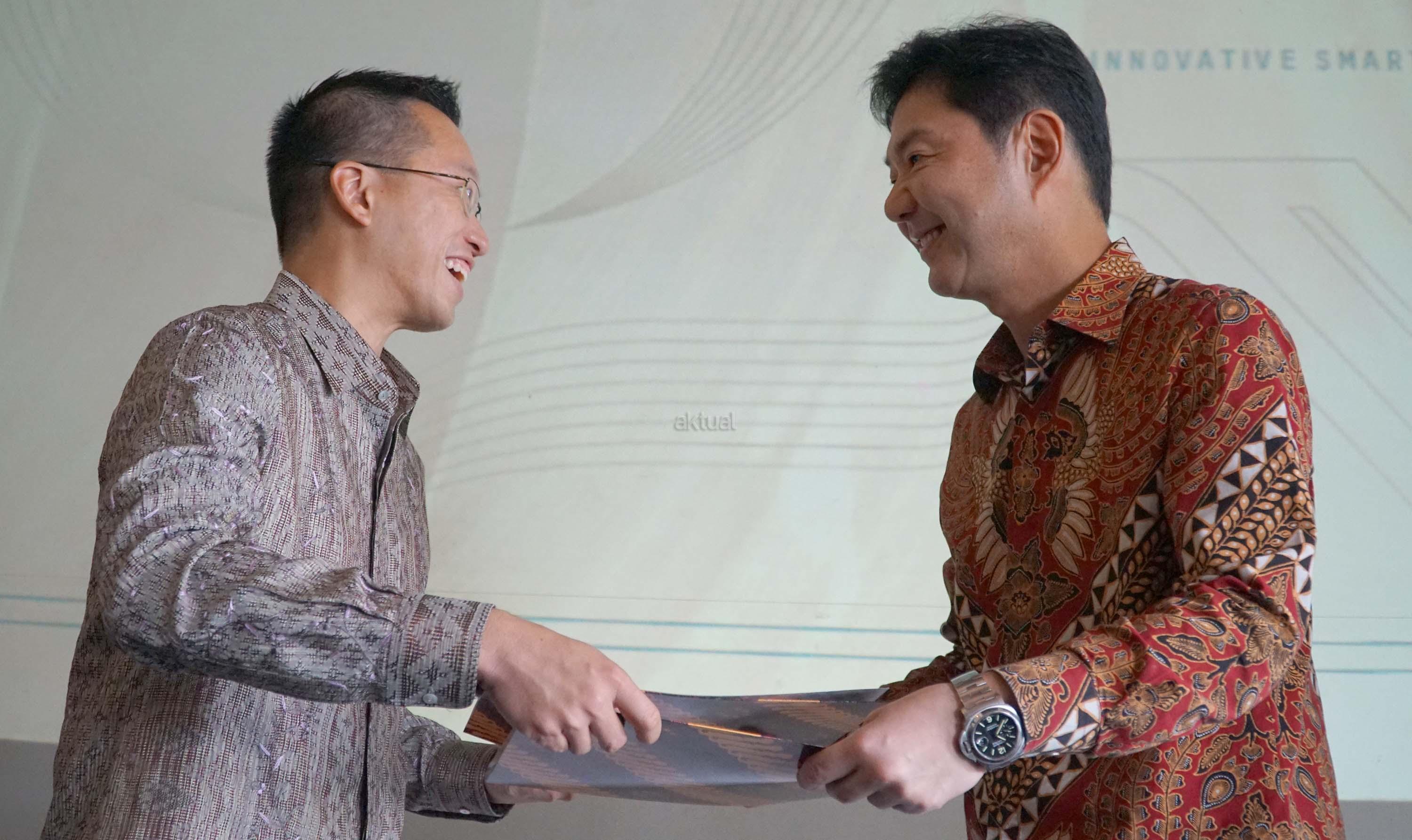 Executive Director Intiland Development,Utama Gondokusumo (kiri) dan Presiden Direktur Panasonic Gobel Indonesia, Hiroyoshi Suga saling tukar naskah nota kesepahaman kerjasama atau MOU untuk mewujudkan konsep smart community di kawasan perumahan Serenia Hills, Jakarta Selatan, senin (24/7). Smart Community adalah sebuah konsep gagasan pengembangan sebuah kawasan hunian yang mengedepankan aspek pendayagunaan piranti dan infrastruktur teknologi yang dapat meningkatkan kenyamanan, keamanan, dan kemudahan serta ramah lingkungan ,hemat energi dan kemudahan akses berbasis mobile internet bagi penghuninya. Dalam kerja sama ini Panasonic menyediakan sistem dan piranti teknologi untuk smart home solution serta network & surveillance system pada seluruh unit unit rumah di klaster Quantum yang merupakan pengembangan terbaru di kawasan perumahan Serenia Hills.Serenia Hills merupakan sebuah kawasan perumahan seluas 26 hektar di jakarta selatan dan sudah mulai dikembangkan sejak tahun 2011. AKTUAL/Eko S Hilman