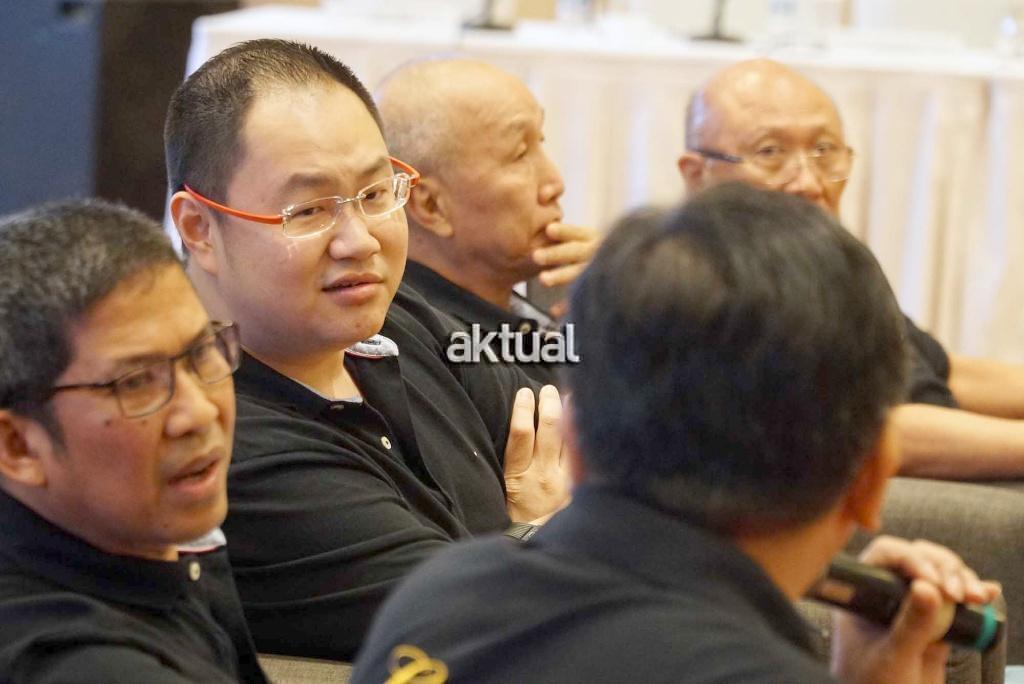 Presdir PT Panca Mitra Multiperdana Tbk Martinus Soesilo (tengah) dan Wakil Presdir Hirawan Tedjokoesoemo (kedua kiri) berbincang dengan Direktur Alin Rostanti (kiri), Direktur Johan Suryadarma dan Direktur Patrick Djuanda, usai Penawaran Umum Perdana Saham, di Jakarta, Senin (7/5). Panca Mitra Multiperdana, produsen dan eksportir udang olahan, menawarkan sebanyak-banyaknya 857.142.800 saham baru atau sebanyak-banyaknya 30% dari modal ditempatkan dan disetor penuh Perseroan melalui Penawaran Umum Perdana Saham (Initial Public Offering/IPO). AKTUAL/Eko S Hilman