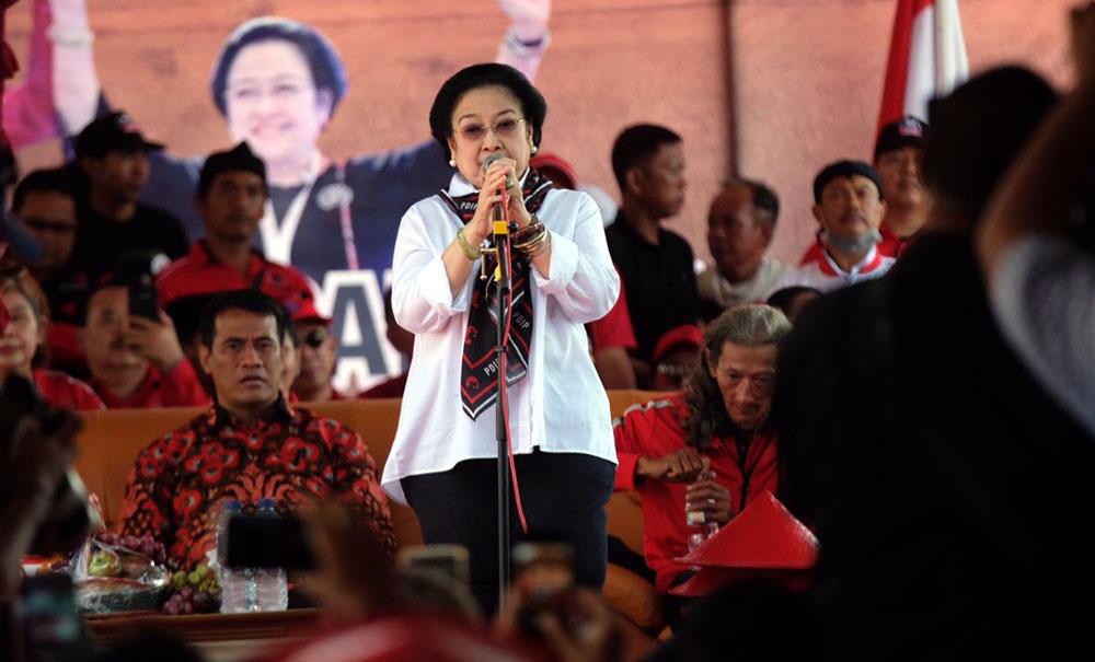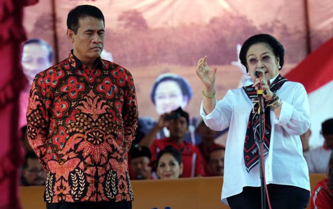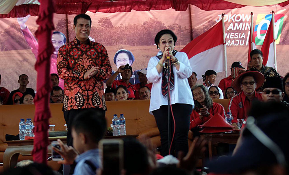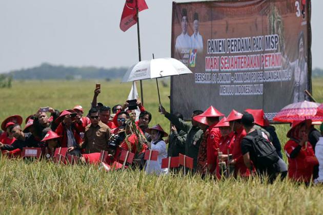 Ketua Umum Partai Demokrasi Indonesia Perjuangan (PDIP) Megawati Seokarnoputri didampingi Menteri Pertanian Amran Sulaiman dan Sekjen PDIP Hasto Kristiyanto saat melakukan panen raya padi MSP yang merupakan hasil persilangan bibit pac lokal temuan peneliti Surono Danua Di Desa Majakerta, Kecamatan Balongan, Indramayu, Jawa Barat, Kamis (4/4/2019). AKTUAL/HO