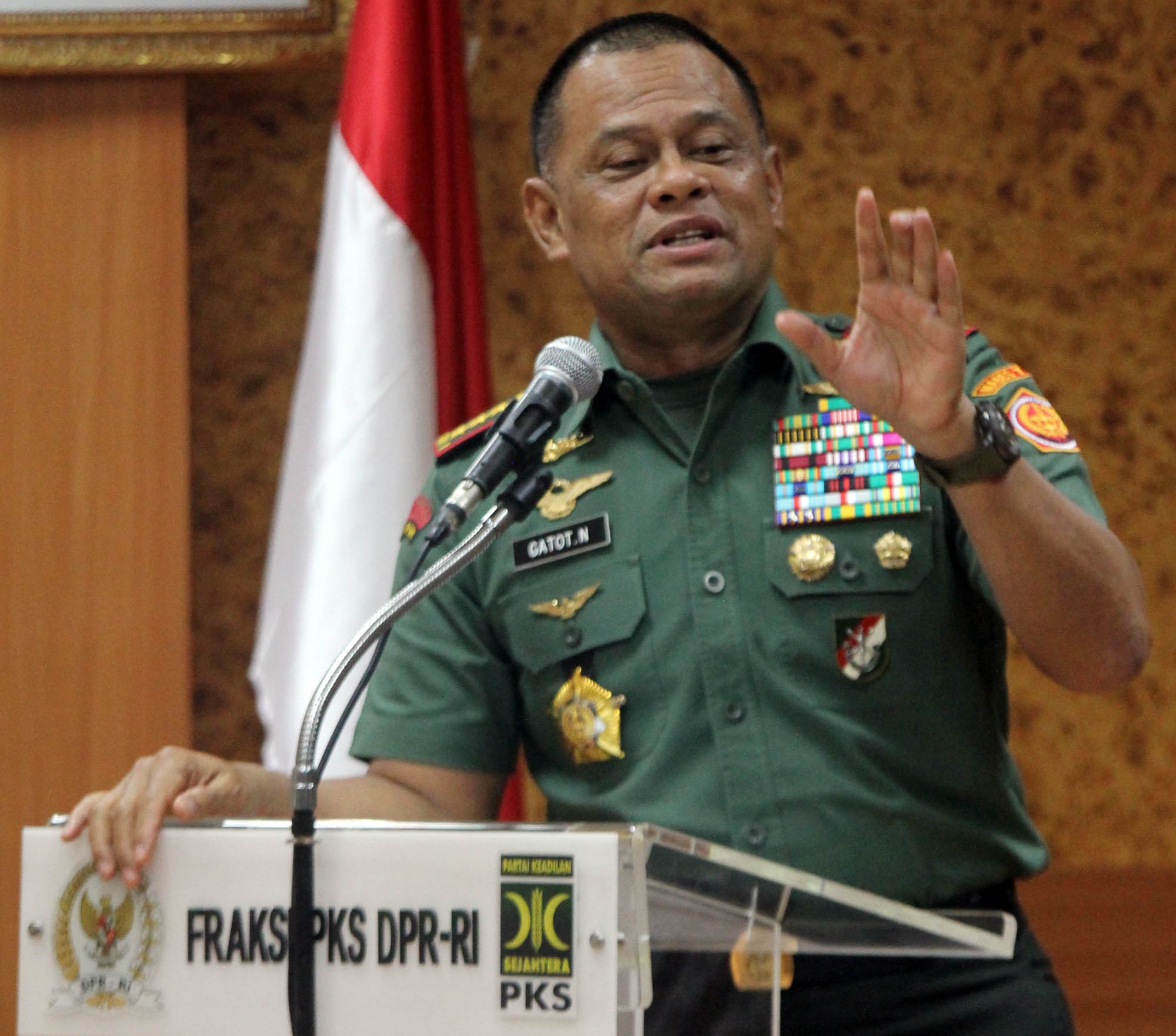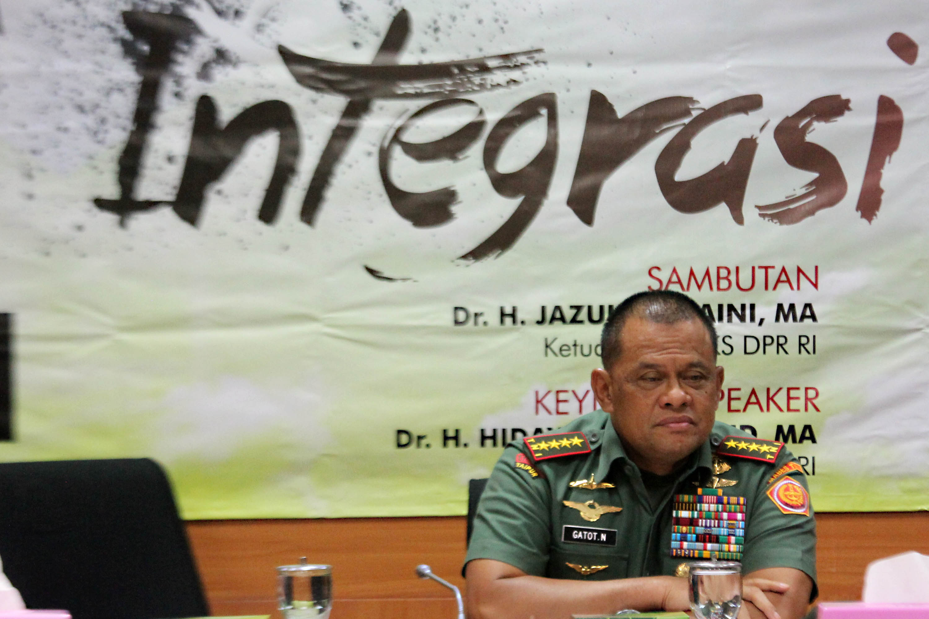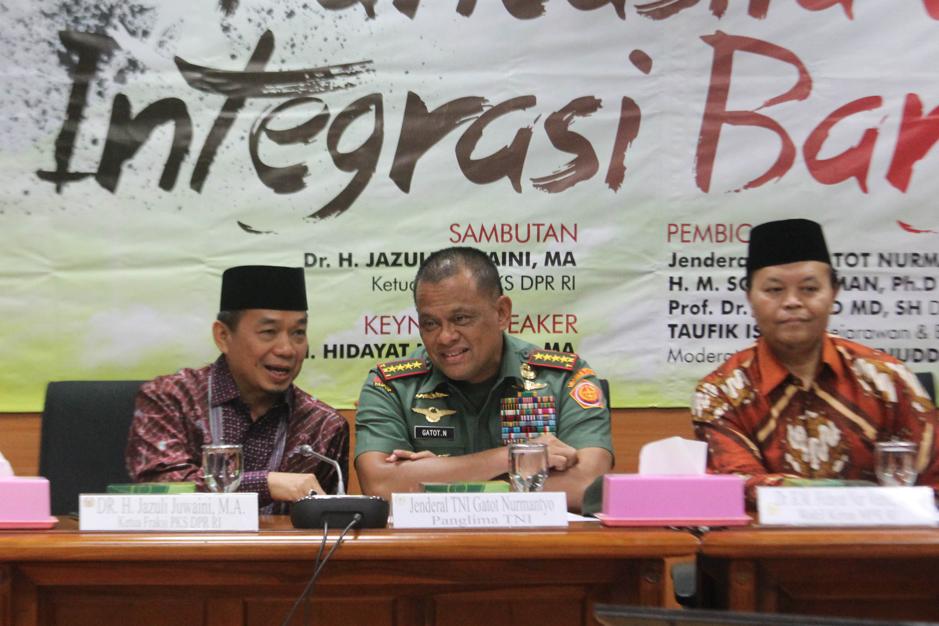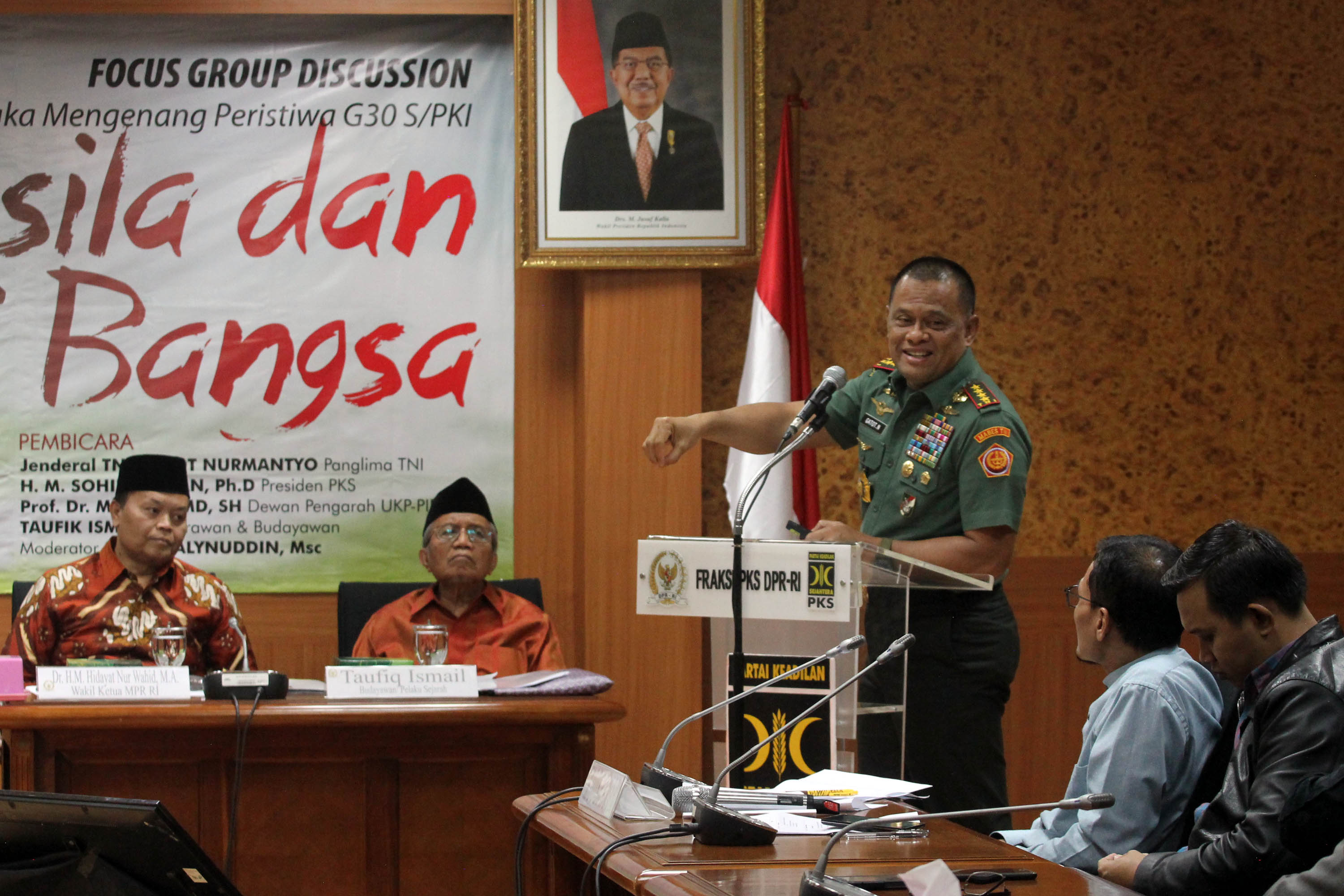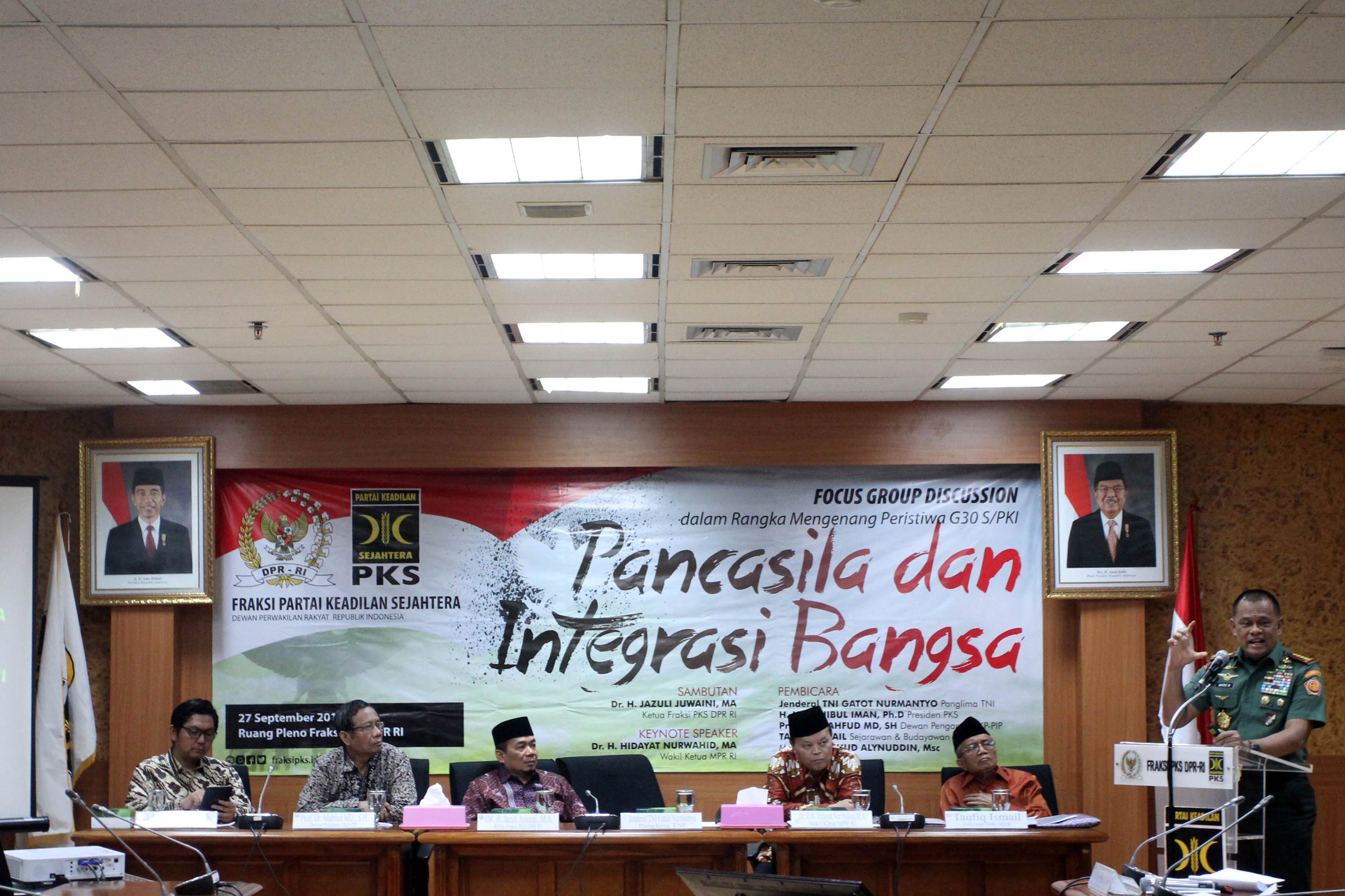 Panglima TNI Jenderal Gatot Nurmantyo, berbicara dalam Focus Group Discusion (FGD) menyoal kondisi Sosial Politik, yang digelar oleh Fraksi PKS DPR di Gedung Nusantara I, Kompleks Parlemen Senayan, Jakarta, Rabu (27/9). Dalam FGD yang mengangkat tema “Pancasila dan Integrasi Bangsa”, tersebut, Panglima memaparkan bagaimana Pancasila menjadi dasar negara yang telah dipikirkan oleh para pendiri Bangsa sehingga tetap bertahan menjadi pemersatu bangsa Indonesia yang memiliki keragamana Suku, Bangsa, Adat, Bahasa yang terbentang dalam ribuan pulang dari Saban sampai Merauke dan nilai tersebut harus dilindungi dari paham apapun agar kita tidak mudah terpecah. AKTUAL/Tino Oktaviano
