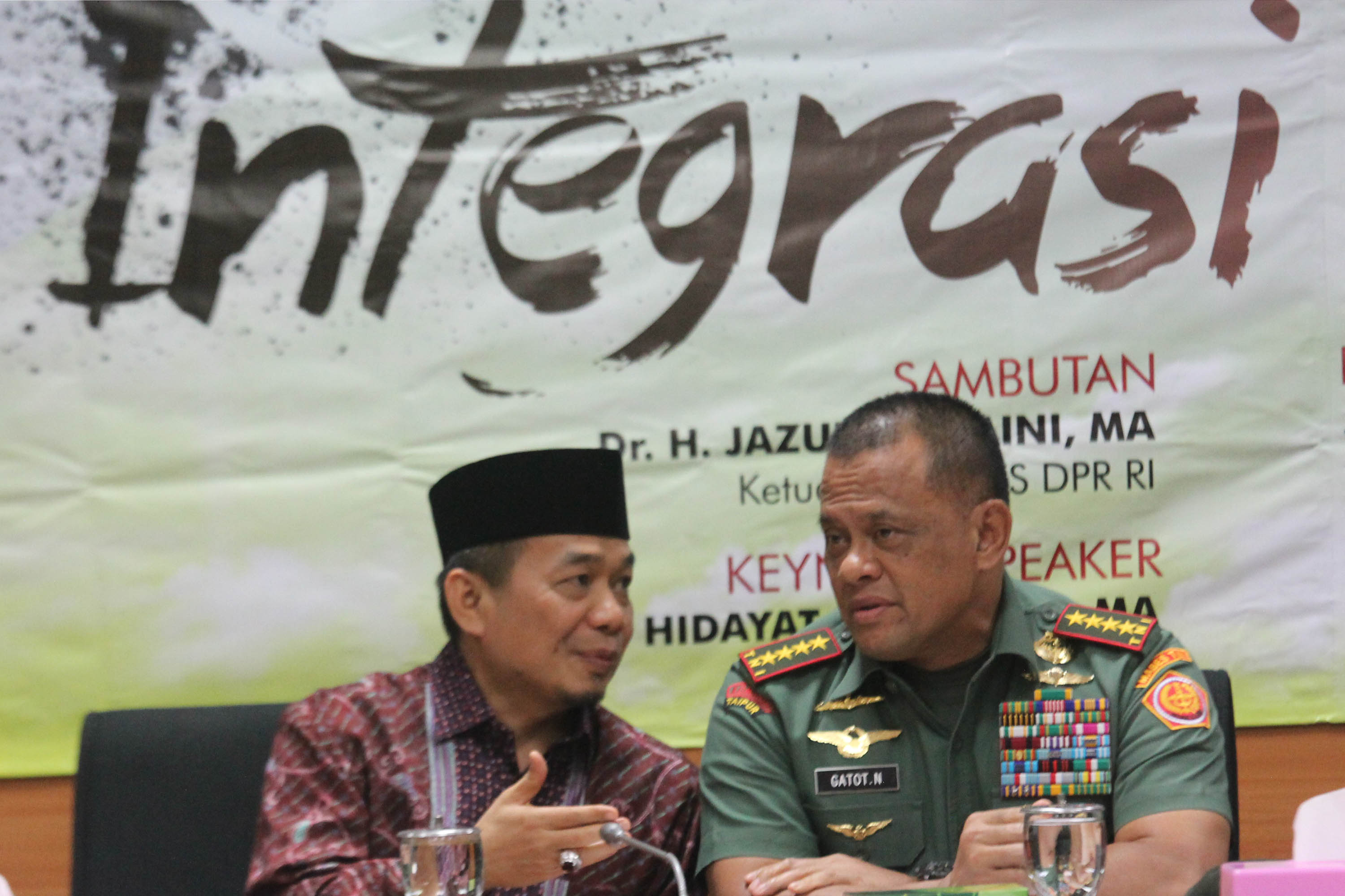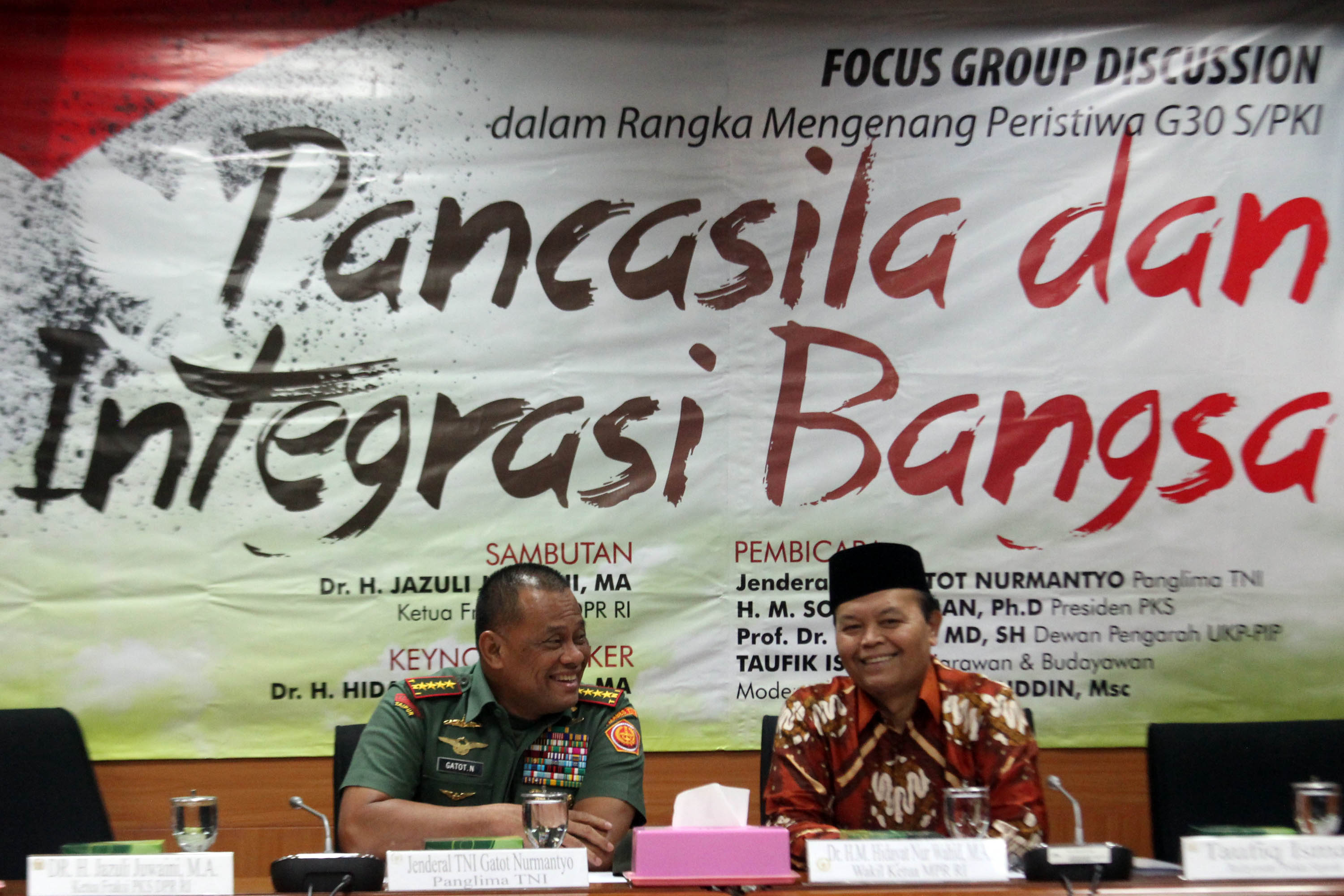 Panglima TNI Jenderal Gatot Nurmantyo (kiri) dan Wakil Ketua DPR Hidayat Nur Wahid, hadir dalam Focus Group Discusion (FGD) menyoal kondisi Sosial Politik, yang digelar oleh Fraksi PKS DPR di Gedung Nusantara I, Kompleks Parlemen Senayan, Jakarta, Rabu (27/9). Dalam FGD yang mengangkat tema “Pancasila dan Integrasi Bangsa”, tersebut, Panglima memaparkan bagaimana Pancasila menjadi dasar negara yang telah dipikirkan oleh para pendiri Bangsa sehingga tetap bertahan menjadi pemersatu bangsa Indonesia yang memiliki keragamana Suku, Bangsa, Adat, Bahasa yang terbentang dalam ribuan pulang dari Saban sampai Merauke dan nilai tersebut harus dilindungi dari paham apapun agar kita tidak mudah terpecah. AKTUAL/Tino Oktaviano