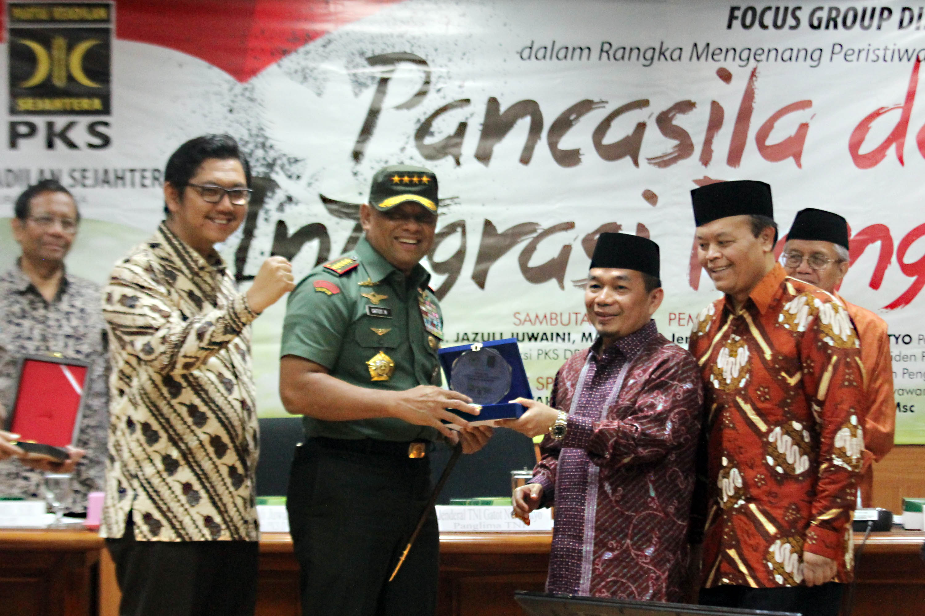 Panglima TNI Jenderal Gatot Nurmantyo (ketiga dari kiri) menerima cinderamata dari Ketua Fraksi PKS Jazuli Juwani (ketiga dari kanan) didampingi Wakil Ketua DPR Hidayat Nur Wahid (kedau dari kanan), Sekjen DPP PKS Mustafa Kamal (kiri), hadir Dewan Pengarah Unit Kerja Presiden Pembinaan Ideologi Pancasila (UKP PIP) Mahfud MD (kiri) dan Budayawan Taufik Ismail (kanan), saat berbicara dalam Focus Group Discusion (FGD) menyoal kondisi Sosial Politik, yang digelar oleh Fraksi PKS DPR di Gedung Nusantara I, Kompleks Parlemen Senayan, Jakarta, Rabu (27/9). Dalam FGD yang mengangkat tema “Pancasila dan Integrasi Bangsa”, tersebut, Panglima memaparkan bagaimana Pancasila menjadi dasar negara yang telah dipikirkan oleh para pendiri Bangsa sehingga tetap bertahan menjadi pemersatu bangsa Indonesia yang memiliki keragamana Suku, Bangsa, Adat, Bahasa yang terbentang dalam ribuan pulang dari Saban sampai Merauke dan nilai tersebut harus dilindungi dari paham apapun agar kita tidak mudah terpecah. AKTUAL/Tino Oktaviano