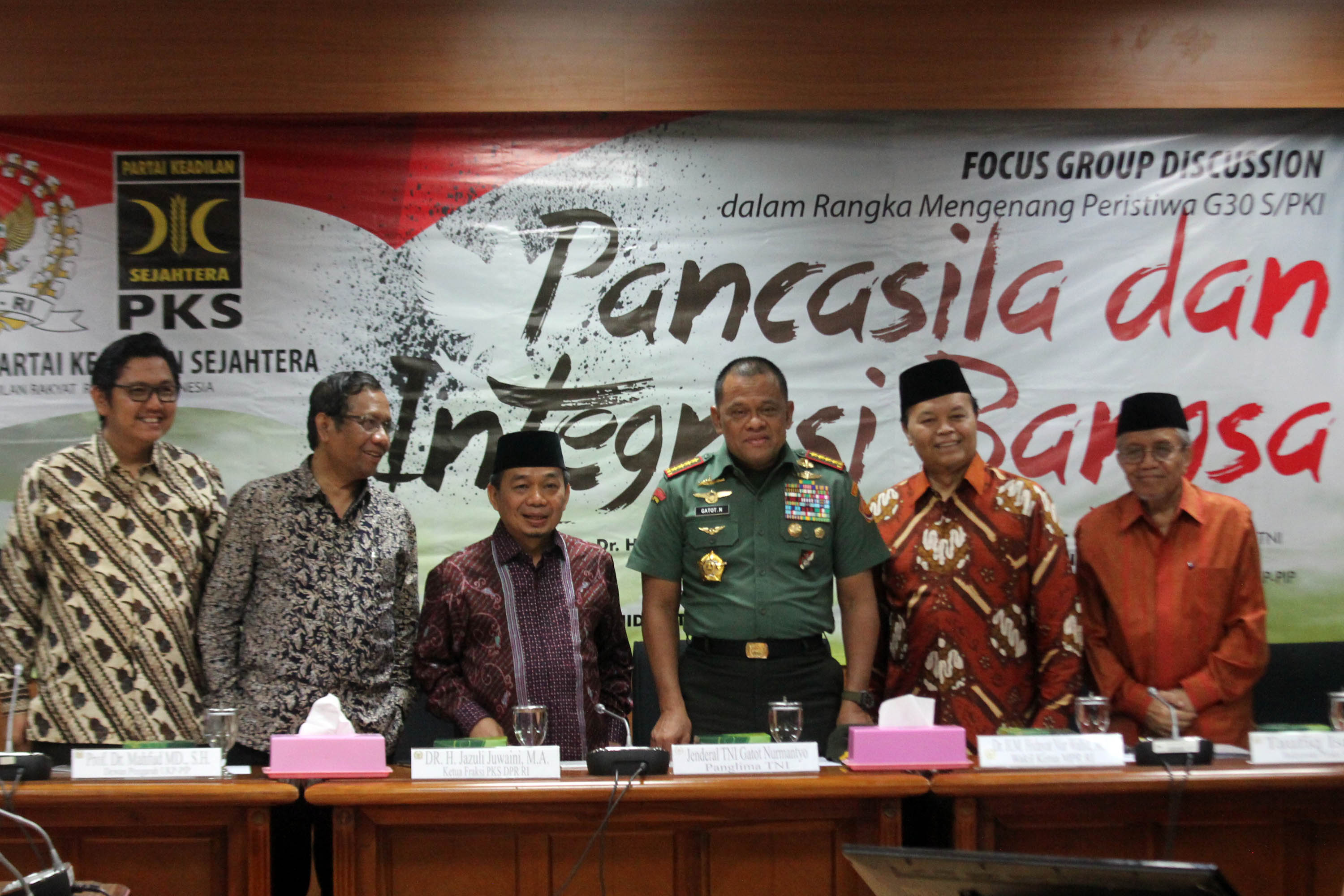Panglima TNI Jenderal Gatot Nurmantyo (ketiga dari kanan), bersama (dari kiri) Sekjen DPP PKS Mustafa Kamal, Dewan Pengarah Unit Kerja Presiden Pembinaan Ideologi Pancasila (UKP PIP) Mahfud MD, Ketua Fraksi PKS Jazuli Juwani, Wakil Ketua DPR Hidayat Nur Wahid dan Budayawan Taufik Ismail, berbicara dalam Focus Group Discusion (FGD) menyoal kondisi Sosial Politik, yang digelar oleh Fraksi PKS DPR di Gedung Nusantara I, Kompleks Parlemen Senayan, Jakarta, Rabu (27/9). Dalam FGD yang mengangkat tema “Pancasila dan Integrasi Bangsa”, tersebut, Panglima memaparkan bagaimana Pancasila menjadi dasar negara yang telah dipikirkan oleh para pendiri Bangsa sehingga tetap bertahan menjadi pemersatu bangsa Indonesia yang memiliki keragamana Suku, Bangsa, Adat, Bahasa yang terbentang dalam ribuan pulang dari Saban sampai Merauke dan nilai tersebut harus dilindungi dari paham apapun agar kita tidak mudah terpecah. AKTUAL/Tino Oktaviano