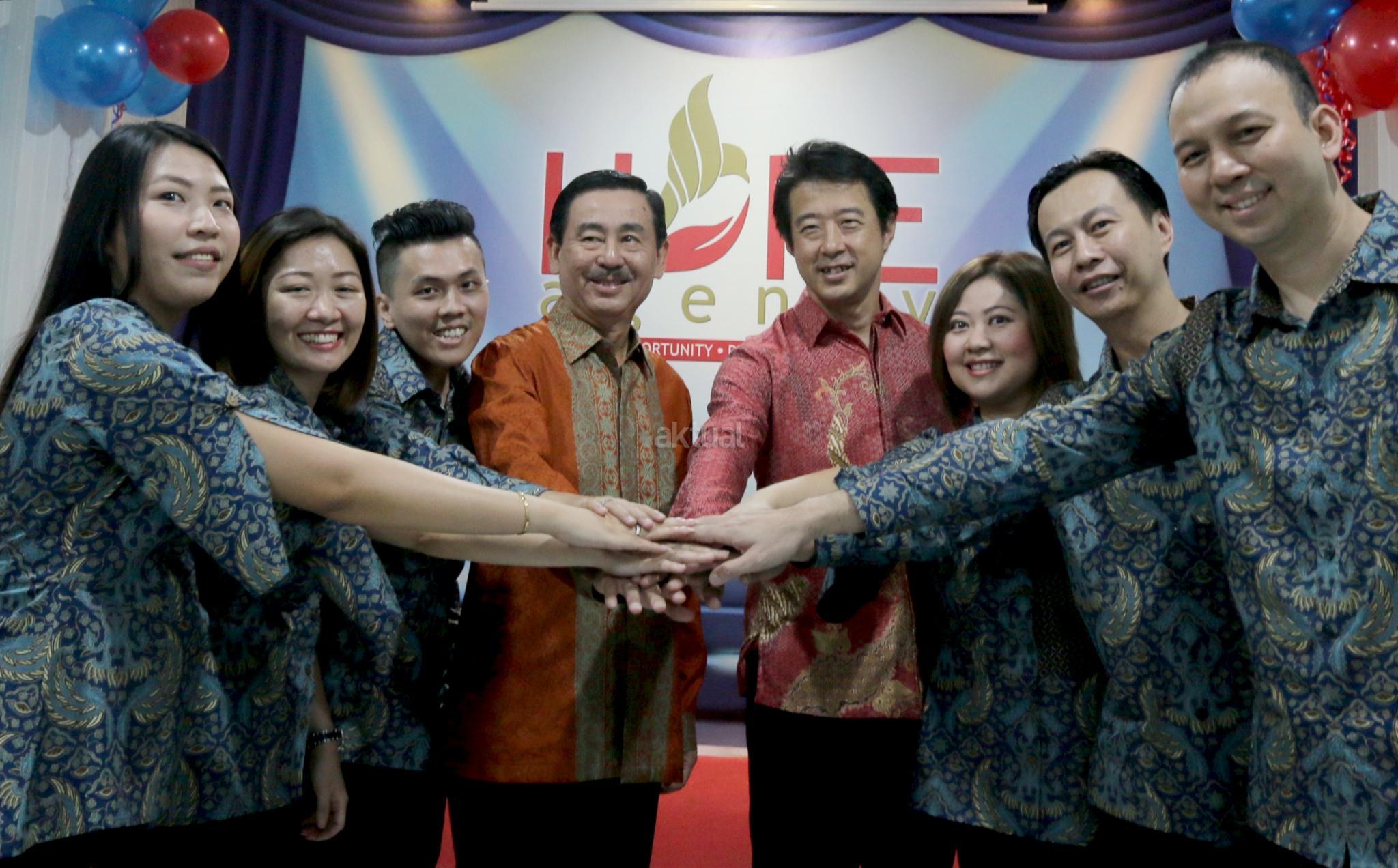 Presiden Direktur Panin Dai-ichi Life Fadjar Gunawan bersama Wakil Presiden Direktur Koichi Nishiyama dan Business Partner, Owner of GA HOPE, Widi Sujarwo serta tim bertumpuk tangan usai meresemikan kantor general agency HOPE (GA HOPE) di Jakarta, Sabtu (17/11/2018). GA Hope yang berlokasi di Jalan Pangeran Tubagus Angke No. 6, Petamburan, Jakarta Barat ini merupakan "kantor pemasaran" Panin Dai-ichi Life yang beroperasi secara independen. Hadirnya jaringan pemasaran Panin Dai-ichi Life yang semakin luas di wilayah jabodetabek diharapkan dapat meyerap lebih banyak tenaga kerja. AKTUAL/Tino Oktaviano