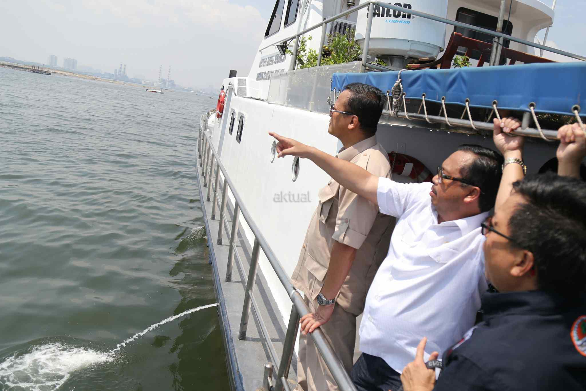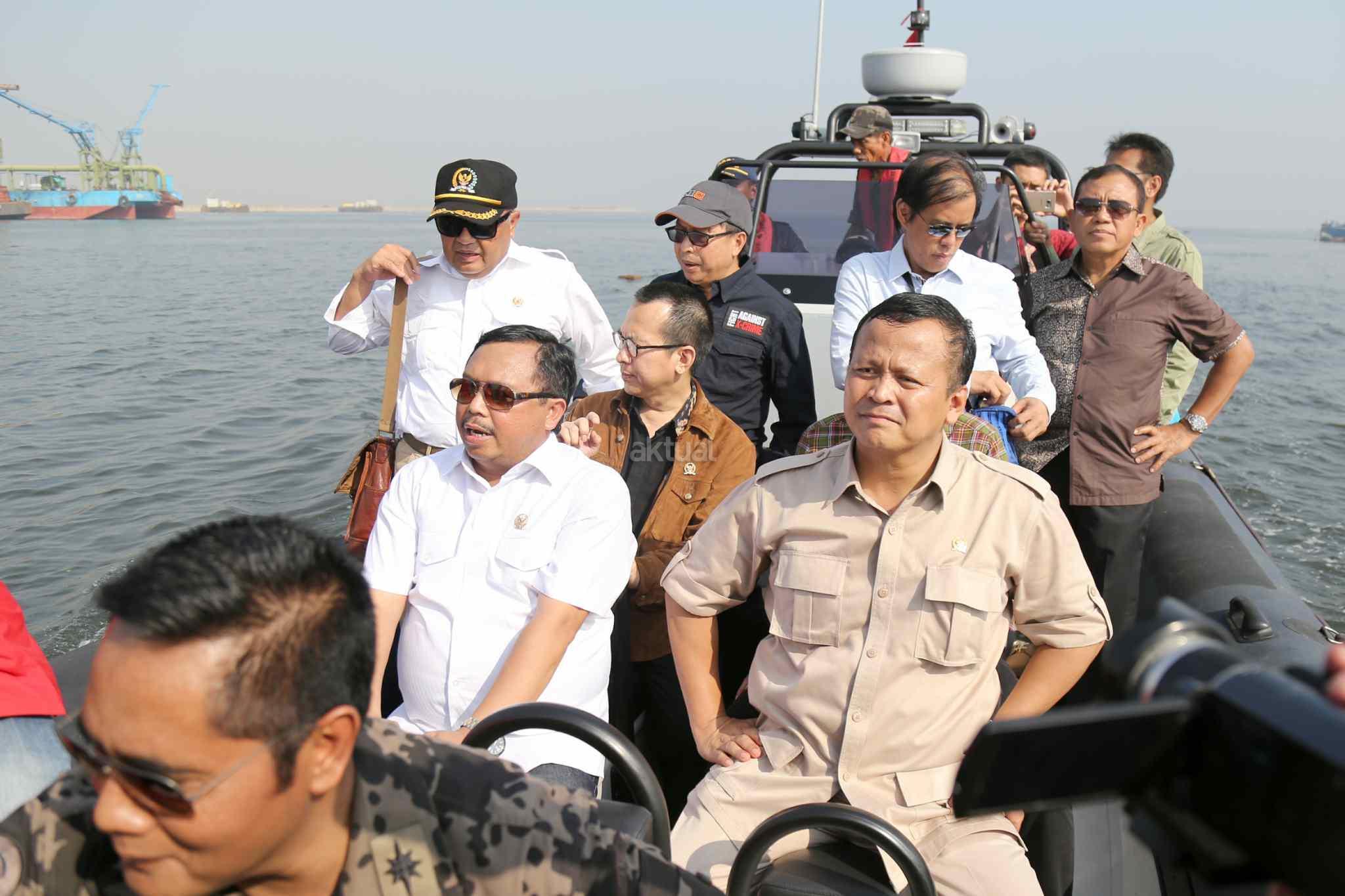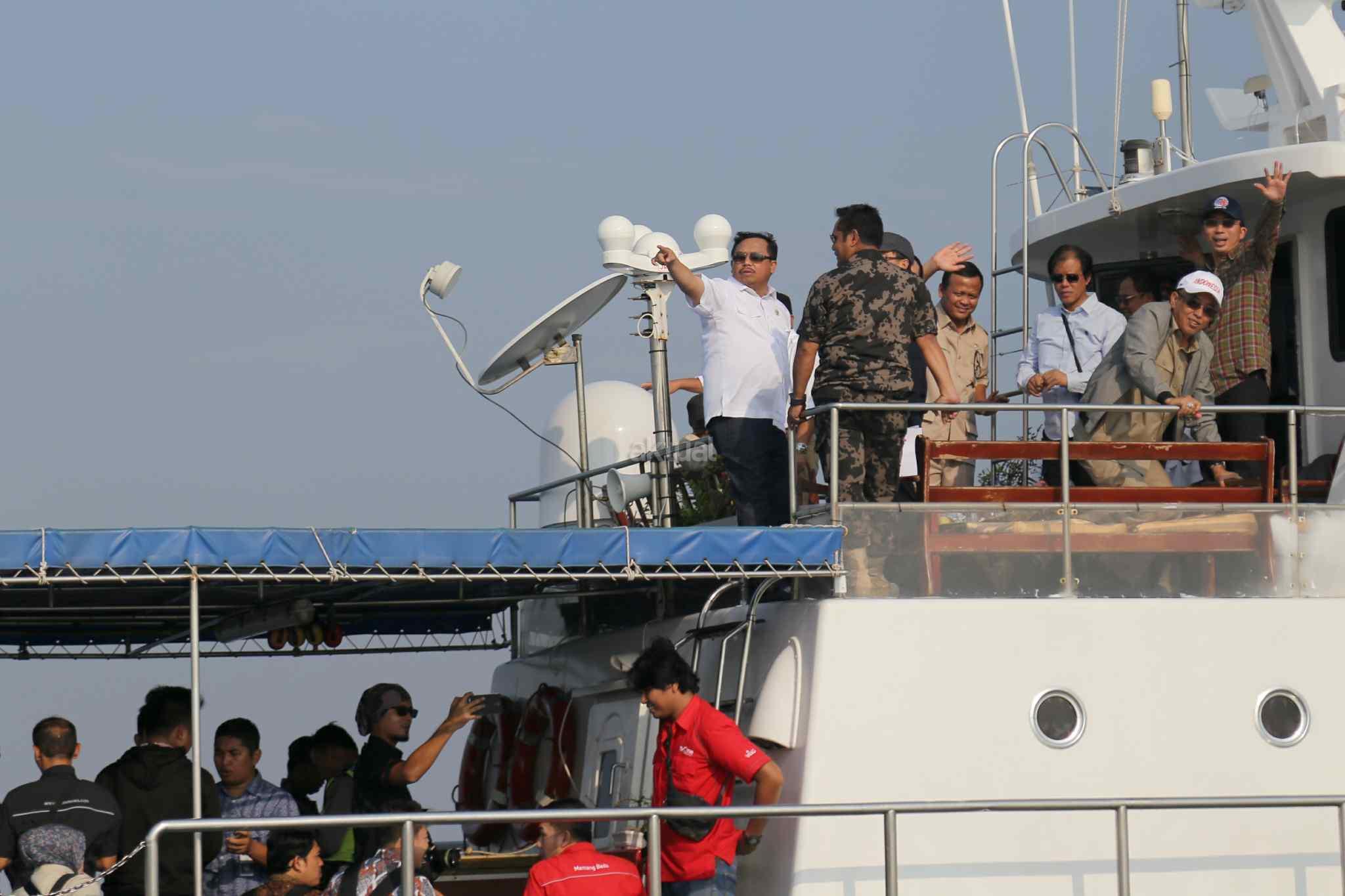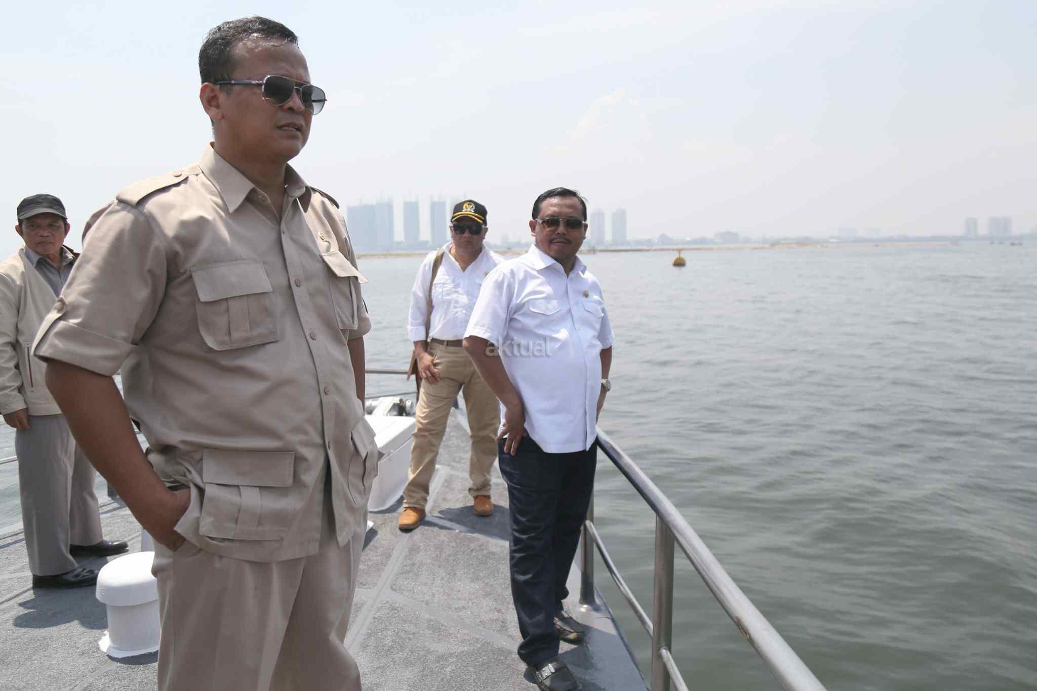 Ketua Komisi IV DPR RI Edhy Prabowo didampingi Wakil Ketua Komisi IV Herman Kheron dan Anggota lainnya meninjau pulau reklamasi di Teluk Jakarta, Jumat (24/3). Peninjauan ini sebagai bentuk kerja Komisi IV DPR RI yang telah membentuk panita kerja (Panja) reklamasi teluk Jakarta, untuk mengawasi agar tidak ada peraturan yang dilanggar dalam proyek tersebut juga bencana sosial dan lingkungan. AKTUAL/Tino Oktaviano