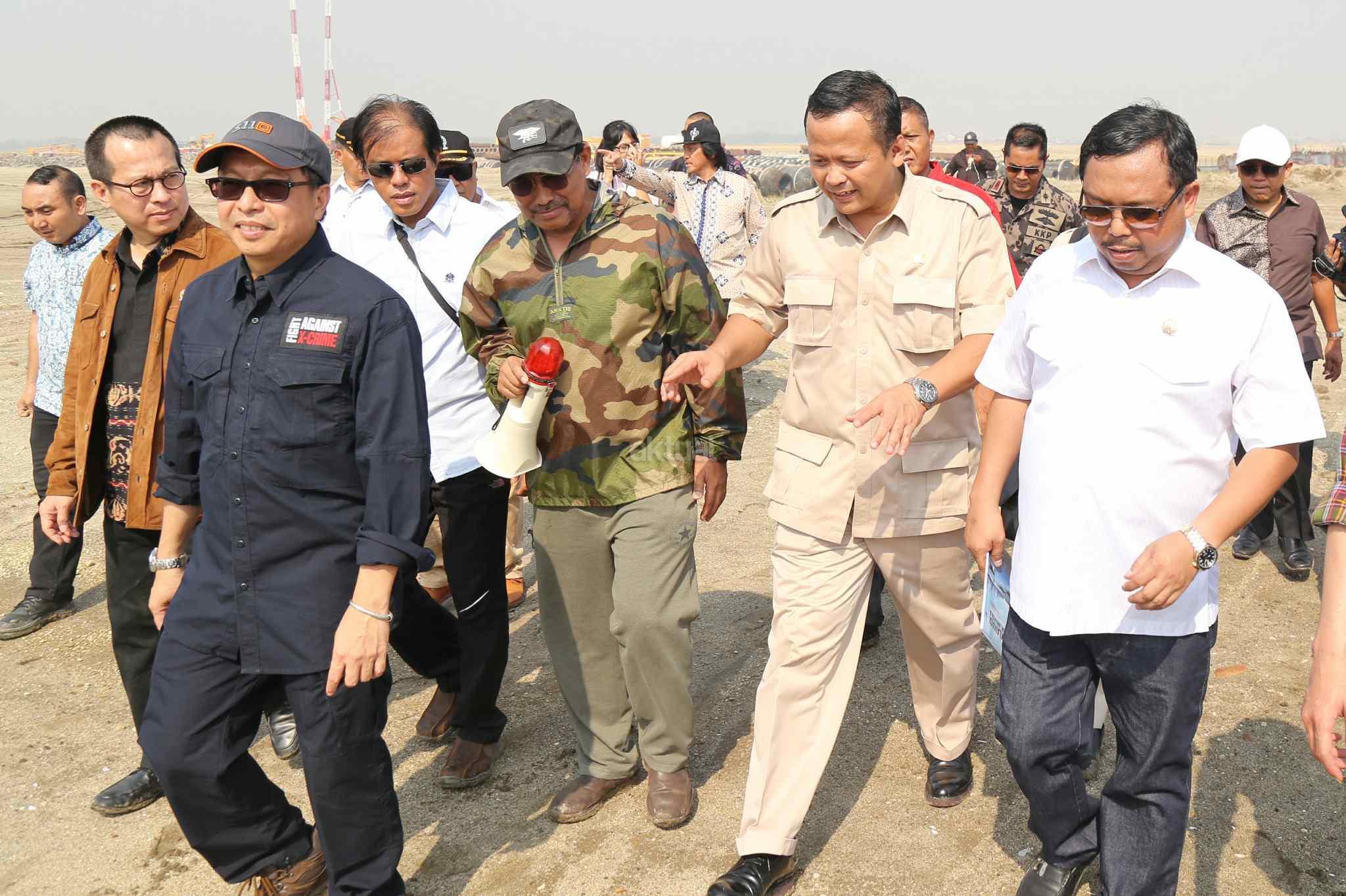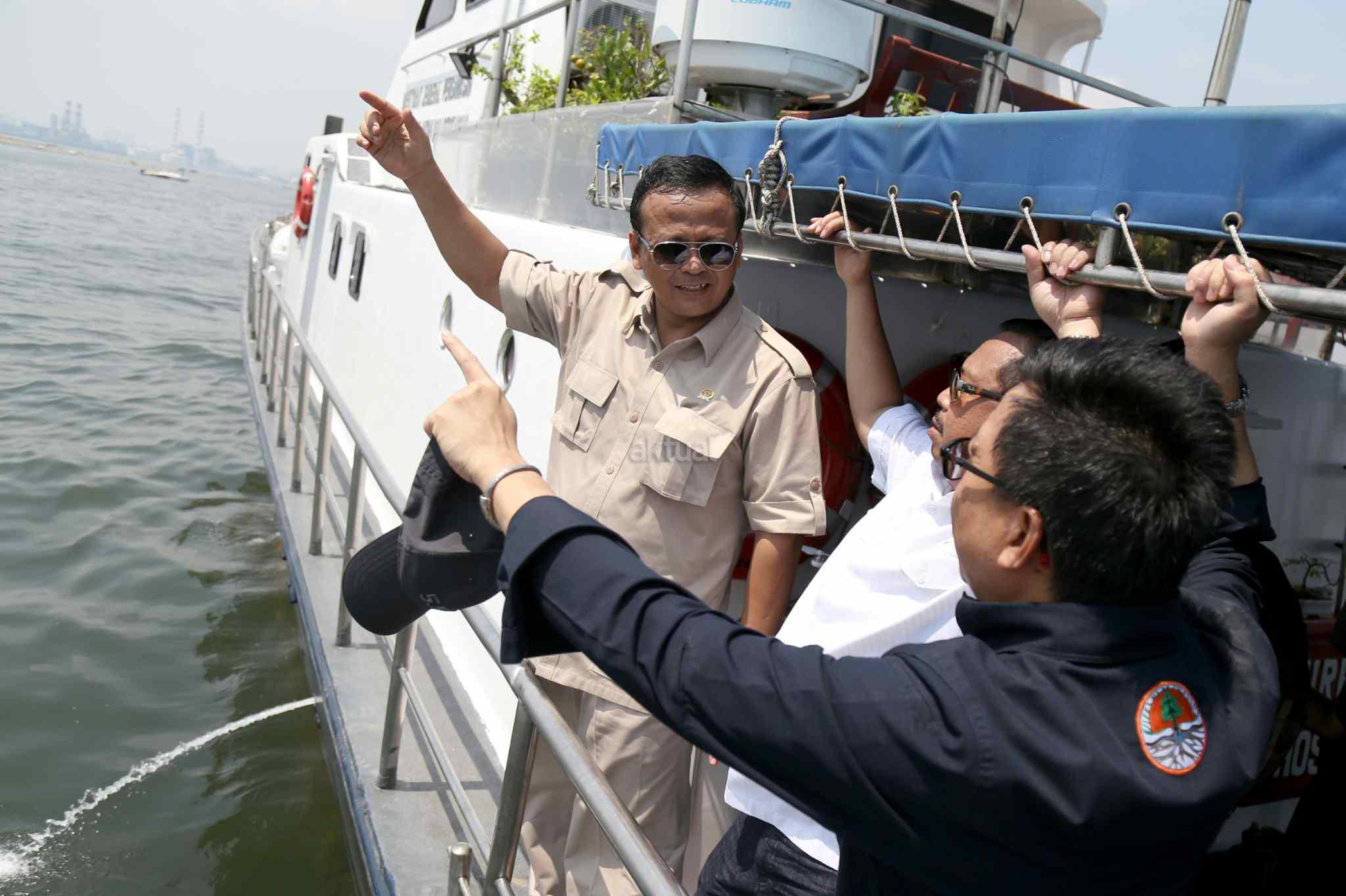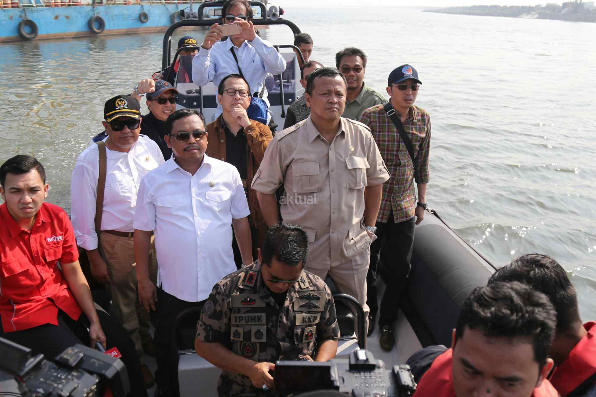 Ketua Komisi IV DPR RI Edhy Prabowo didampingi Wakil Ketua Komisi IV Herman Kheron dan Anggota lainnya meninjau pulau reklamasi di Teluk Jakarta, Jumat (24/3). Peninjauan ini sebagai bentuk kerja Komisi IV DPR RI yang telah membentuk panita kerja (Panja) reklamasi teluk Jakarta, untuk mengawasi agar tidak ada peraturan yang dilanggar dalam proyek tersebut juga bencana sosial dan lingkungan. AKTUAL/Tino Oktaviano