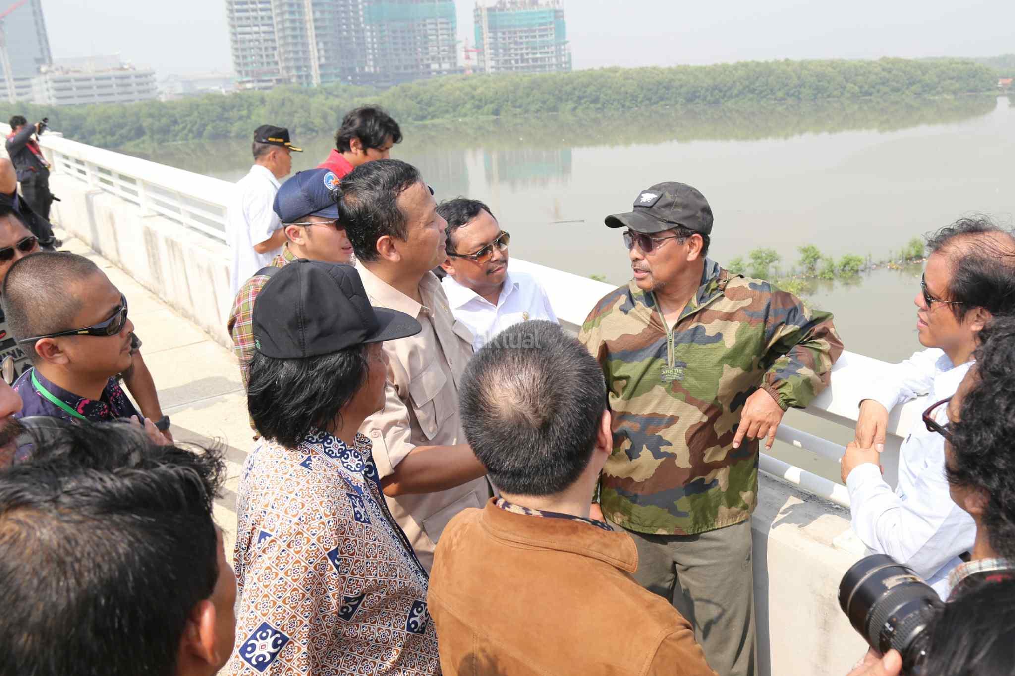 Ketua Komisi IV DPR RI Edhy Prabowo didampingi Wakil Ketua Komisi IV Herman Kheron mendapat penjelasan dari Presiden Direktur PT Kapuk Naga Indah Nono Sampono seputar pulau D yang direklamasi di Teluk Jakarta, Jumat (24/3). Peninjauan ini sebagai bentuk kerja Komisi IV DPR RI yang telah membentuk panita kerja (Panja) reklamasi teluk Jakarta, untuk mengawasi agar tidak ada peraturan yang dilanggar dalam proyek tersebut juga bencana sosial dan lingkungan. AKTUAL/Tino Oktaviano