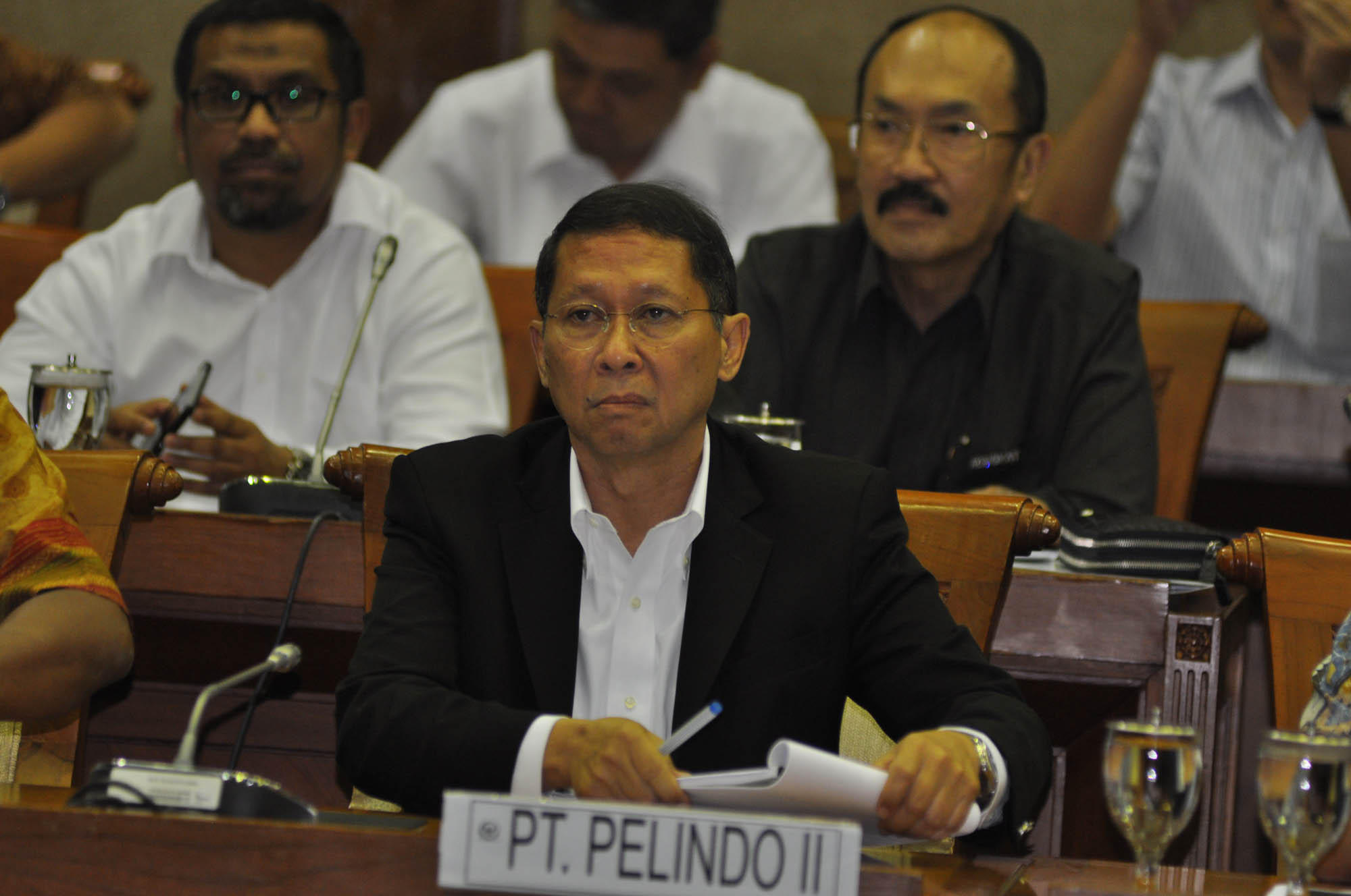 Dirut Pelindo II RJ Lino (tengah) bersama Deputi Bidang Usaha Konstruksi dan Sarana dan Prasarana Perhubungan Kementerian BUMN Pontas Tambunan mengikuti rapat dengan panitia kerja (Panja) Pelindo II Komisi VI DPR di Kompleks Parlemen, Senayan, Jakarta, Rabu (16/9/2015). Rapat itu membahas perkembangan kasus hukum dugaan korupsi crane di Pelindo II.