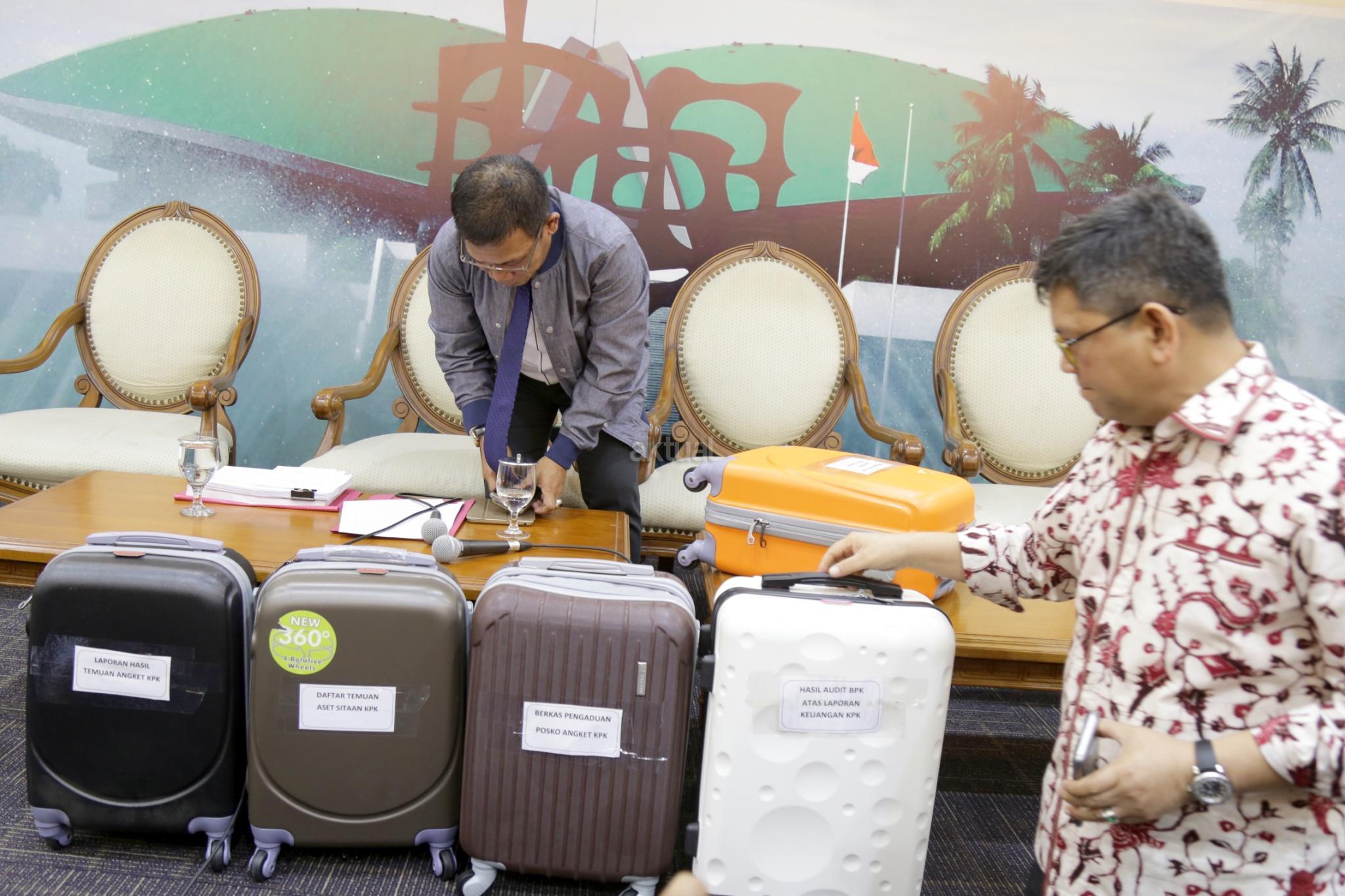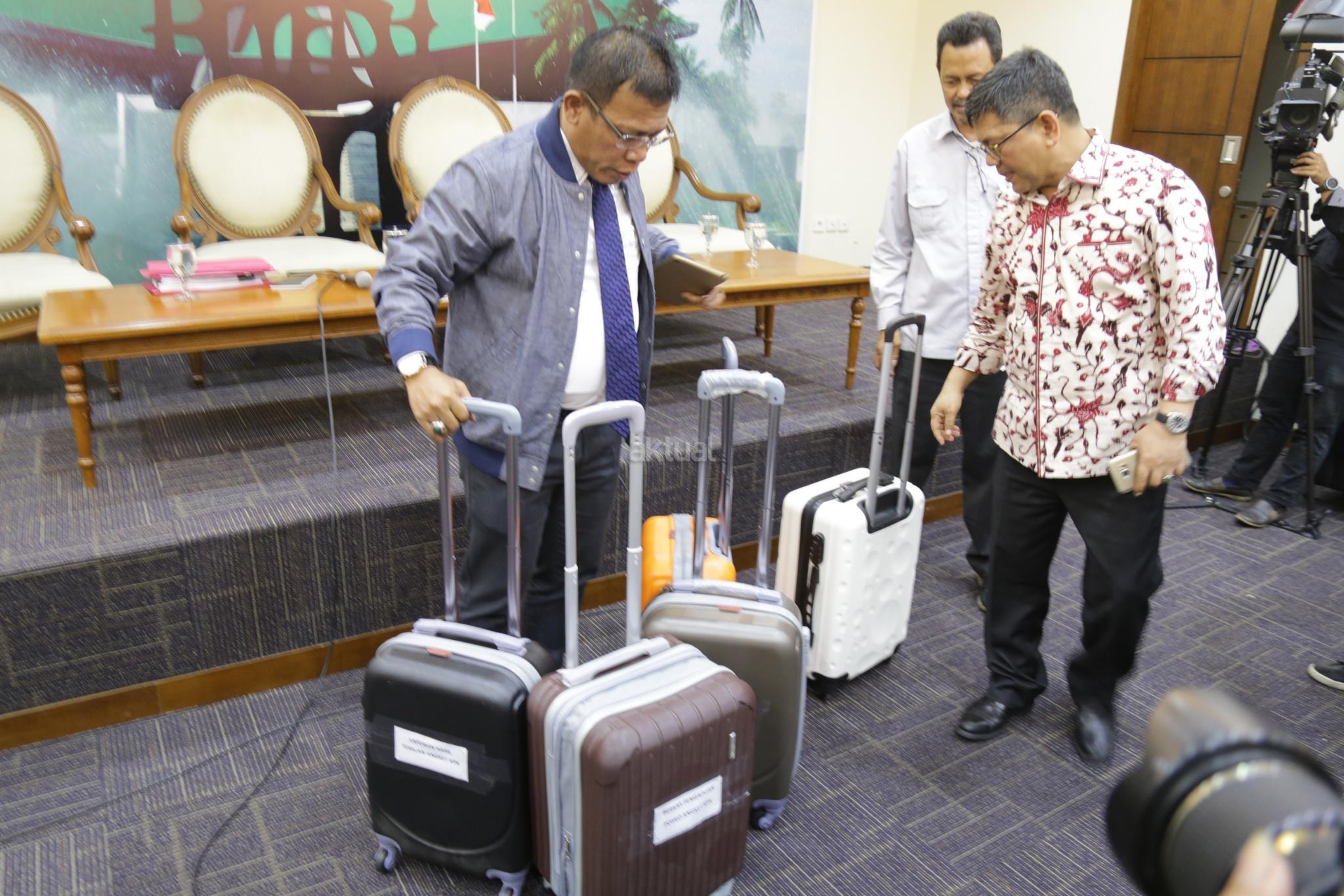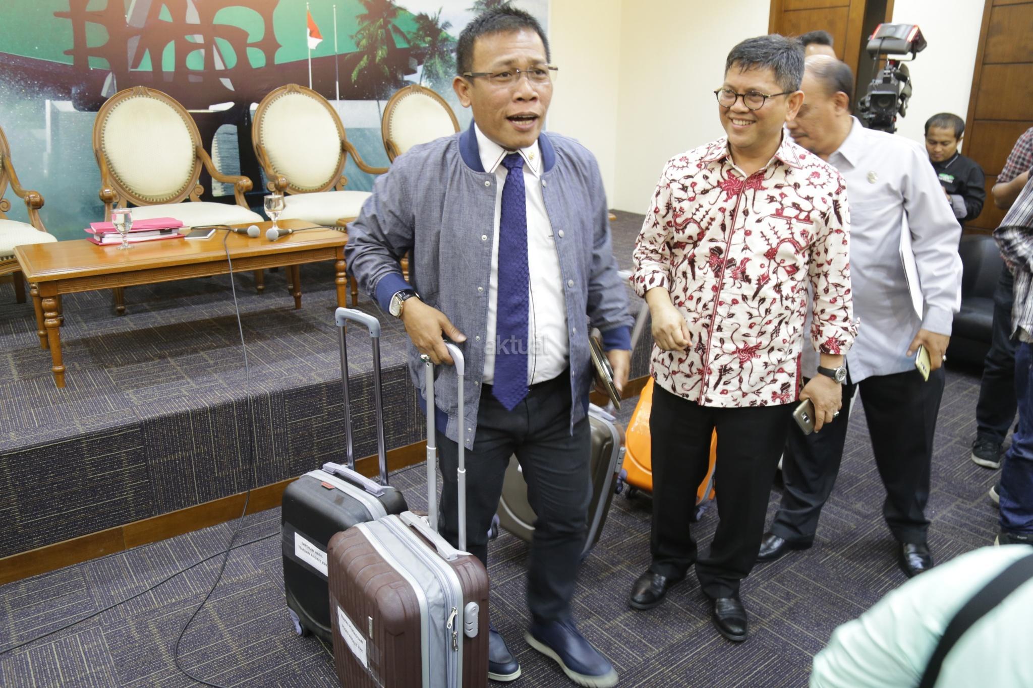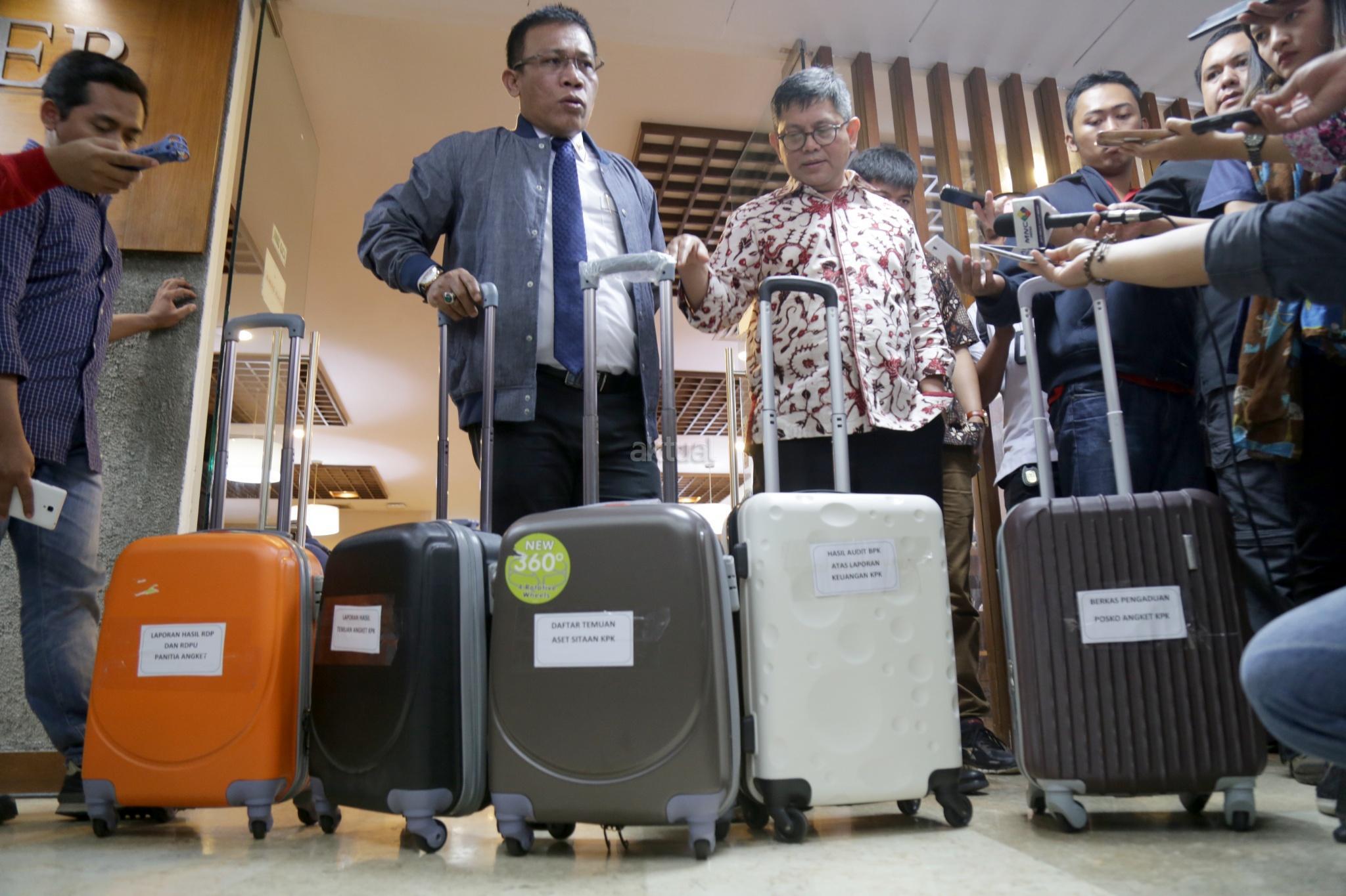 Wakil Ketua Pansus Angket KPK Masinton Pasaribu bersama Wakil Ketua Pansus Pansus Angket KPK Taufiqulhadi membawa 5 koper berkas pansus angket KPK usai konferensi pers di Pressroom, Gedung Parlemen, Senayan, Jakarta, Senin (18/9). Pansus Hak Angket KPK memamerkan 5 koper berkas berisi dokumen temuan hasil kerja mereka sejak Juni dan akan dilaporkan di rapat paripurna 28 September. Namun sebelum merampungkan tugas, mereka berharap bisa bertemu Presiden Jokowi. AKTUAL/Tino Oktaviano
