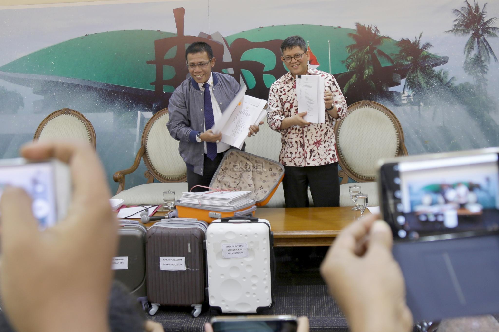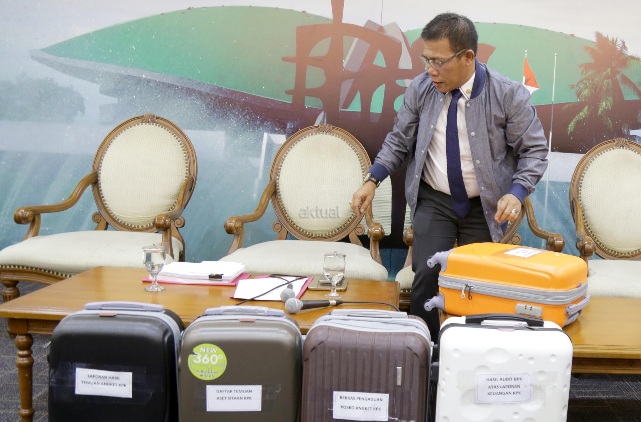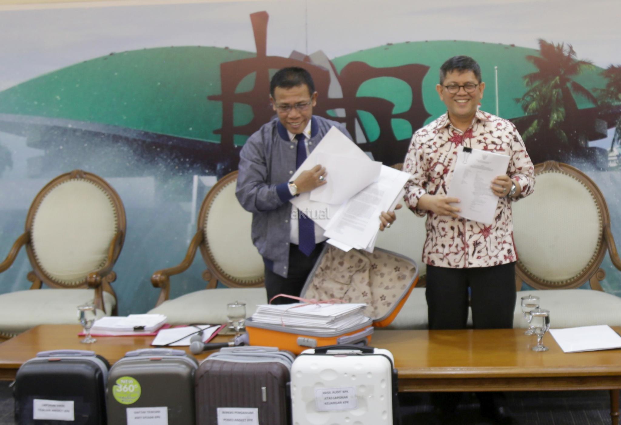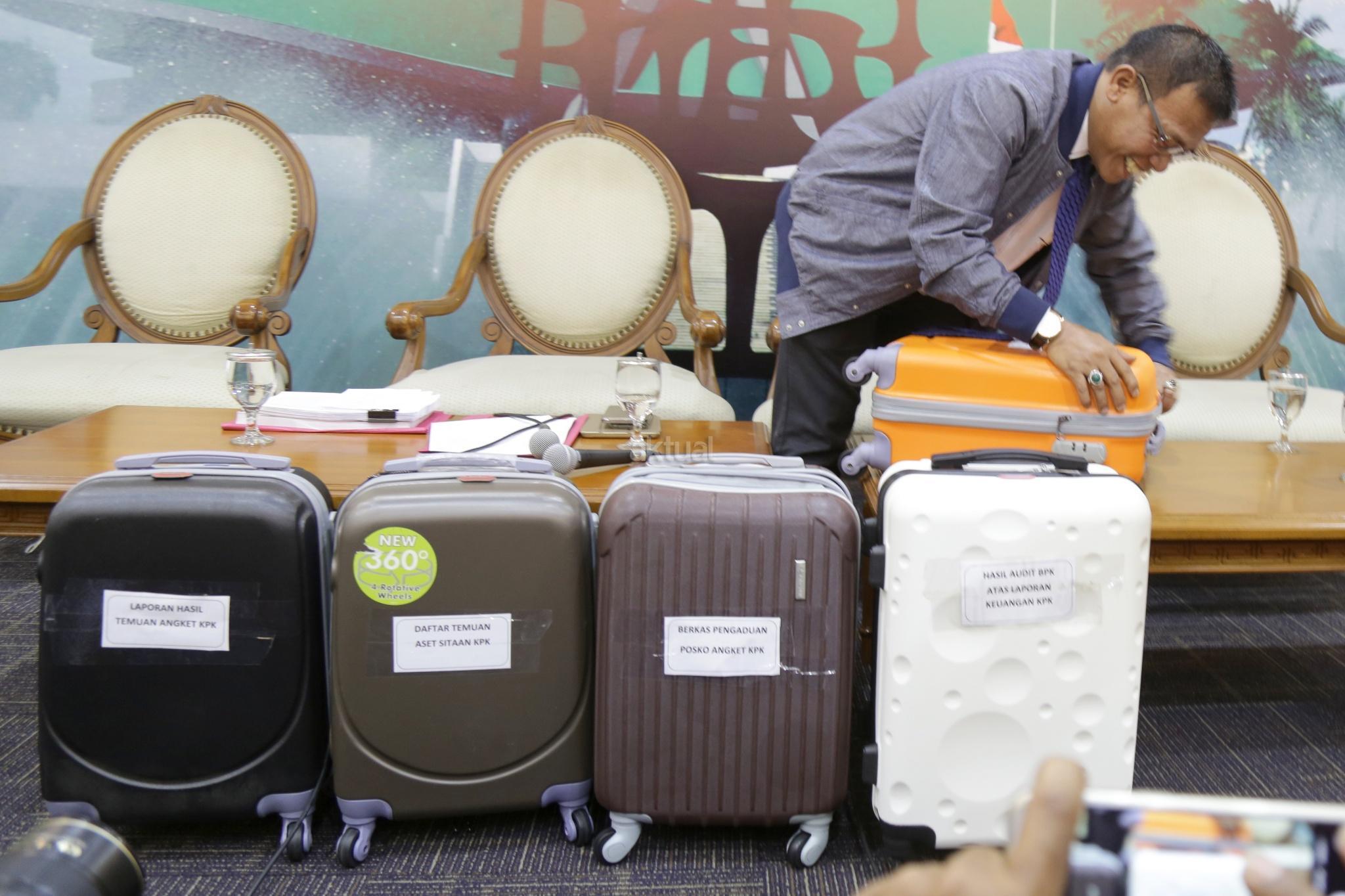 Wakil Ketua Pansus Angket KPK Masinton Pasaribu bersama Wakil Ketua Pansus Pansus Angket KPK Taufiqulhadi membawa 5 koper berkas pansus angket KPK usai konferensi pers di Pressroom, Gedung Parlemen, Senayan, Jakarta, Senin (18/9). Pansus Hak Angket KPK memamerkan 5 koper berkas berisi dokumen temuan hasil kerja mereka sejak Juni dan akan dilaporkan di rapat paripurna 28 September. Namun sebelum merampungkan tugas, mereka berharap bisa bertemu Presiden Jokowi. AKTUAL/Tino Oktaviano