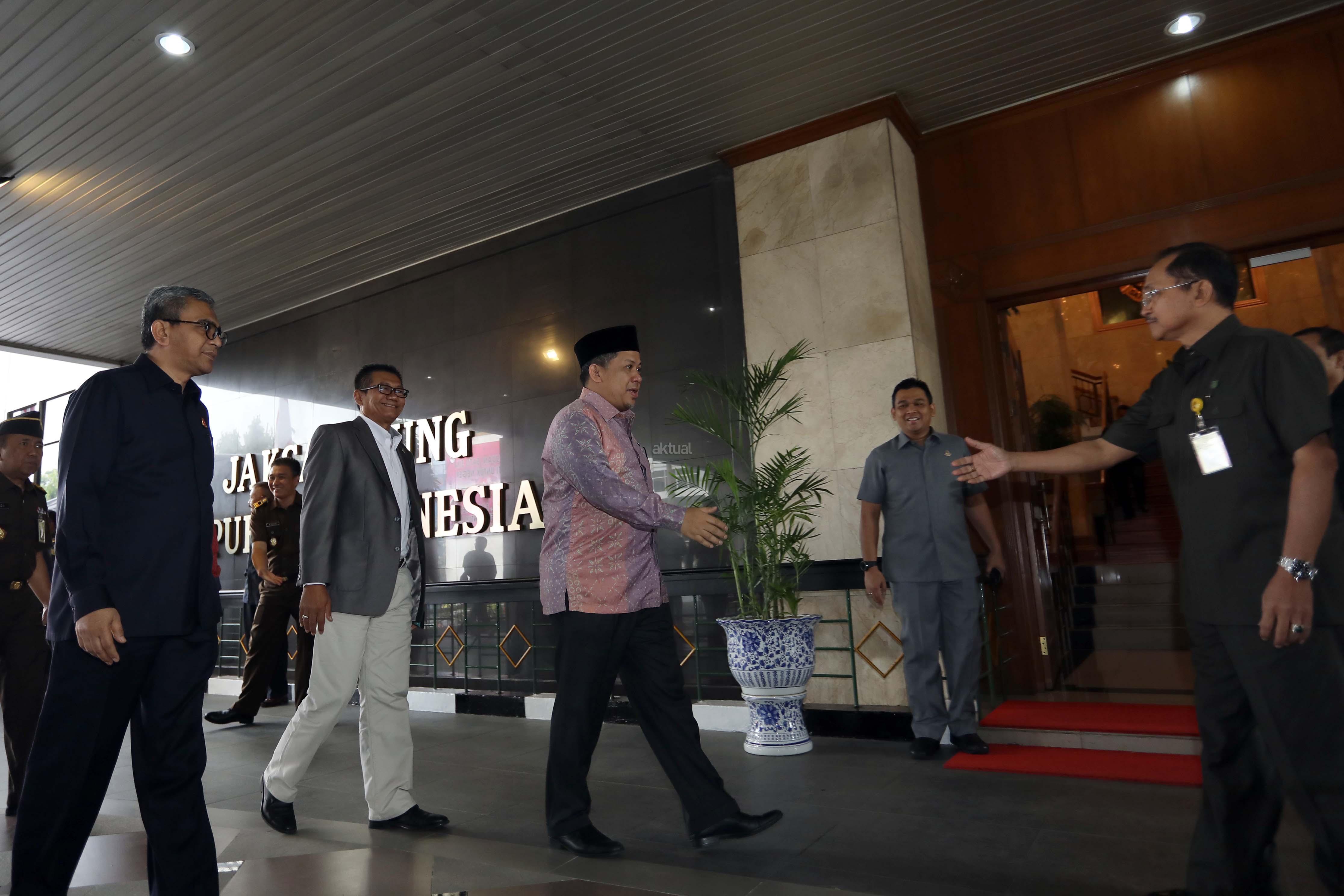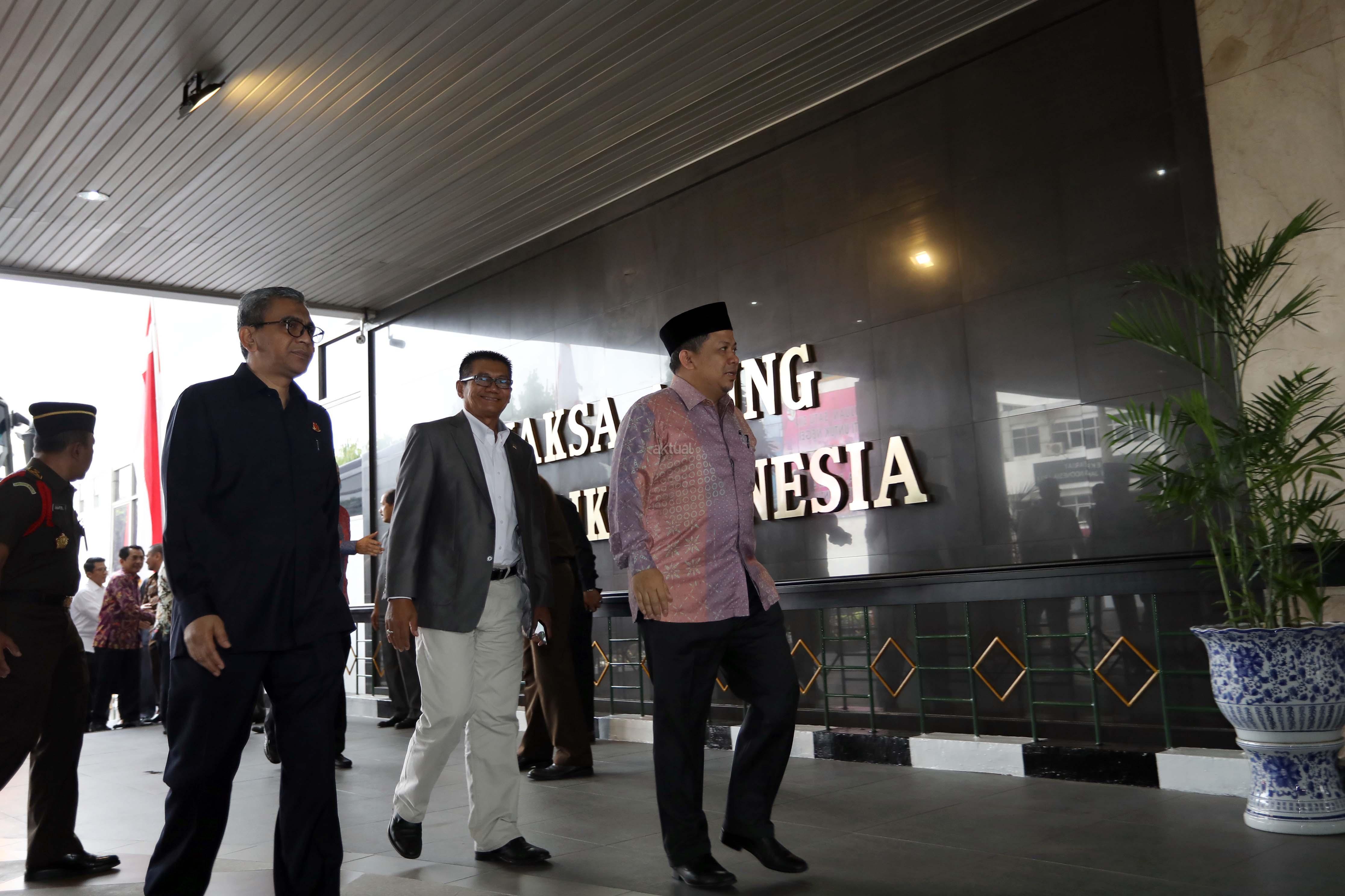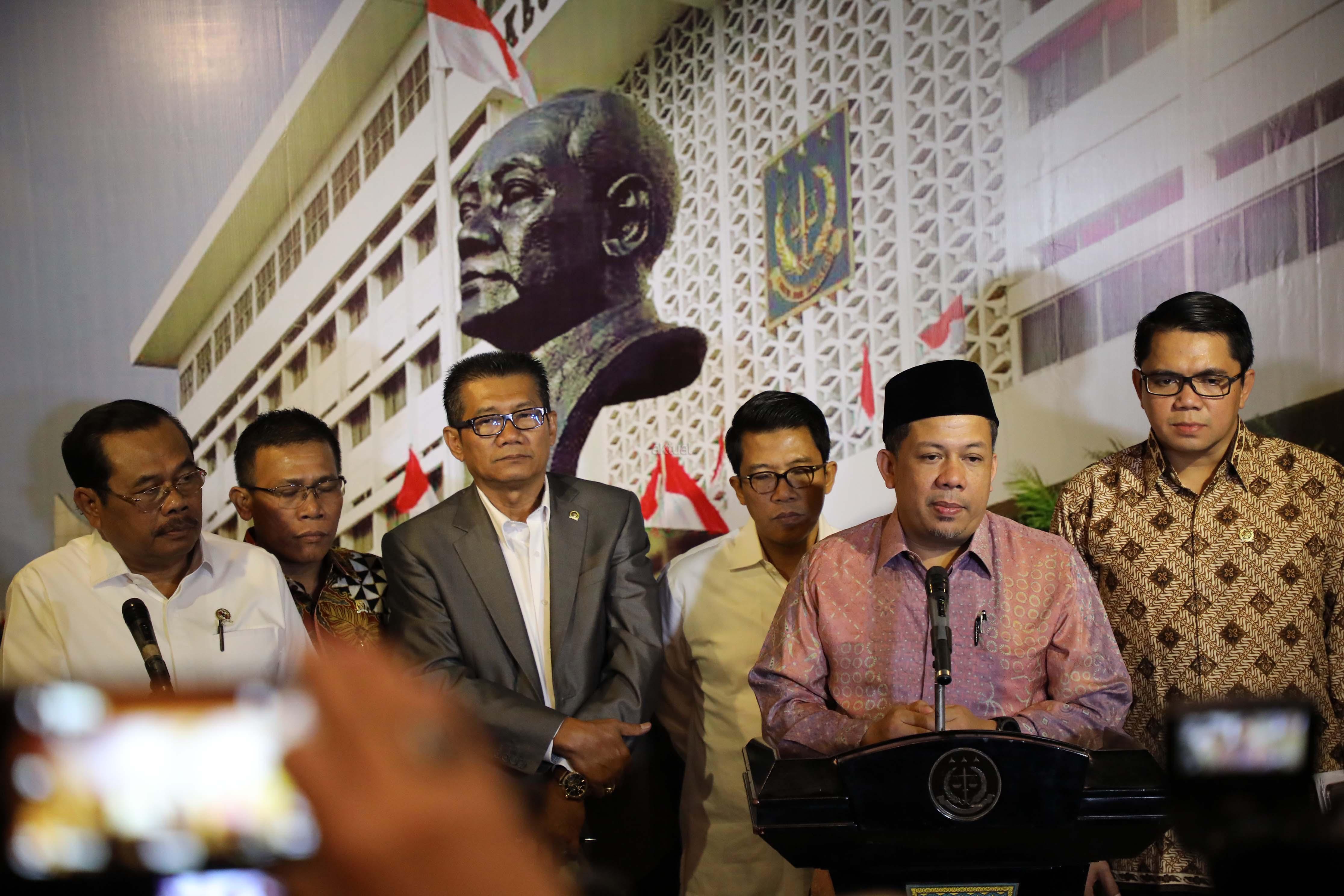 Wakil Ketua DPR Fahri Hamzah bersama Kejagung M Prasetyo didampingi para anggota Pansus Hak Angket KPK memberikan keterangan usai melakukan pertemuan tertutup dengan Pansus Hak Angket KPK di gedung Kejaksaan Agung, Kebayoran Baru, Jakarta, Kamis (13/7). Pertemuan antara Pansus Hak Angket KPK dengan Kejagung merupakan semata mata untuk silaturahmi antar lembaga negara dan tidak ada indikasi Pansus untuk mendiskreditkan KPK. AKTUAL/Tino Oktaviano