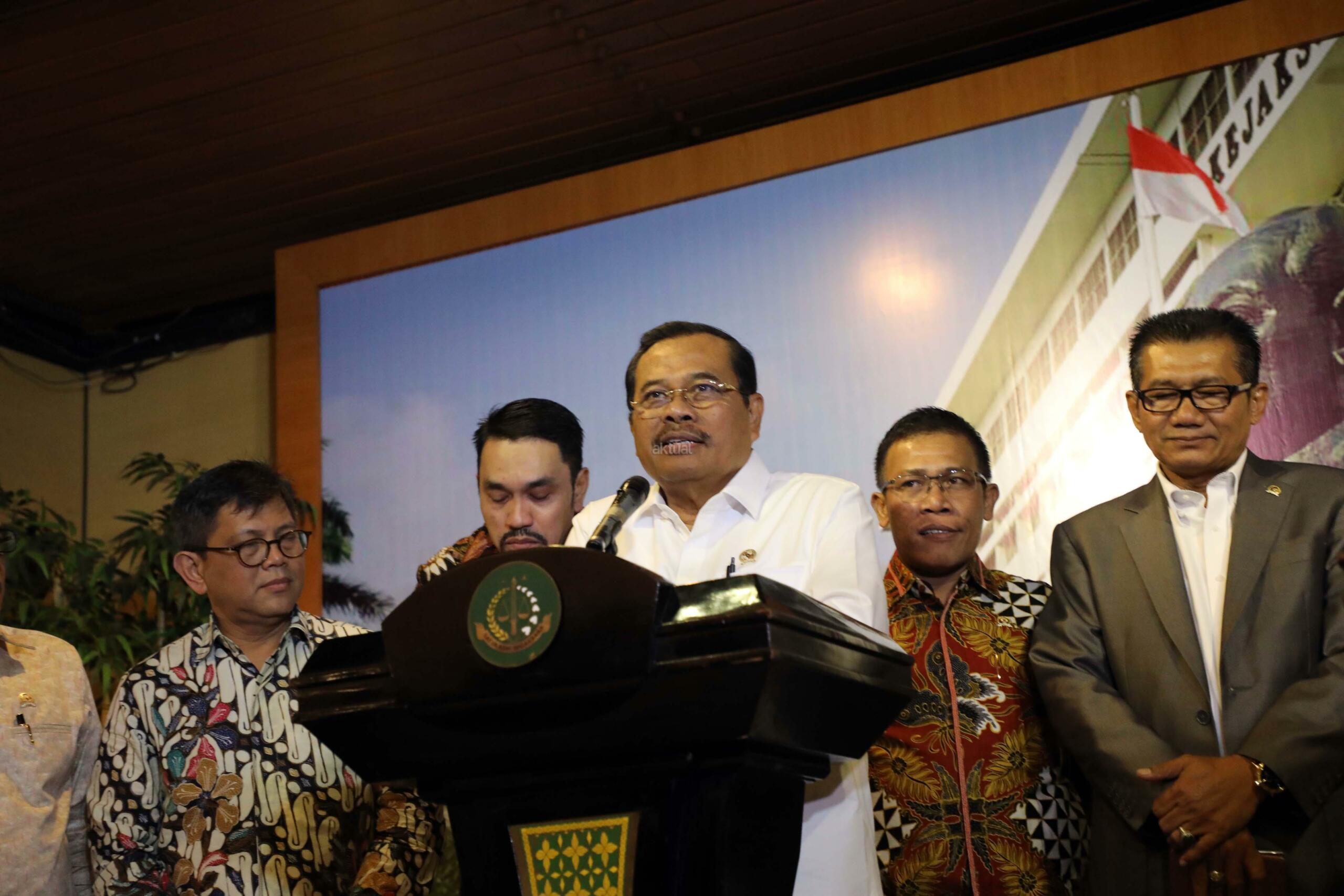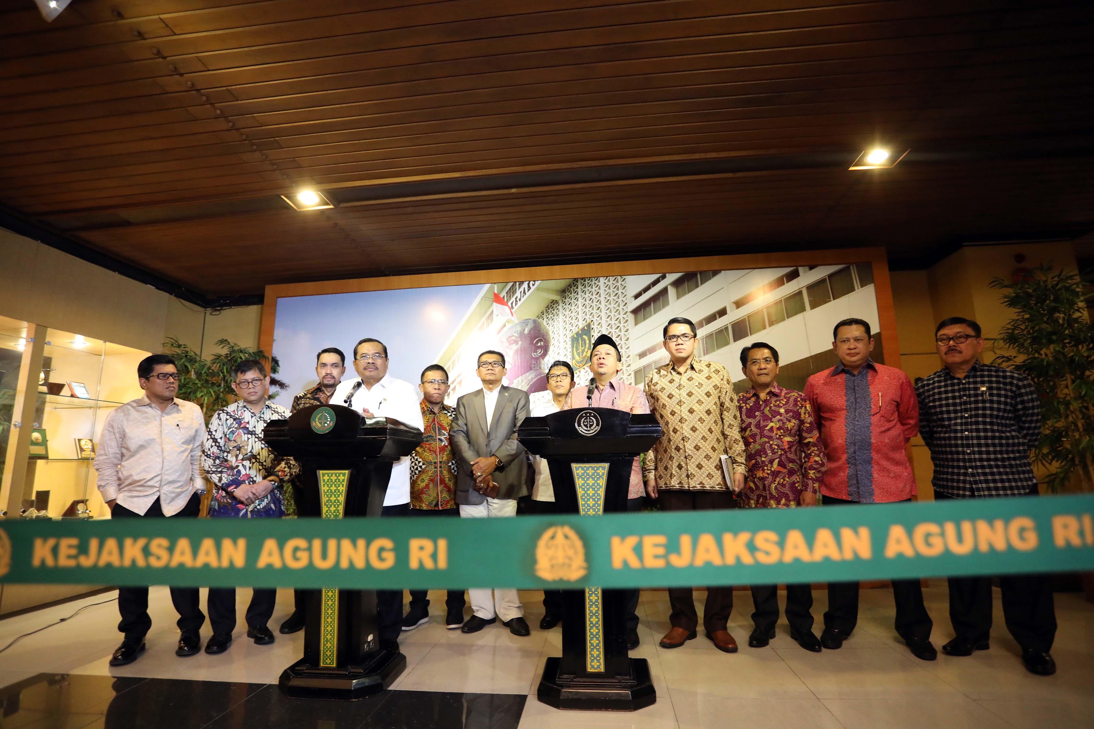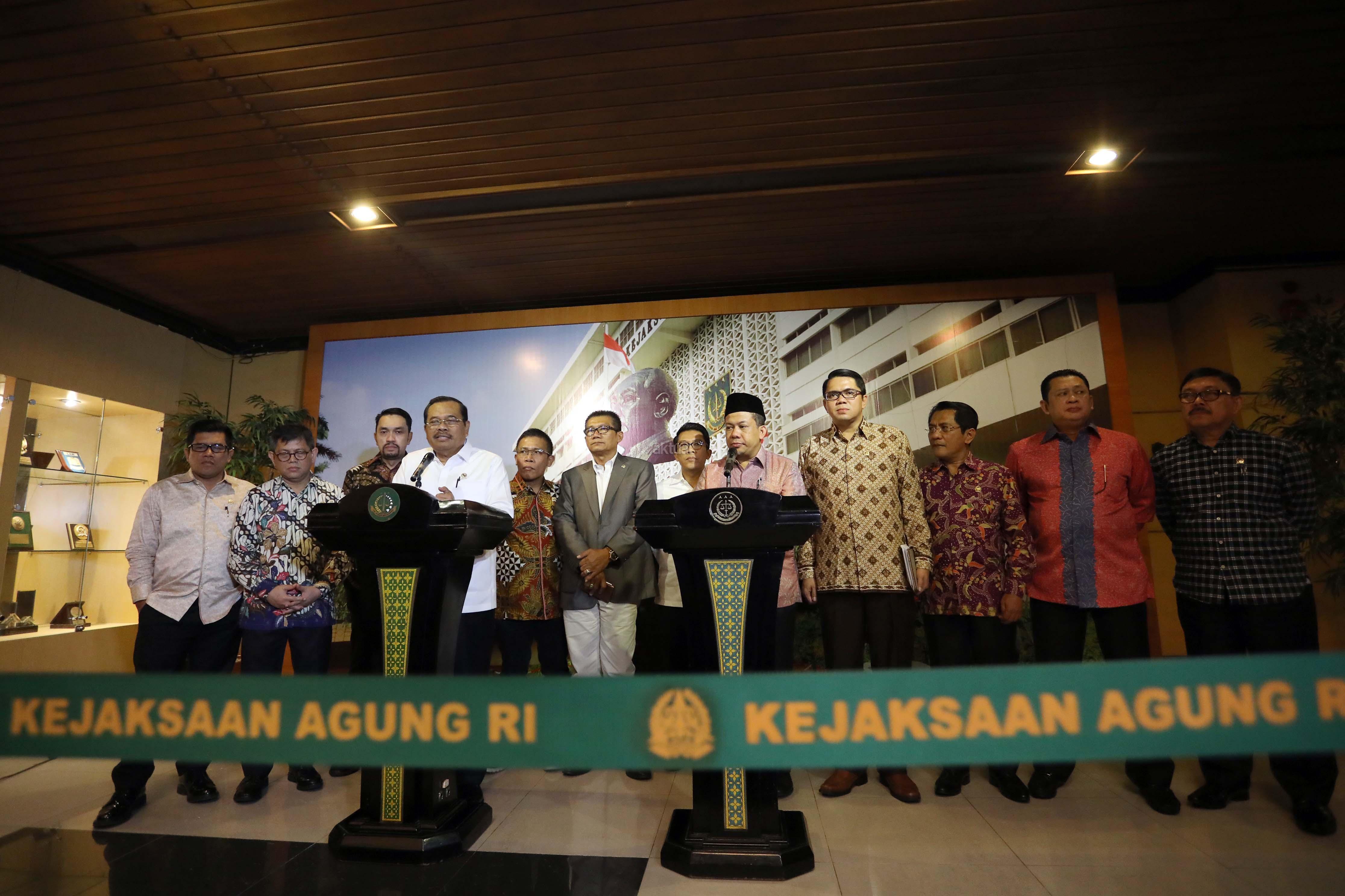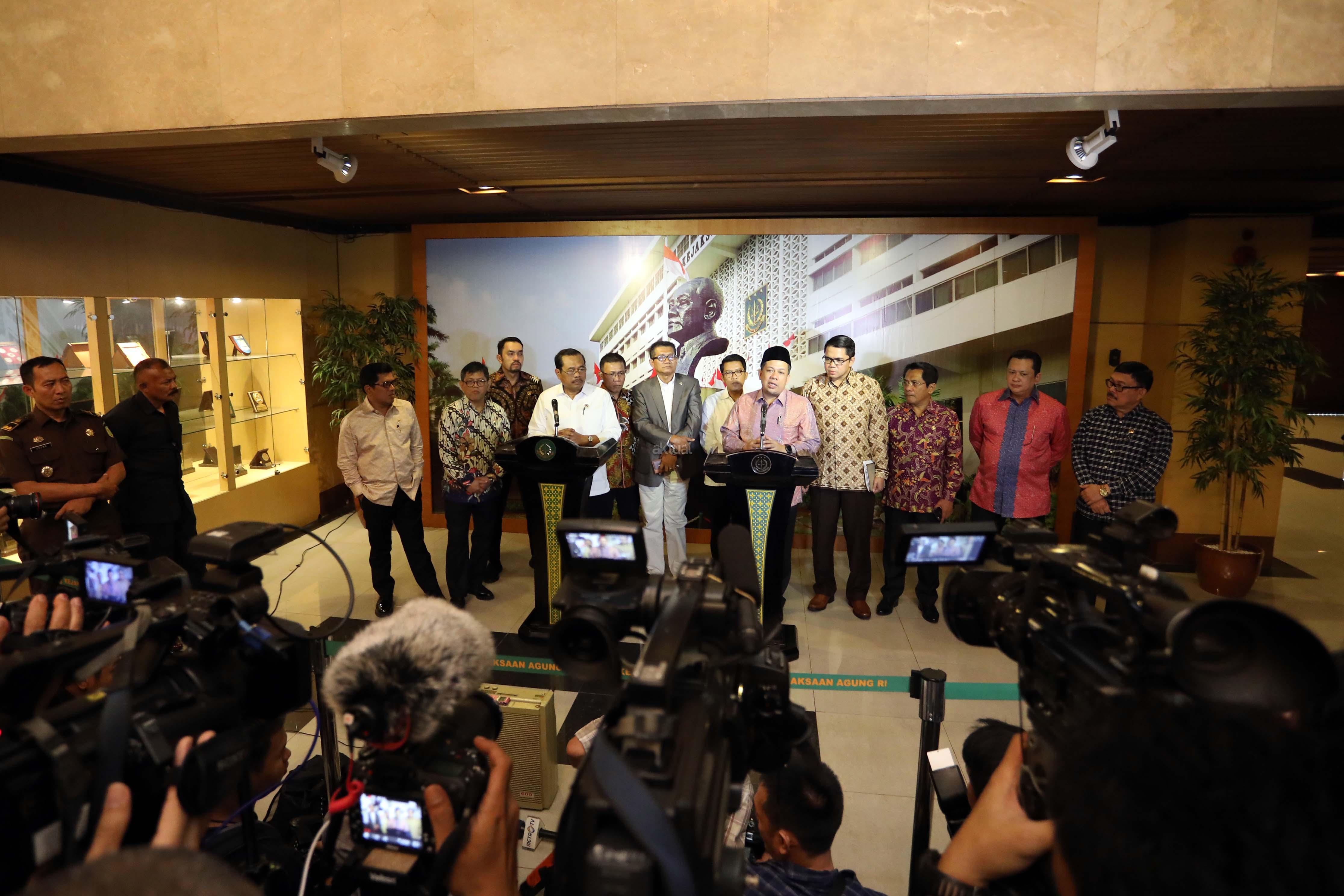 Jaksa Agung HM Prasetyo menyampaikan keterangan didampingi Anggota Pansus Angket KPK Masinton Pasaribu dan Ketua Pansus Angket KPK Agum Gunandjar saat konferensi pers usai melakukan pertemuan di Kejaksaan Agung, Jakarta, Kamis (13/7). Kunjungan Pansus Angket KPK ke Kejaksaan Agung untuk silaturahmi dan koordinasi tugas-tugas Pansus Hak Angket KPK yang terkait dengan berbagai aturan dan prosedur fungsi penuntutan dan politik penindakan tindak pidana korupsi dan berfokus pada tugas-tugas penuntutan Kejaksaan Agung dalam tindak pidana korupsi. AKTUAL/Tino Oktaviano