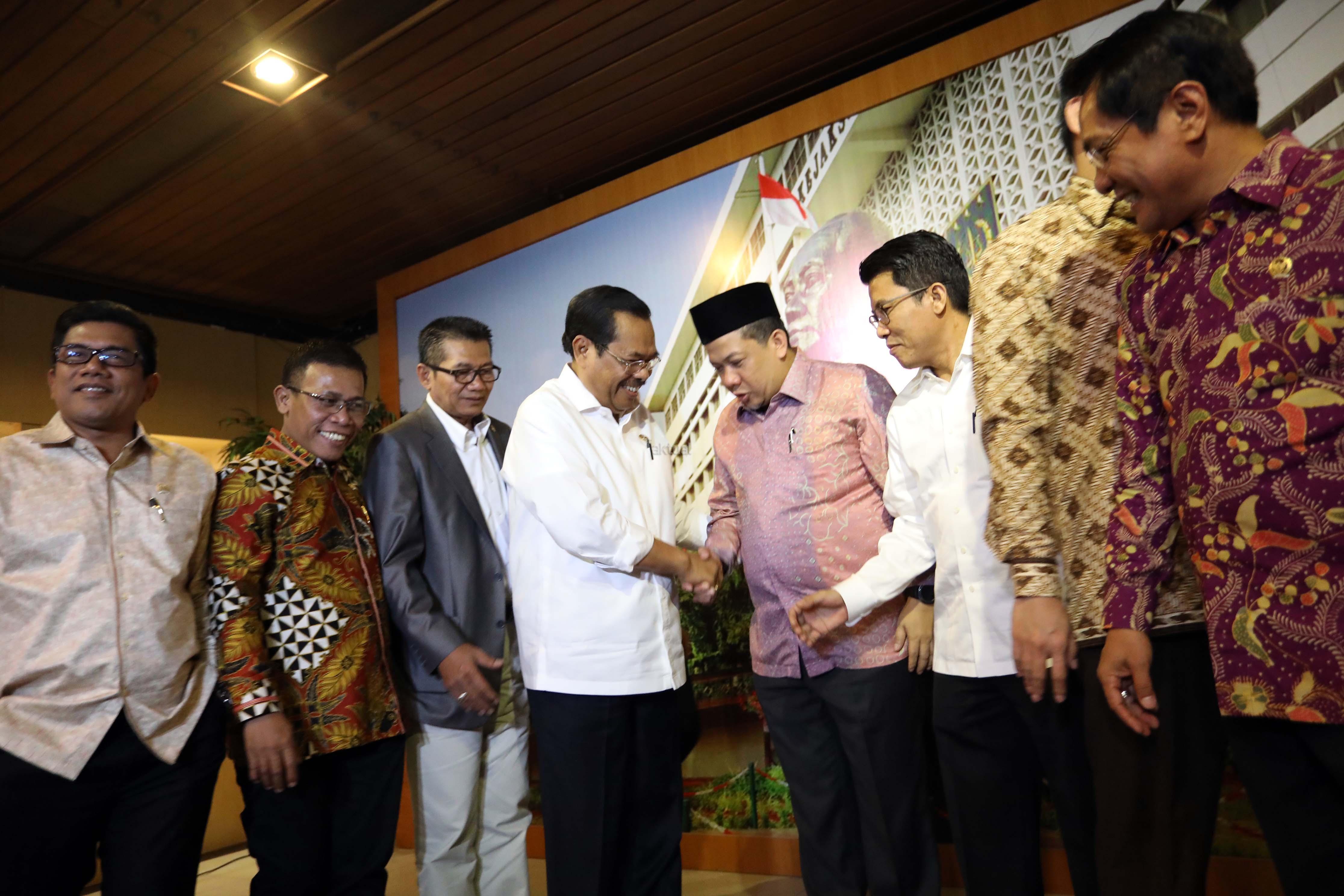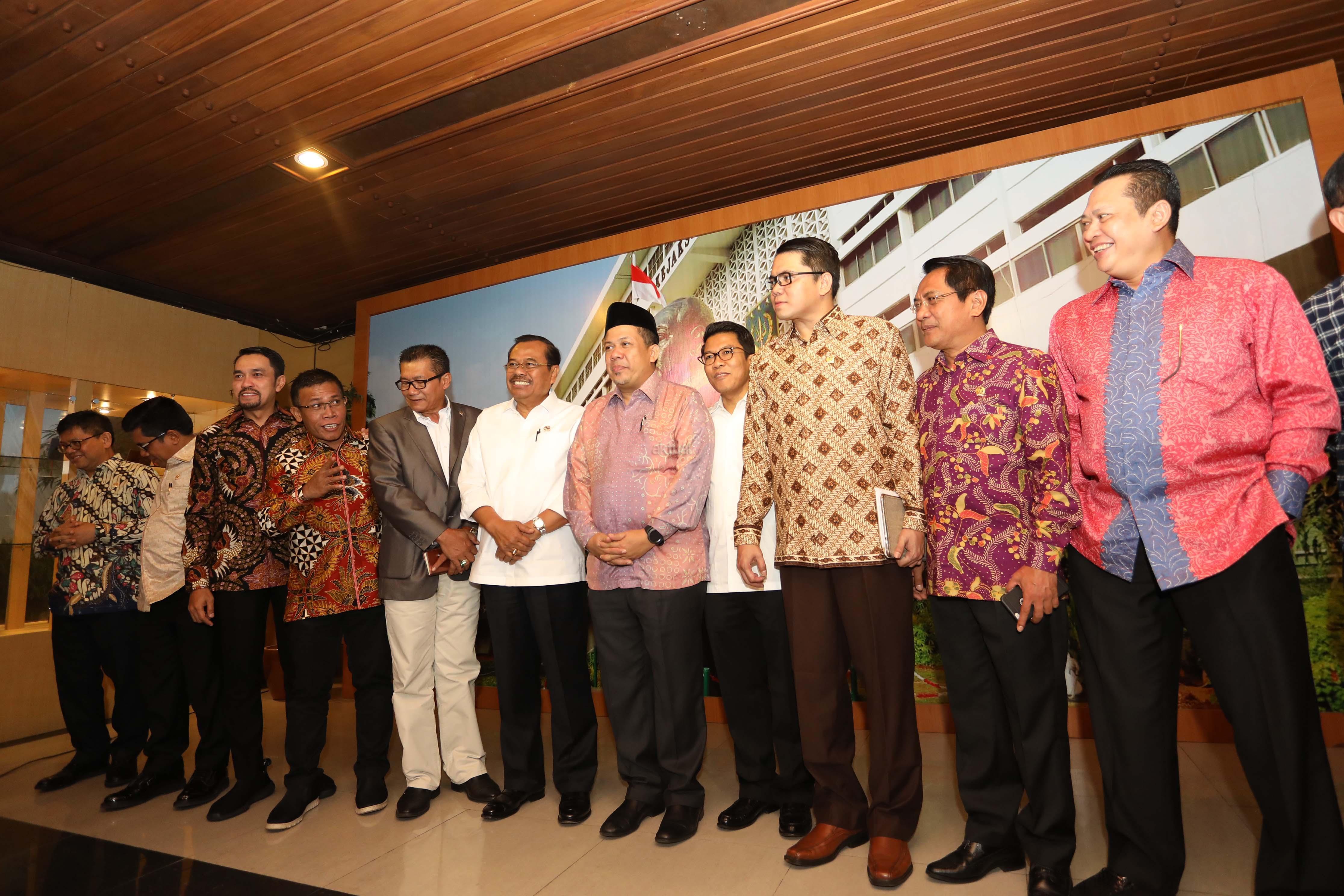 Jaksa Agung HM Prasetyo (keempat kiri) dan Wakil Ketua DPR Fahri Hamzah (keempat kanan) dan Ketua Pansus Angket KPK Agum Gunandjar (tengah) serta sejumlah Anggota Pansus Angket KPK berfoto bersama usai melakukan pertemuan di Kejaksaan Agung, Jakarta, Kamis (13/7). Kunjungan Pansus Angket KPK ke Kejaksaan Agung untuk silaturahmi dan koordinasi tugas-tugas Pansus Hak Angket KPK yang terkait dengan berbagai aturan dan prosedur fungsi penuntutan dan politik penindakan tindak pidana korupsi dan berfokus pada tugas-tugas penuntutan Kejaksaan Agung dalam tindak pidana korupsi. AKTUAL/Tino Oktaviano