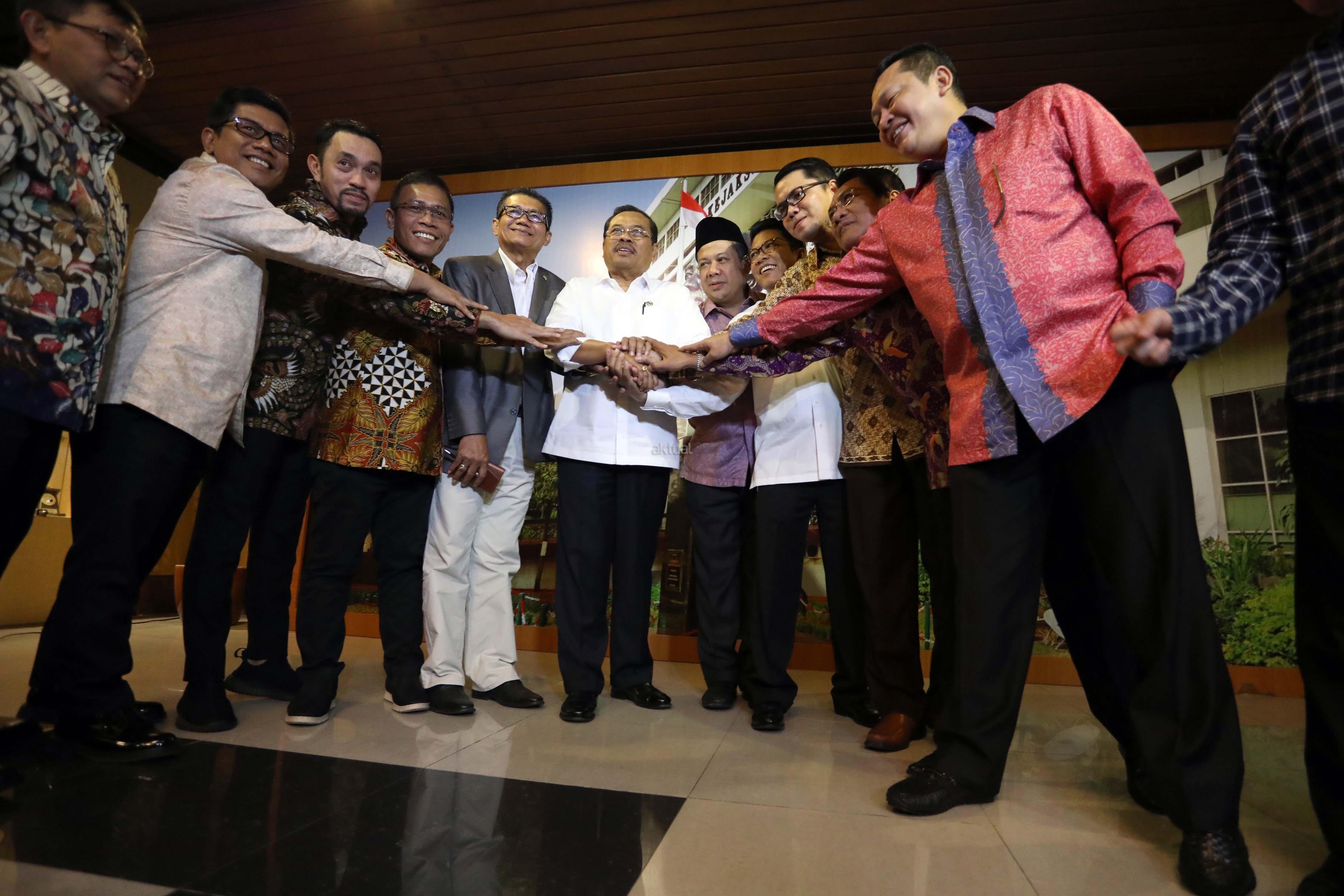 Jaksa Agung HM Prasetyo (keempat kiri) dan Wakil Ketua DPR Fahri Hamzah (keempat kanan) dan Ketua Pansus Angket KPK Agum Gunandjar (tengah) serta sejumlah Anggota Pansus Angket KPK saat konferensi pers usai melakukan pertemuan di Kejaksaan Agung, Jakarta, Kamis (13/7). Kunjungan Pansus Angket KPK ke Kejaksaan Agung untuk silaturahmi dan koordinasi tugas-tugas Pansus Hak Angket KPK yang terkait dengan berbagai aturan dan prosedur fungsi penuntutan dan politik penindakan tindak pidana korupsi dan berfokus pada tugas-tugas penuntutan Kejaksaan Agung dalam tindak pidana korupsi. AKTUAL/Tino Oktaviano