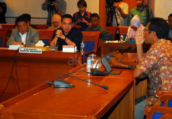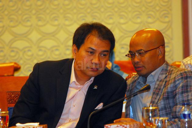 Anggota DPR Fraksi Golkar Azis Syamsuddin berbincang dengan Anggota DPR Fraksi Gerindra Desmond Djunaedi Mahesa, saat rapat Pansus Pelindo II di Kompleks Parlemen, Jakarta, Rabu (21/10). Rapat itu membahas penanganan kasus dugaan korupsi Pelindo II.
