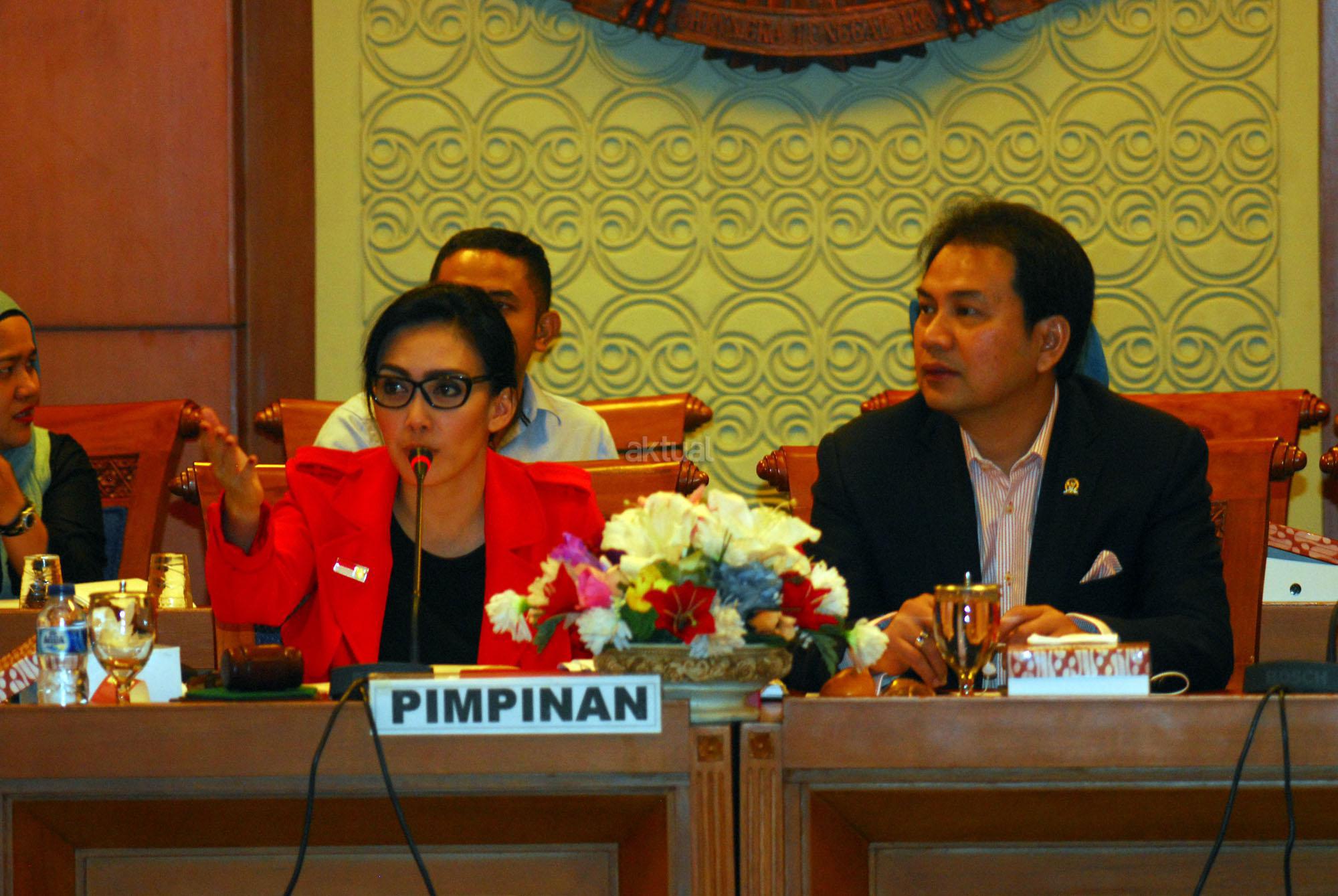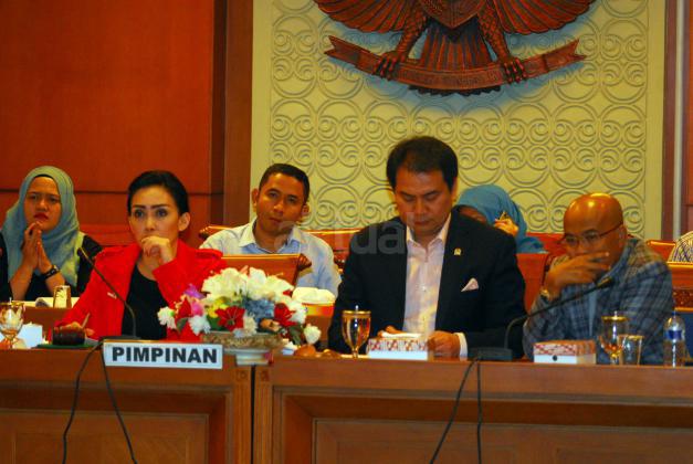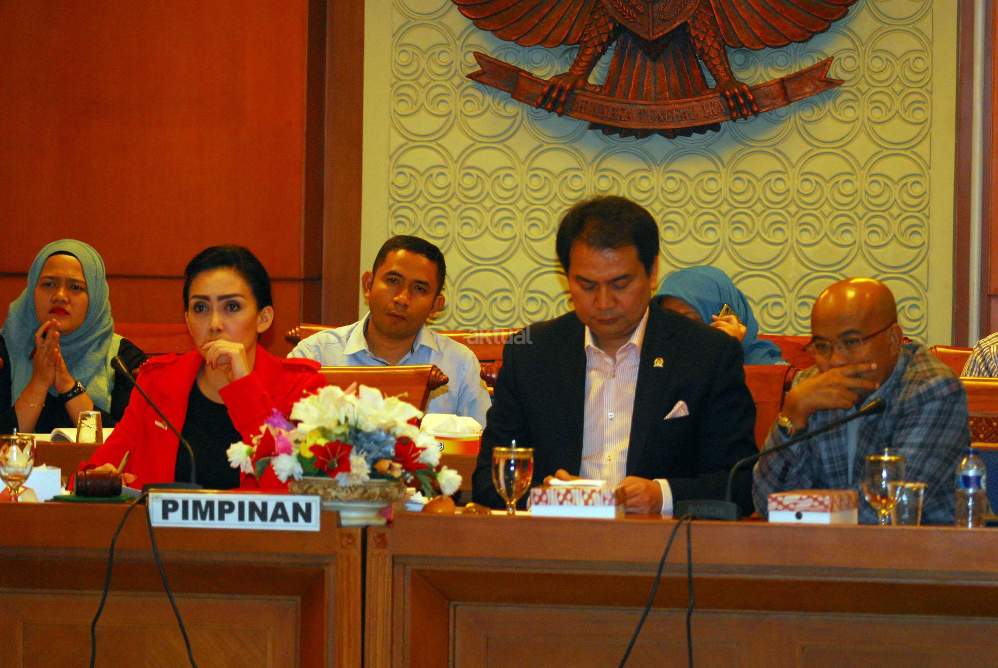 Ketua Pansus Pelindo II Rieke Diah Pitaloka didampingi Anggota DPR Fraksi Golkar Azis Syamsuddin dan Anggota DPR Fraksi Gerindra Desmond Djunaedi Mahesa, saat rapat Pansus Pelindo II di Kompleks Parlemen, Jakarta, Rabu (21/10). Rapat itu membahas penanganan kasus dugaan korupsi Pelindo II.