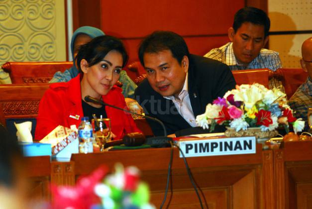 Ketua Pansus Pelindo II Rieke Diah Pitaloka didampingi Anggota DPR Fraksi Golkar Azis Syamsuddin disela saat rapat Pansus Pelindo II di Kompleks Parlemen, Jakarta, Rabu (21/10). Rapat itu membahas penanganan kasus dugaan korupsi Pelindo II.