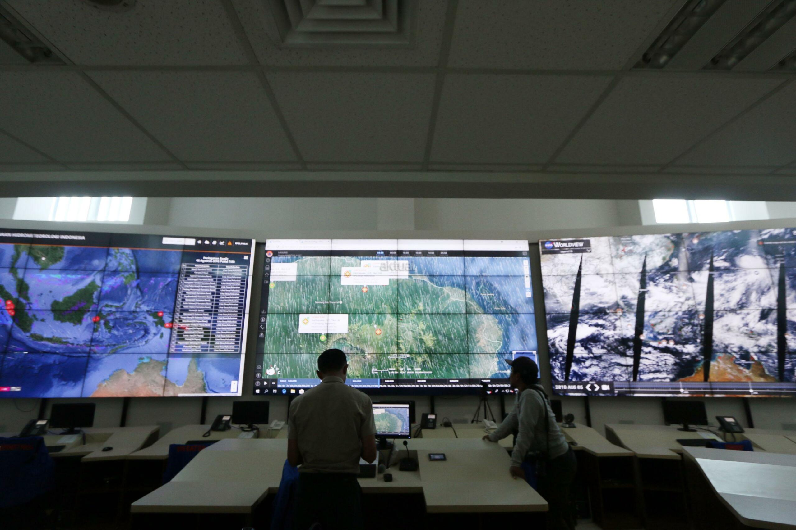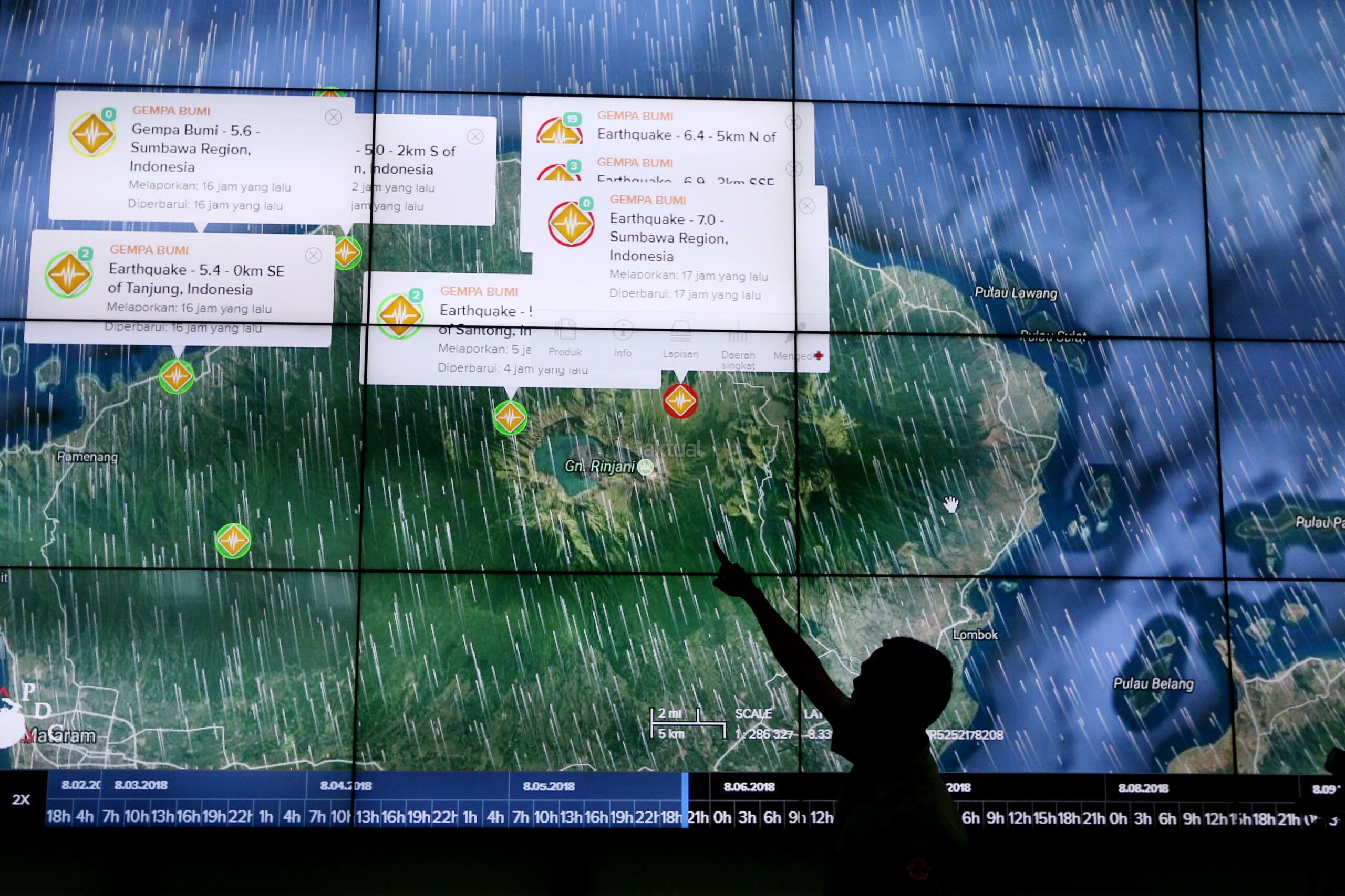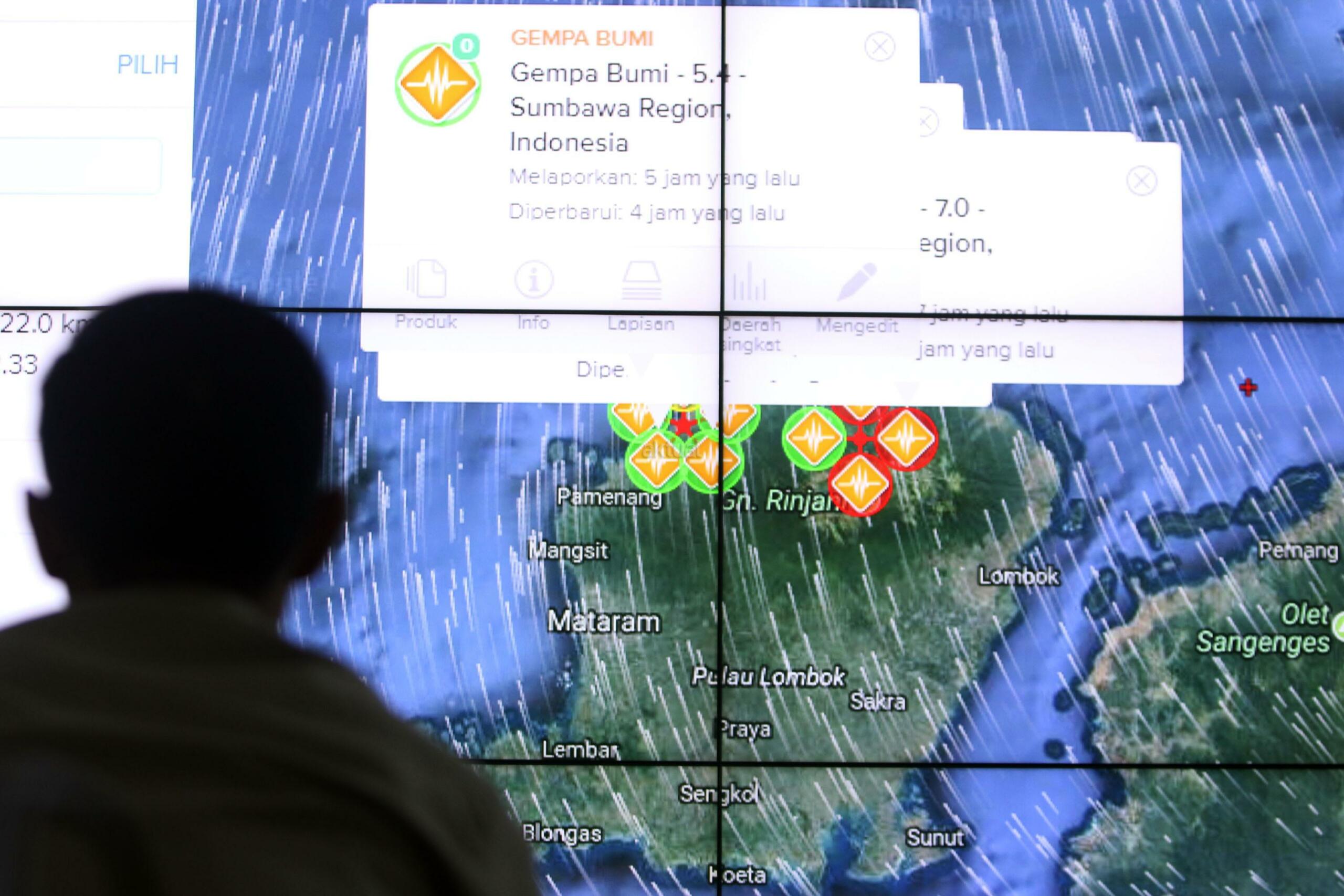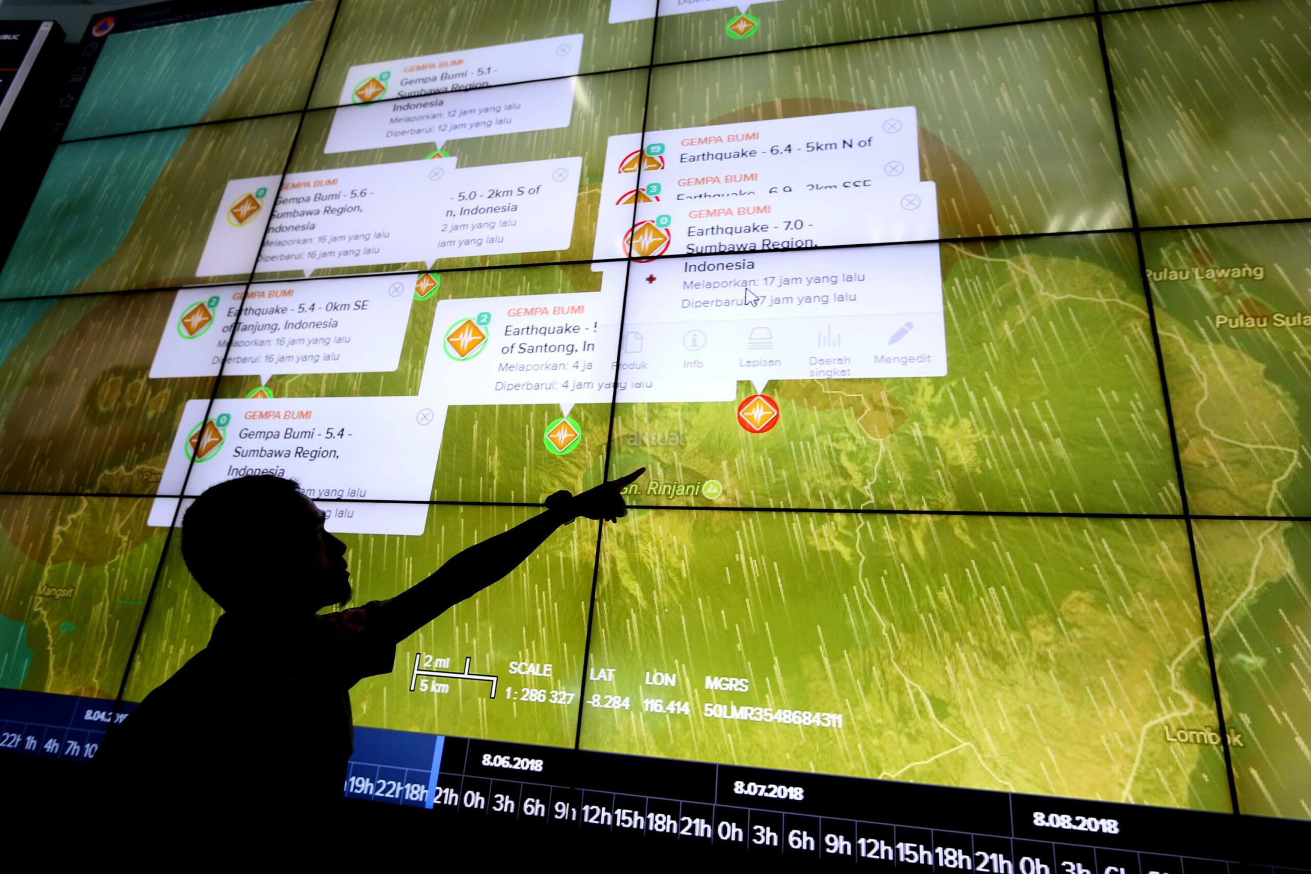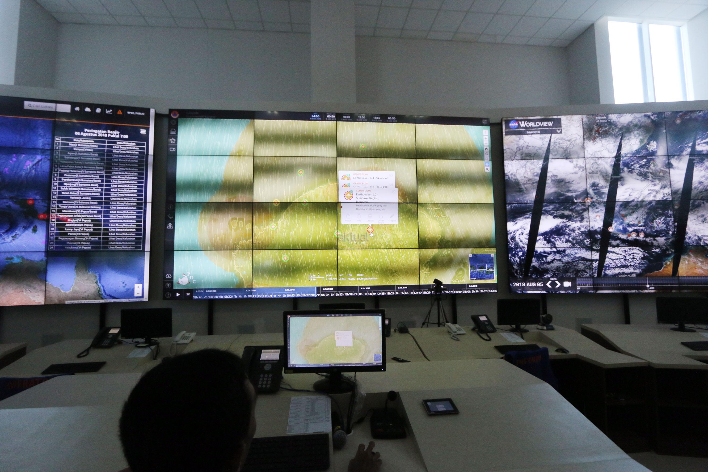 Petugas tengah melakukan monitoring pada tiga buah layar raksasa di Ruang Pusat Data dan Laporan Operasional (Pusdalops) yang berada di lantai 11 gedung Graha Badan Nasional Penanggulangan Bencana (BNPB), Jakarta, Senin (6/8/2018). Ruangan ini dipakai BNPB dalam memantau perkembangan bencana alam gempa bumi yang tengah terjadi di NTB dan sekitarnya. AKTUAL/Tino Oktaviano