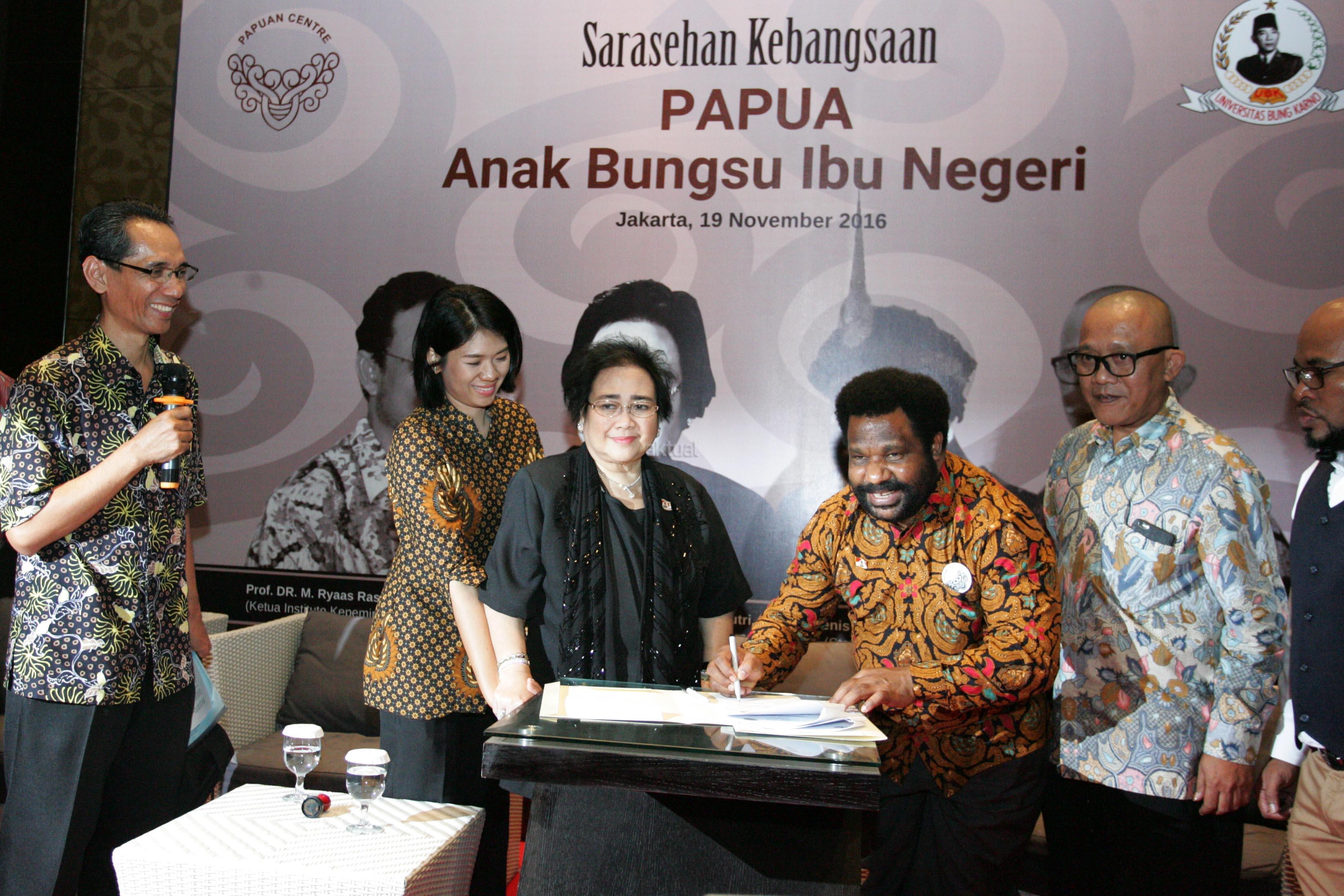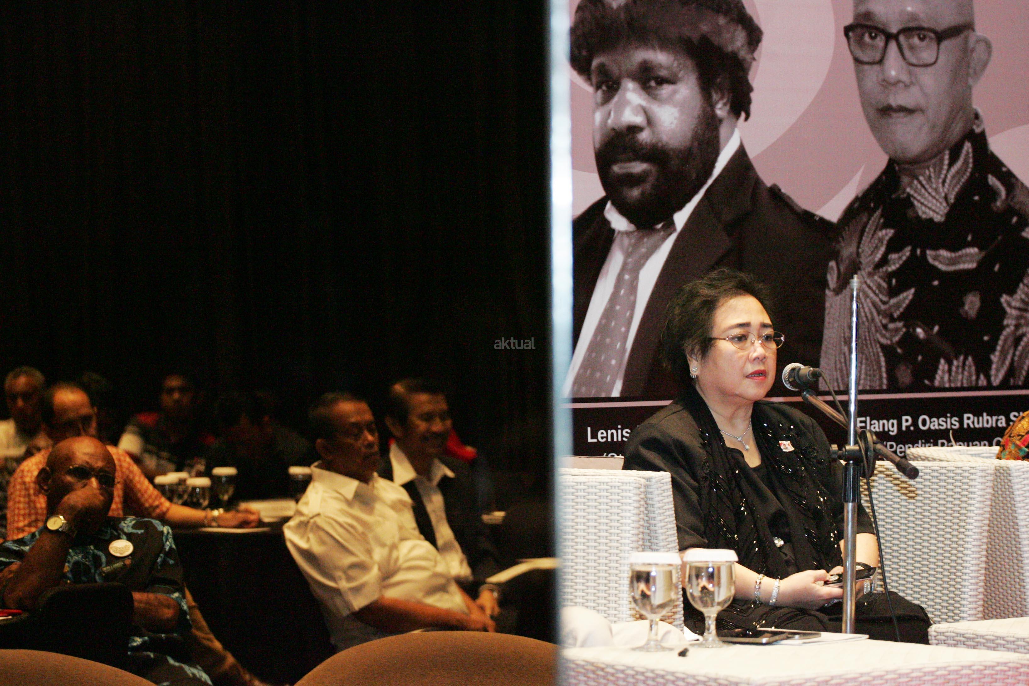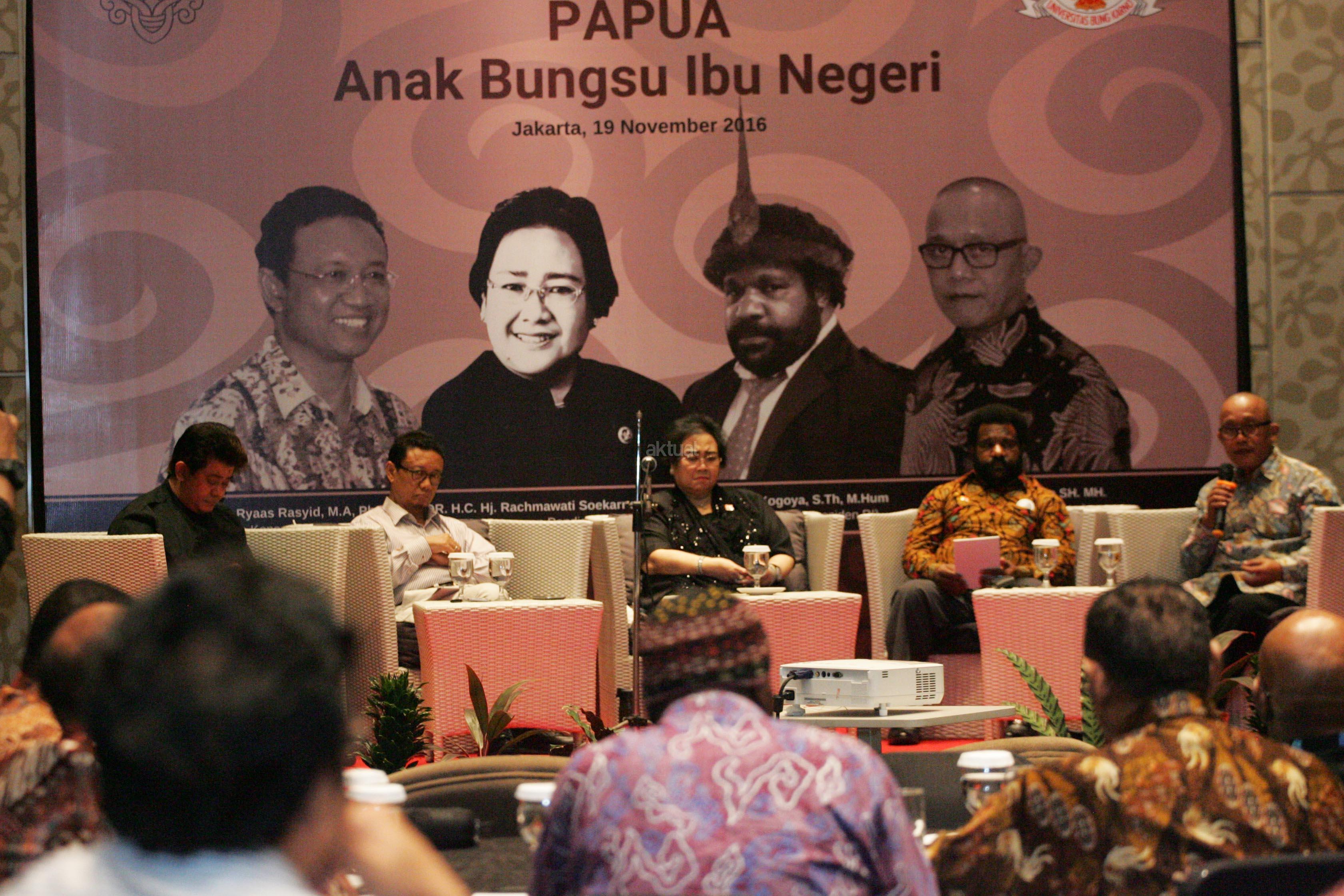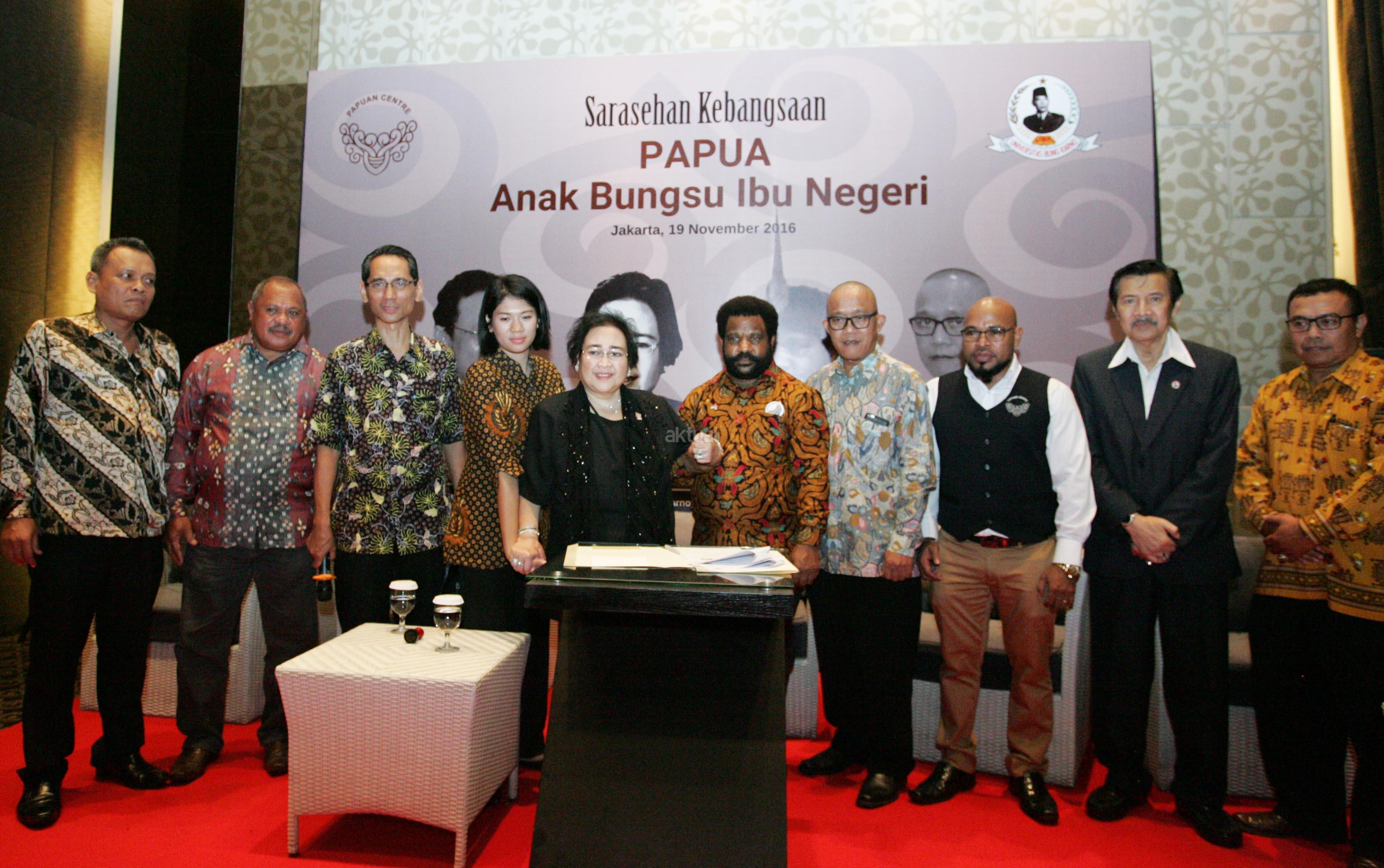 Pendiri Yayasan Pendidikan Soekarno Rachmawati Soekarnoputri (tengah) bersama Ketua Institute Kepemimpinan Soekarno Ryaas Rasyid (kiri) dan Staff khusus Presiden Lenis Kogoya (kanan) menjadi pembicara dalam Sarasehan Kebangsaan di Jakarta, Sabtu (19/11/2016). Sarasehan tersebut mengangkat tema Papua Anak Bungsu Ibu Negeri. AKTUAL/Munzir
