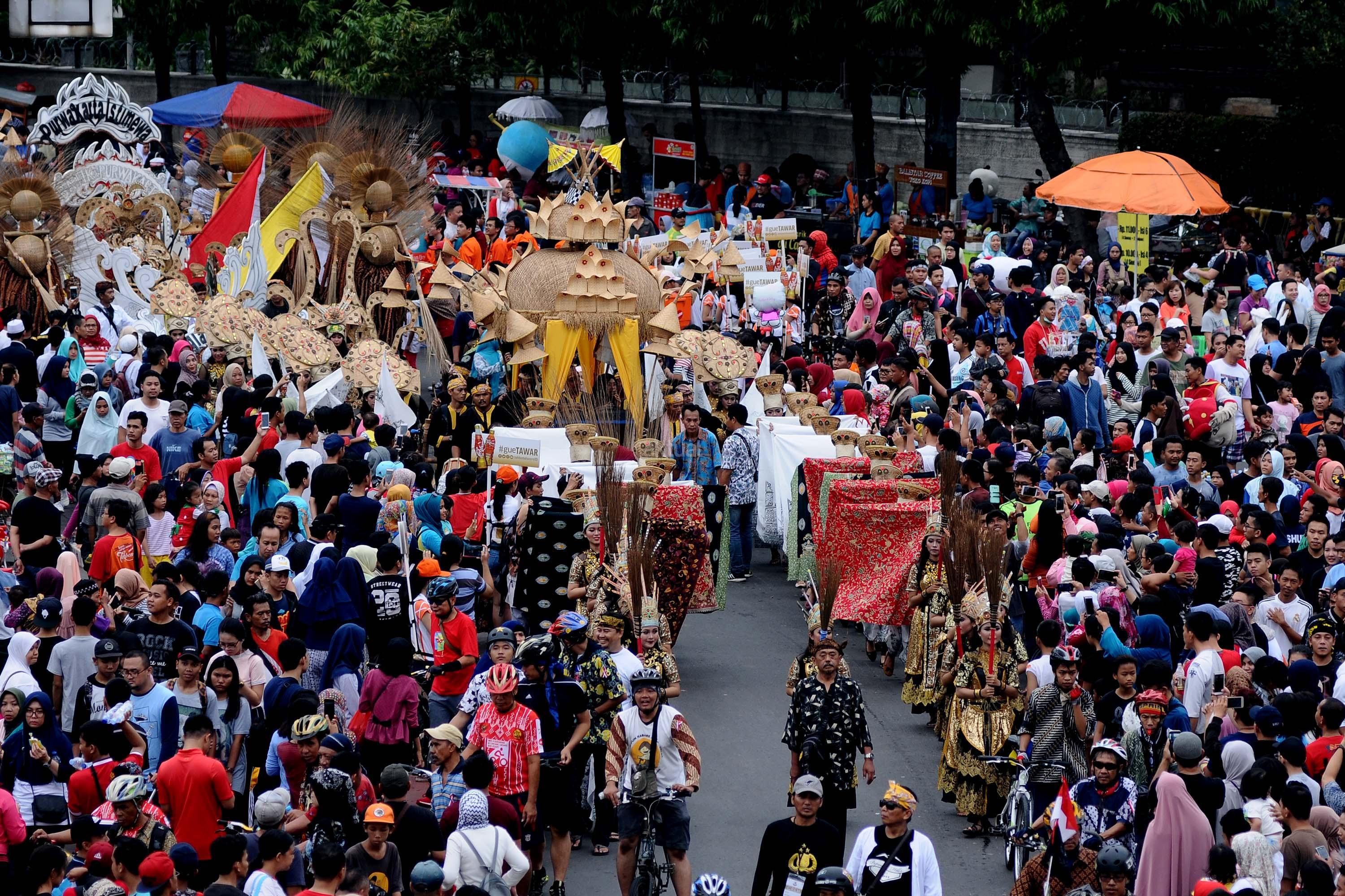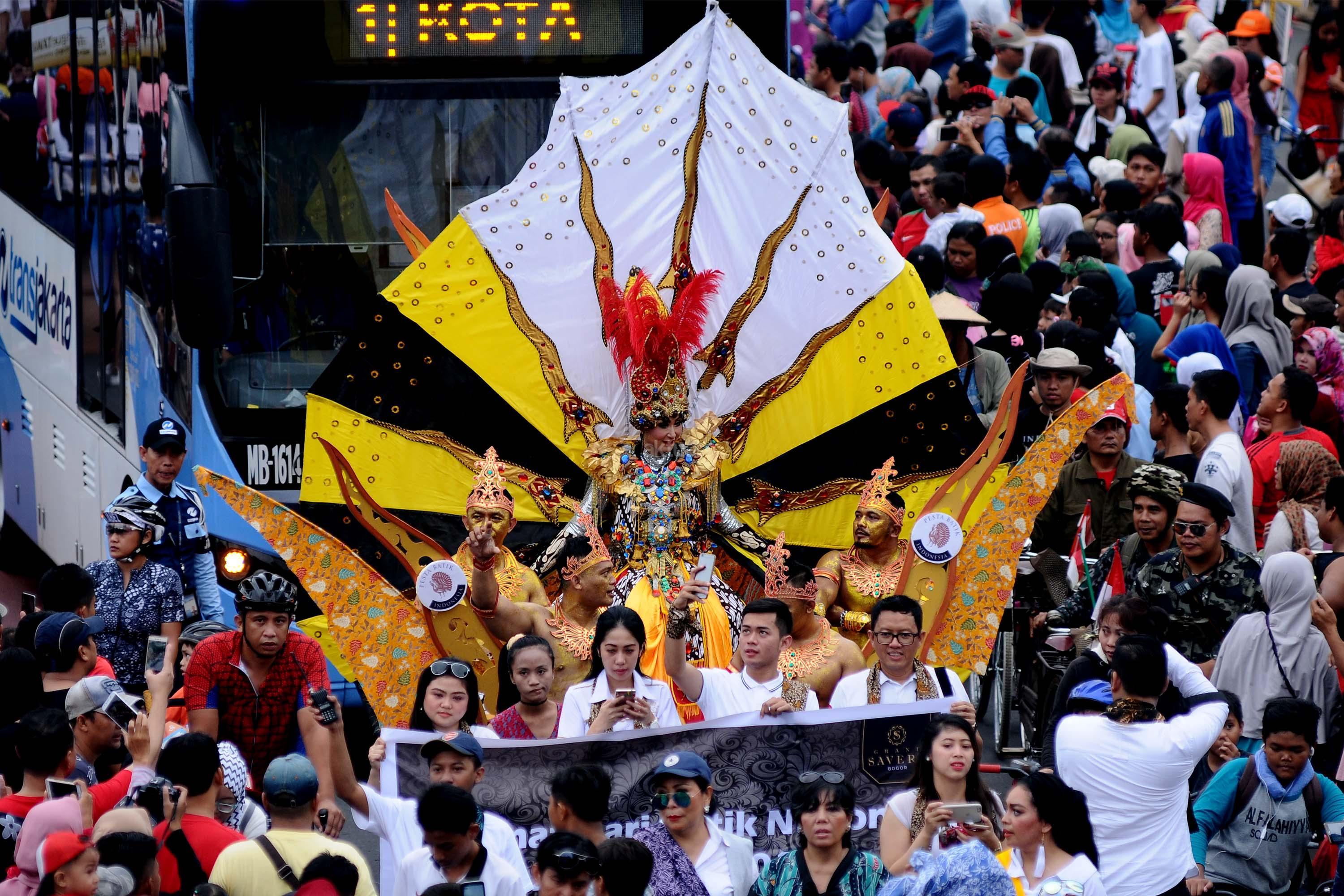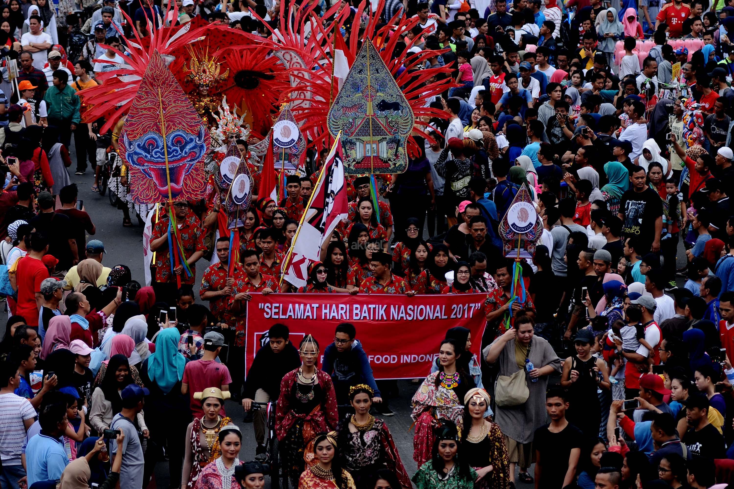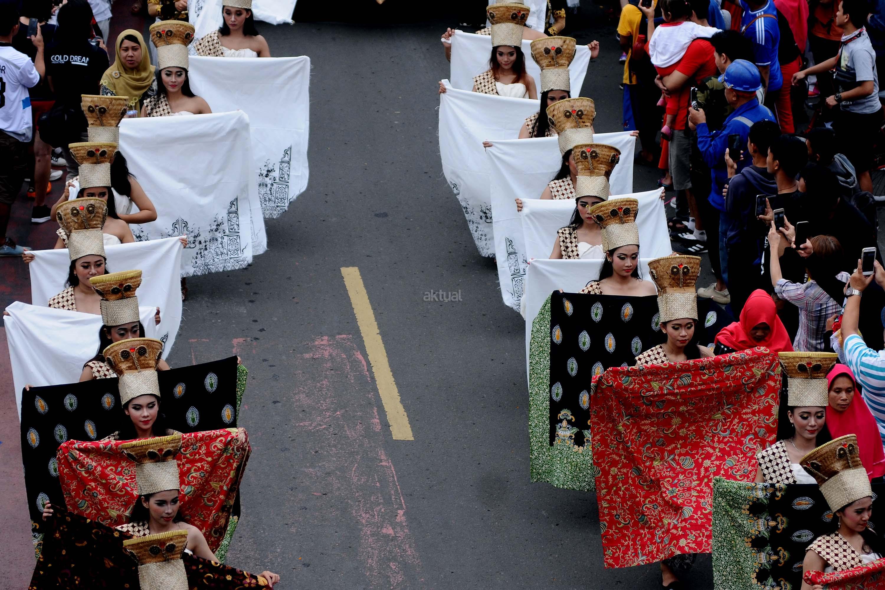 Peserta pawai perayaan Hari Batik Nasional berusaha menembus kerumunan warga saat Hari Bebas Kendaraan di kawasan Bundaran HI, Jakarta, Minggu (1/10/2017). Parade Batik Nusantara ini perayaan Hari Batik Nasional 2 Oktober. AKTUAL/Munzir