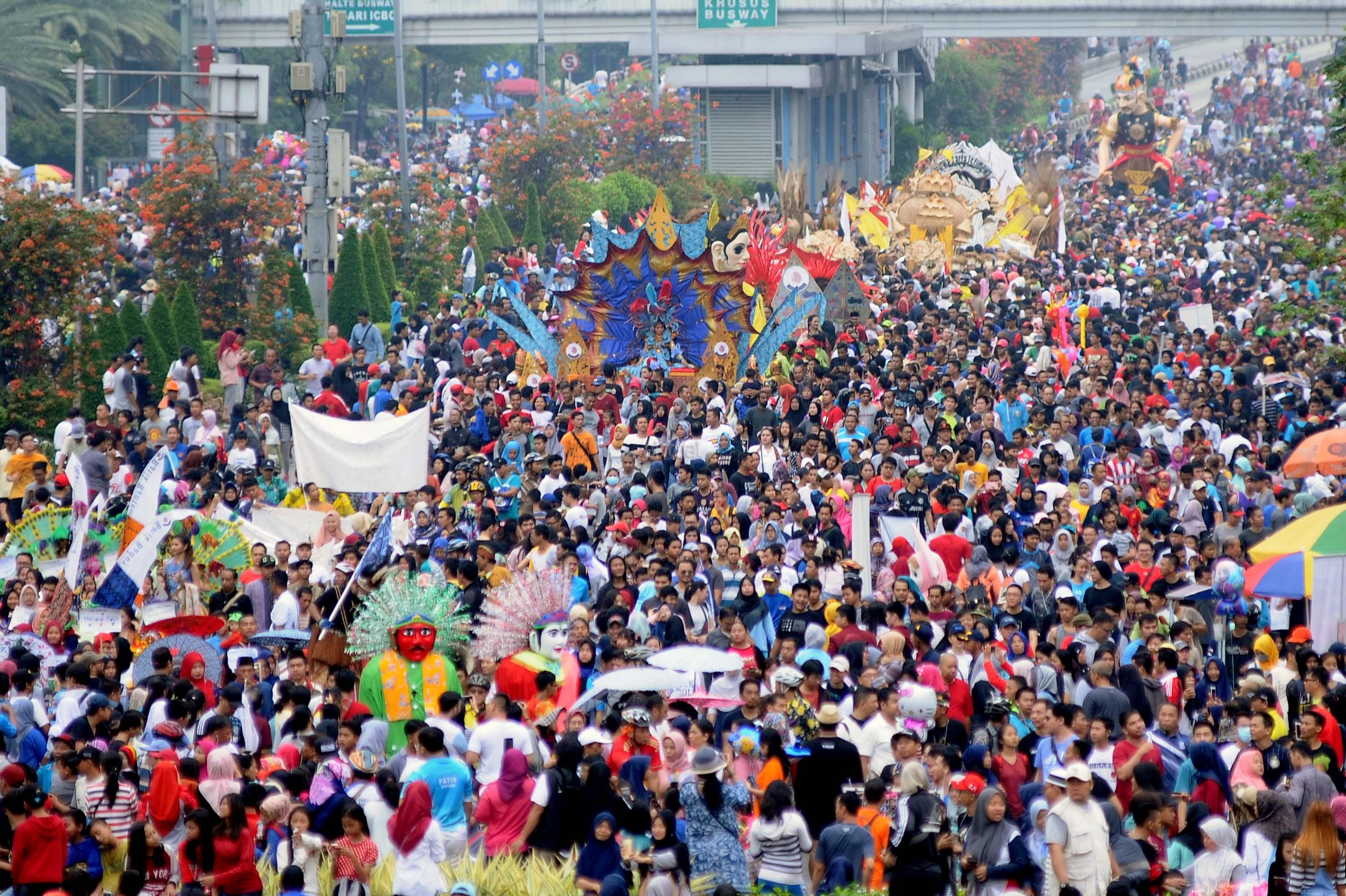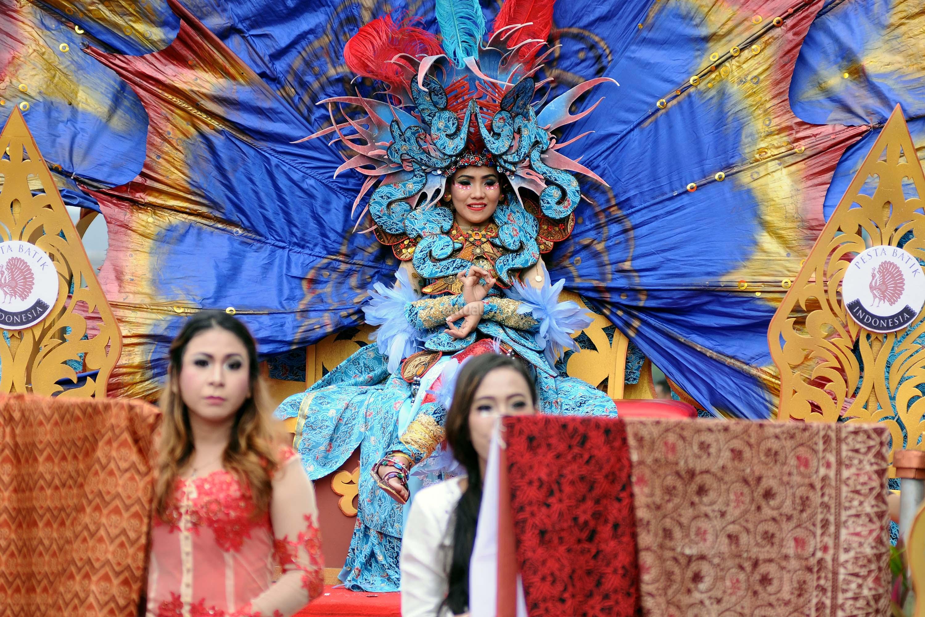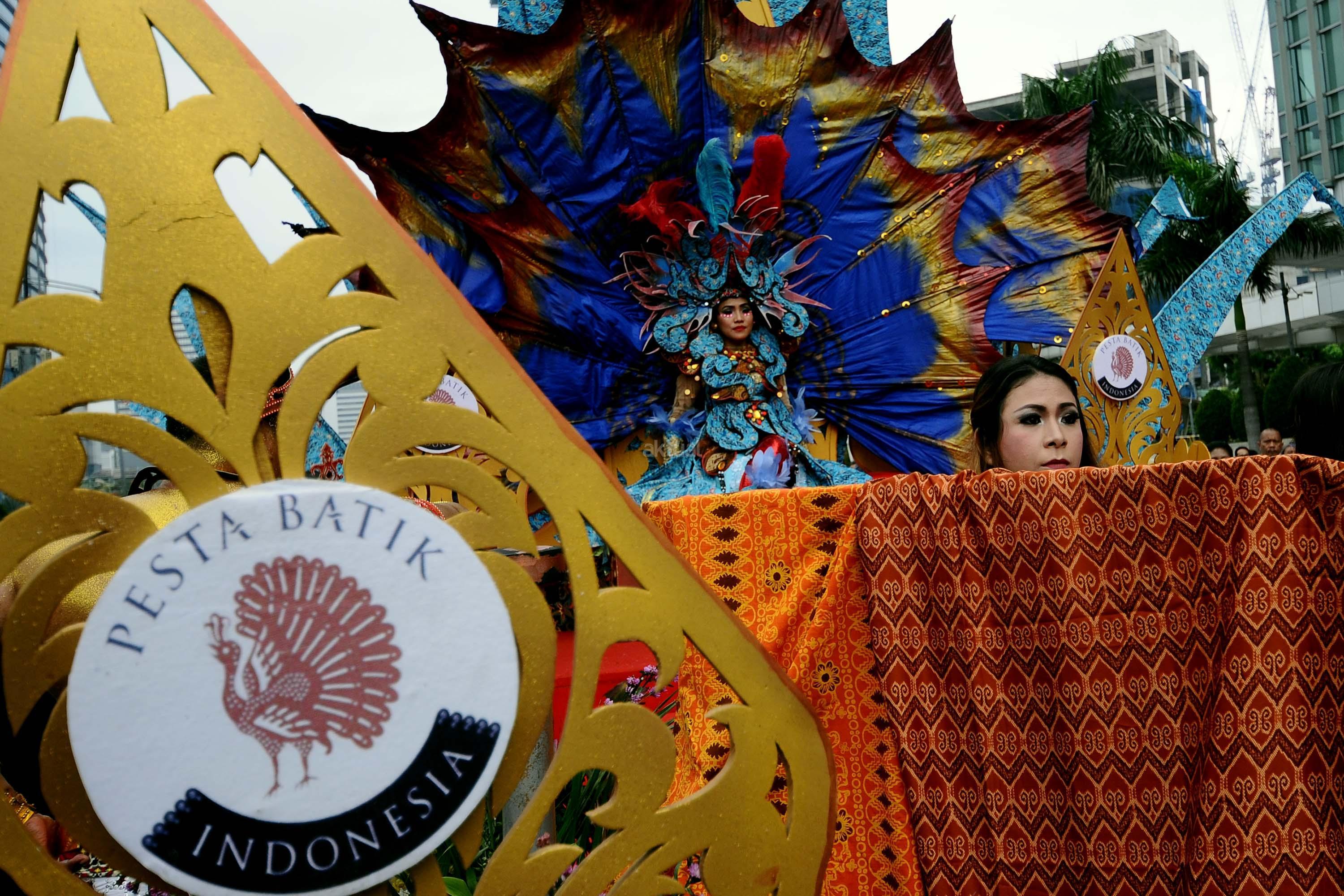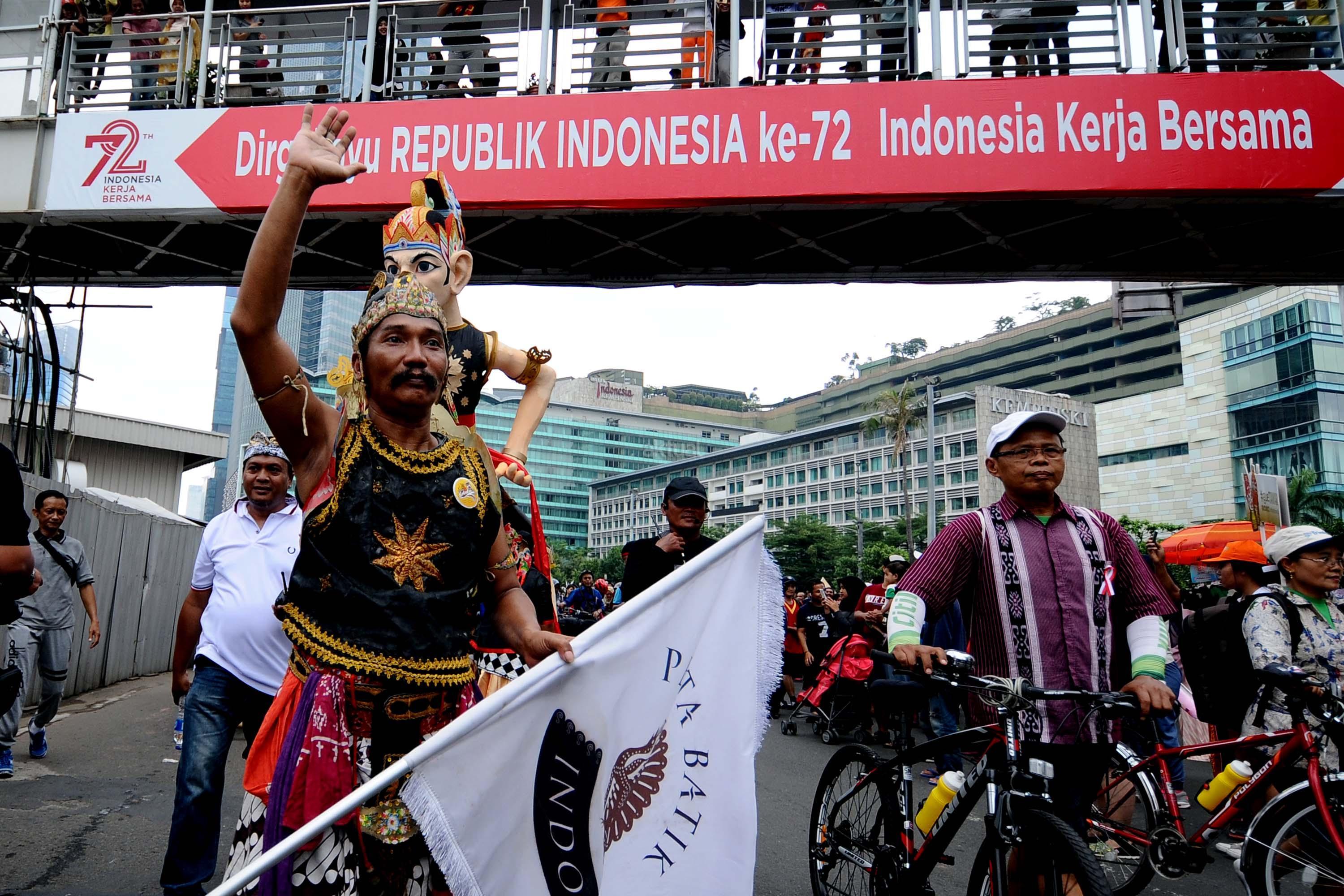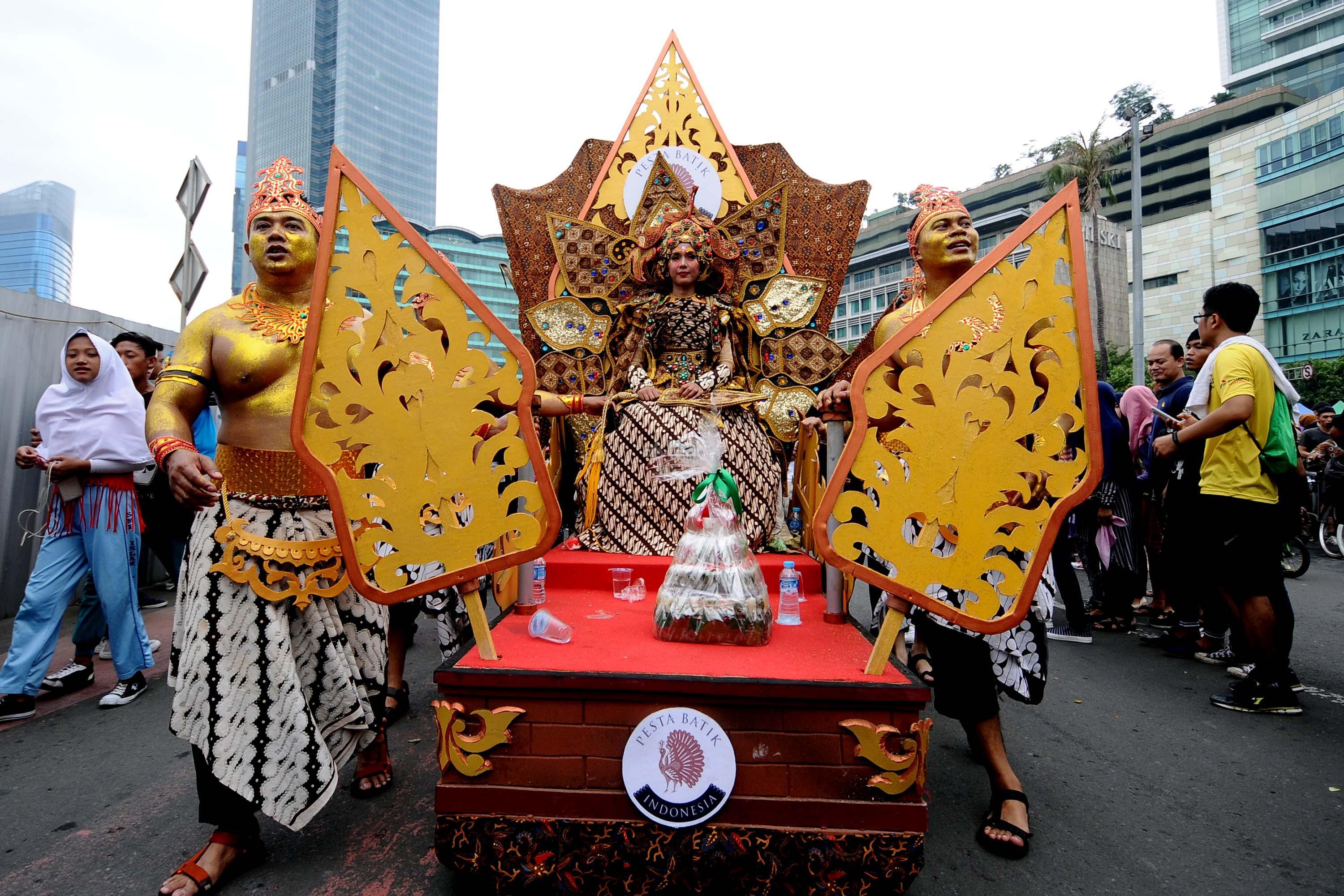 Peserta pawai perayaan Hari Batik Nasional berusaha menembus kerumunan warga saat Hari Bebas Kendaraan di kawasan Bundaran HI, Jakarta, Minggu (1/10/2017). Parade Batik Nusantara ini perayaan Hari Batik Nasional 2 Oktober. AKTUAL/Munzir