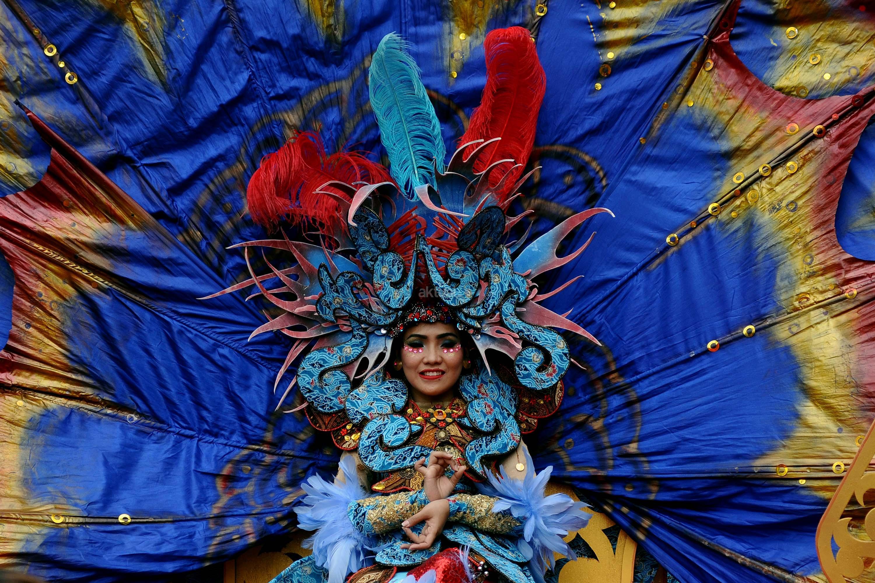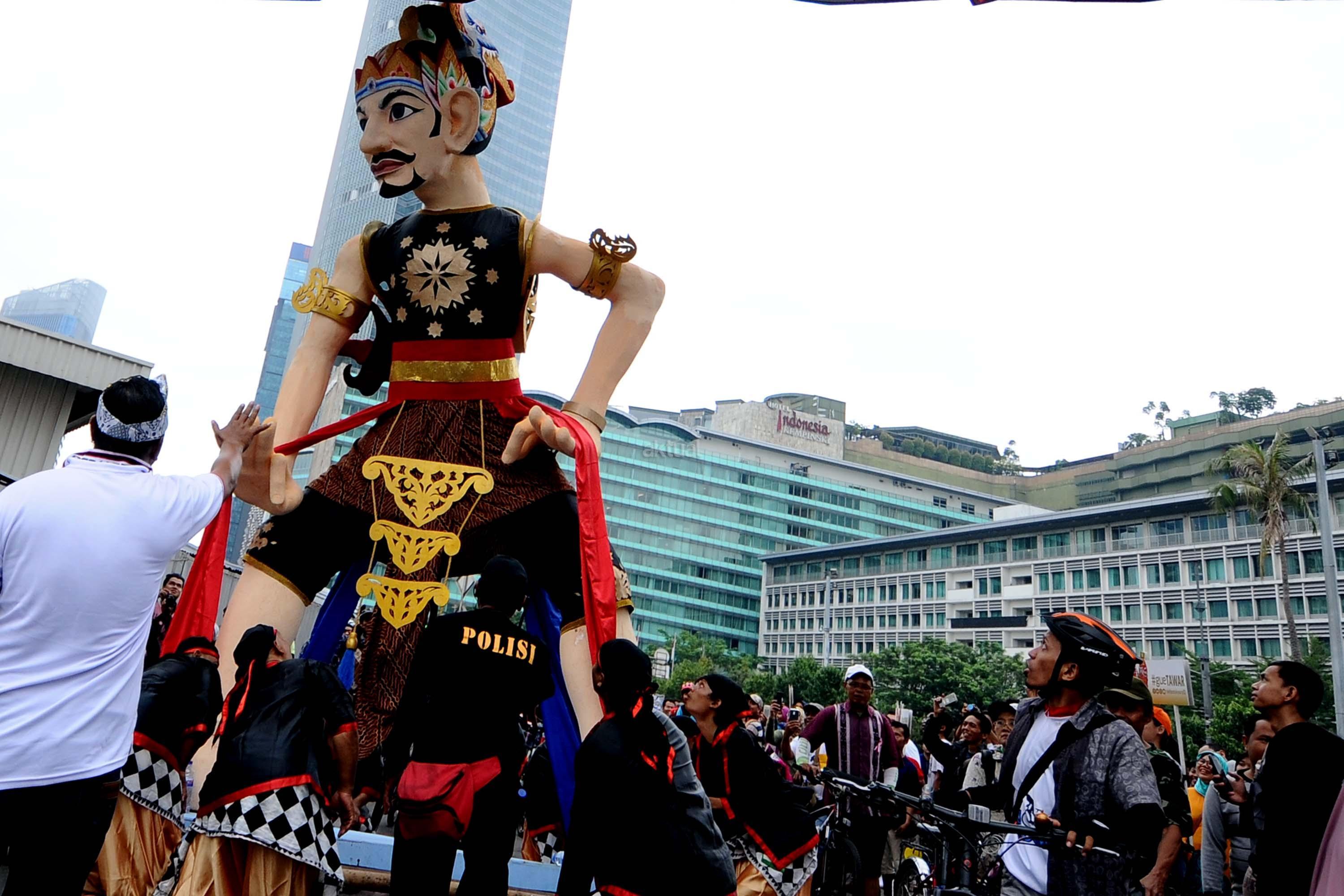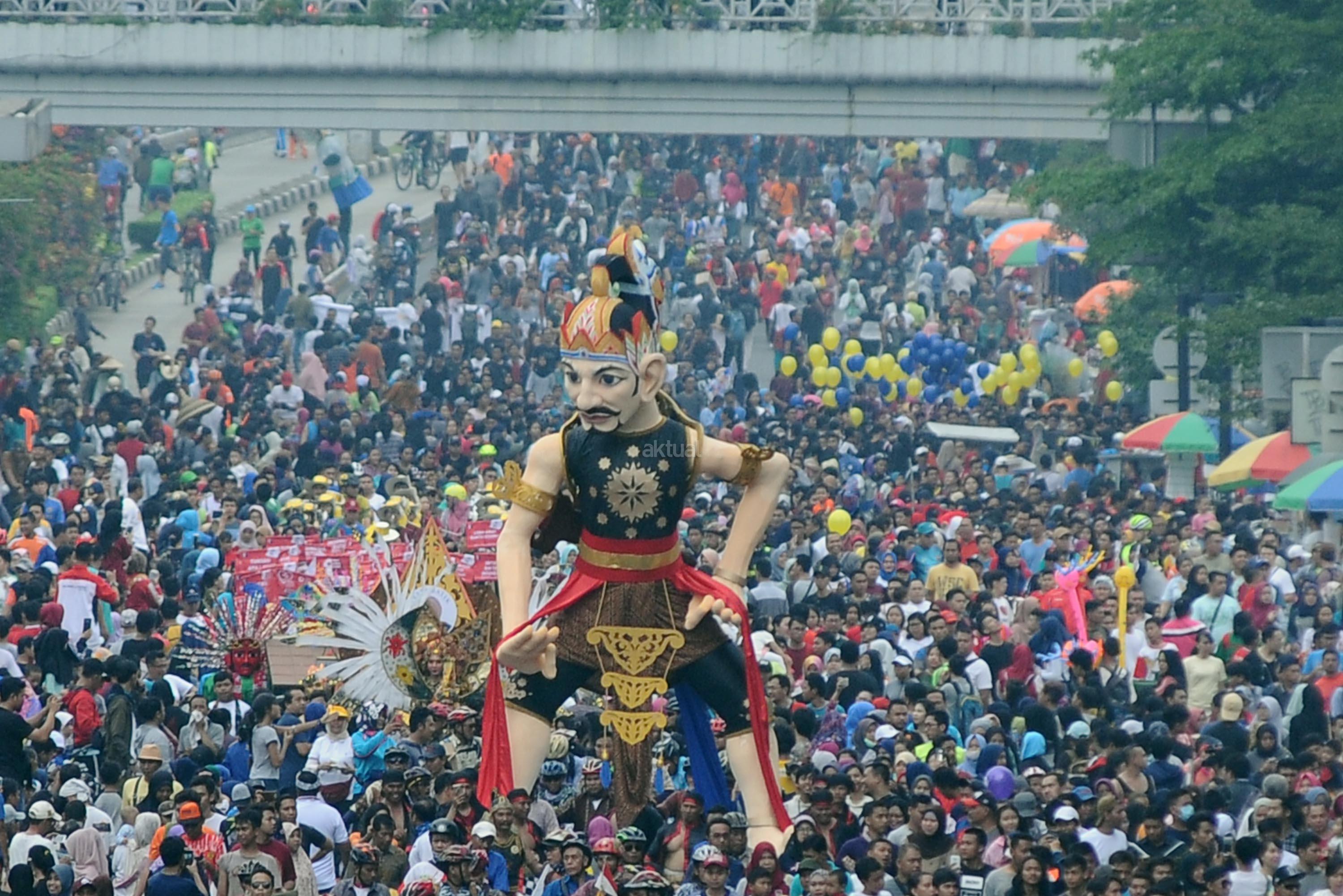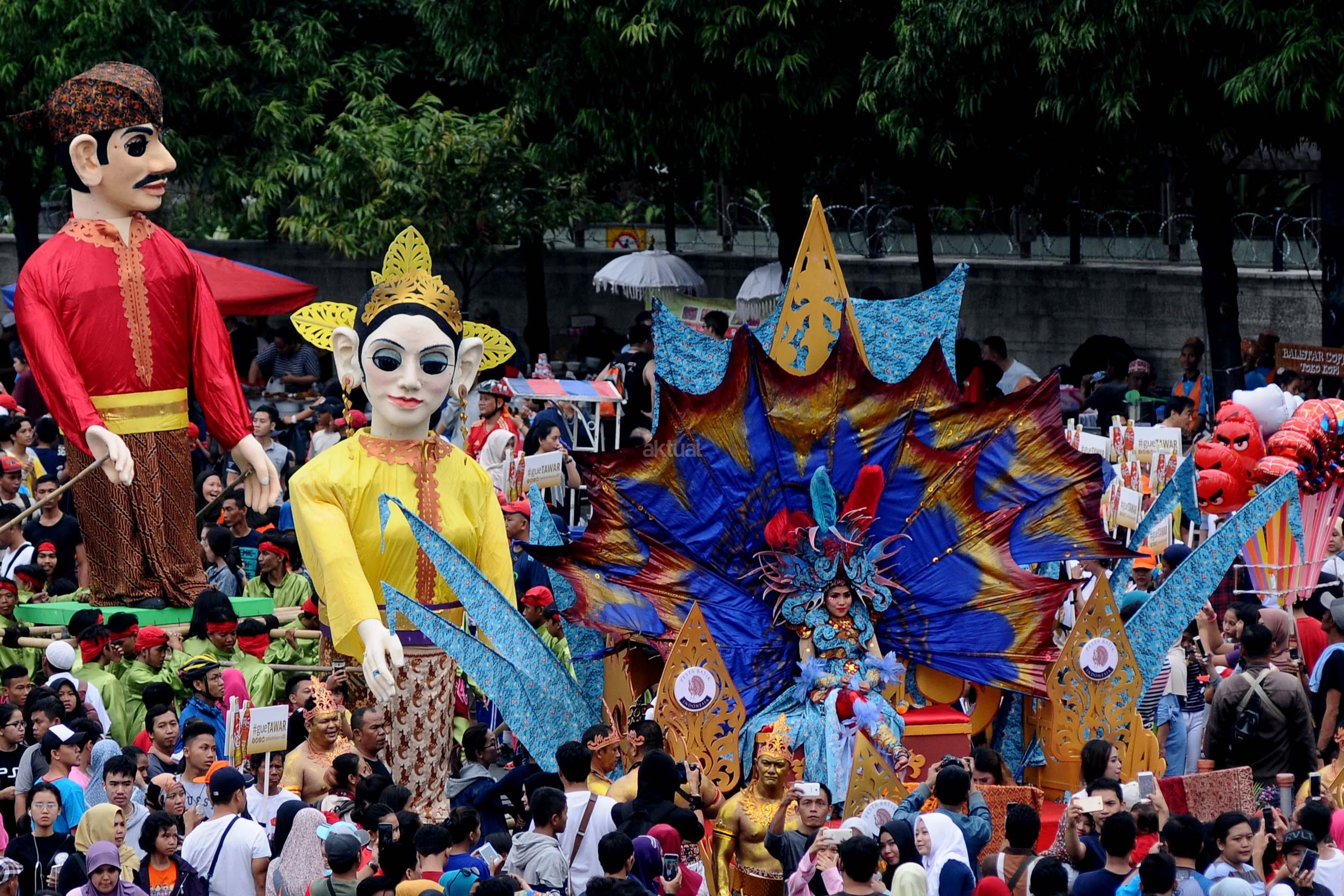 Peserta pawai perayaan Hari Batik Nasional berusaha menembus kerumunan warga saat Hari Bebas Kendaraan di kawasan Bundaran HI, Jakarta, Minggu (1/10/2017). Parade Batik Nusantara ini perayaan Hari Batik Nasional 2 Oktober. AKTUAL/Munzir