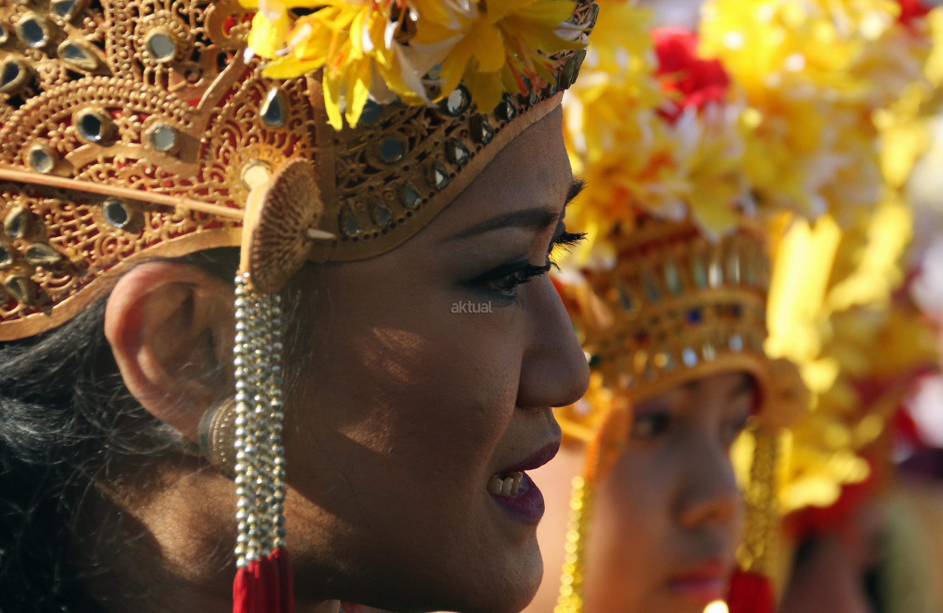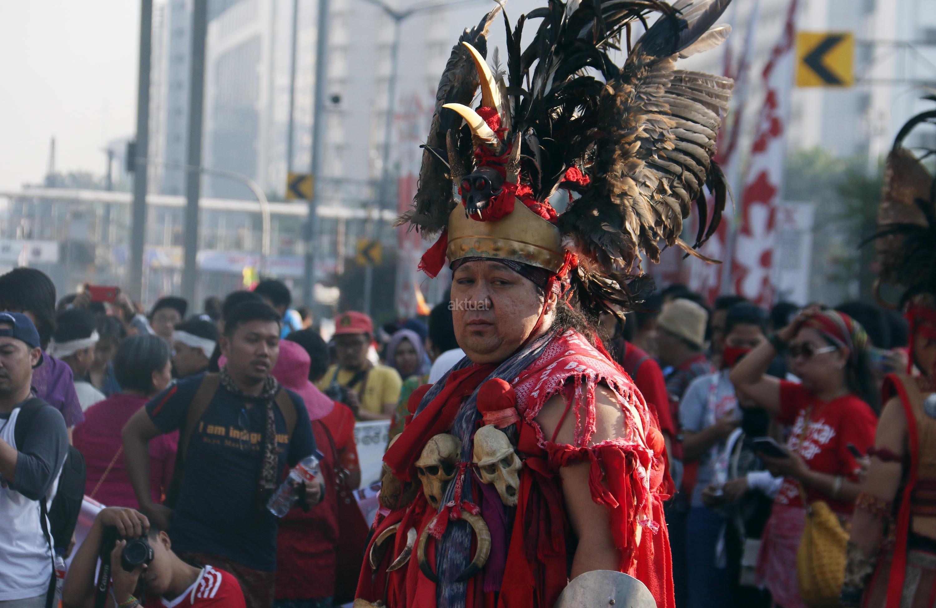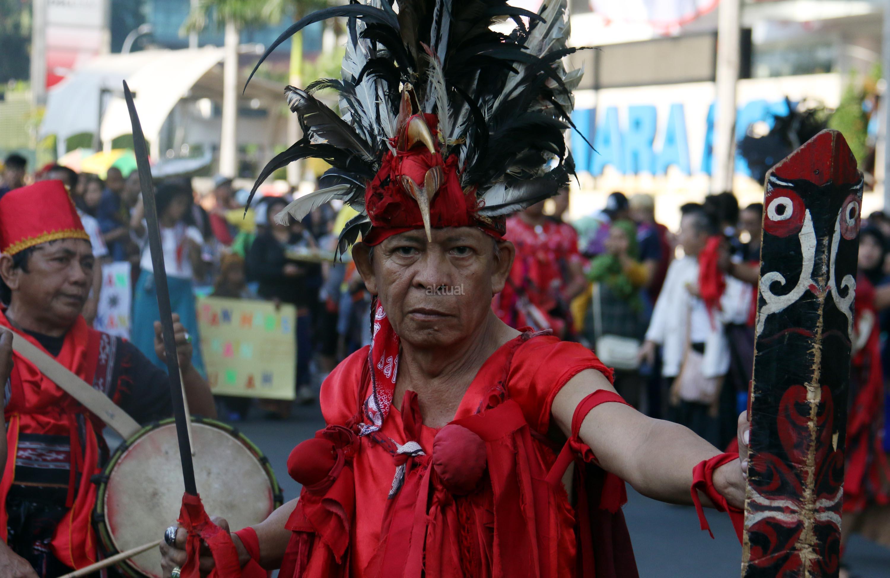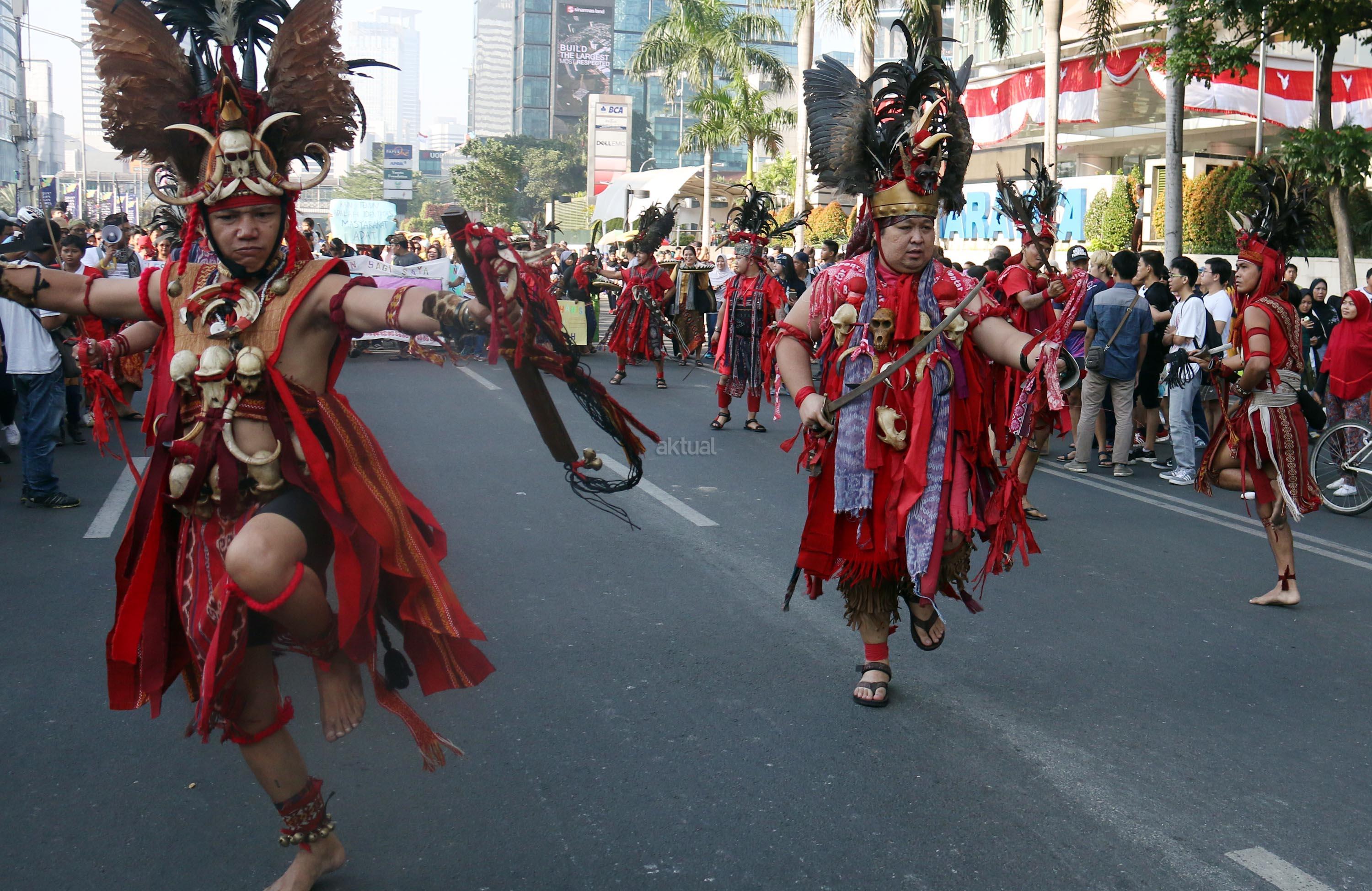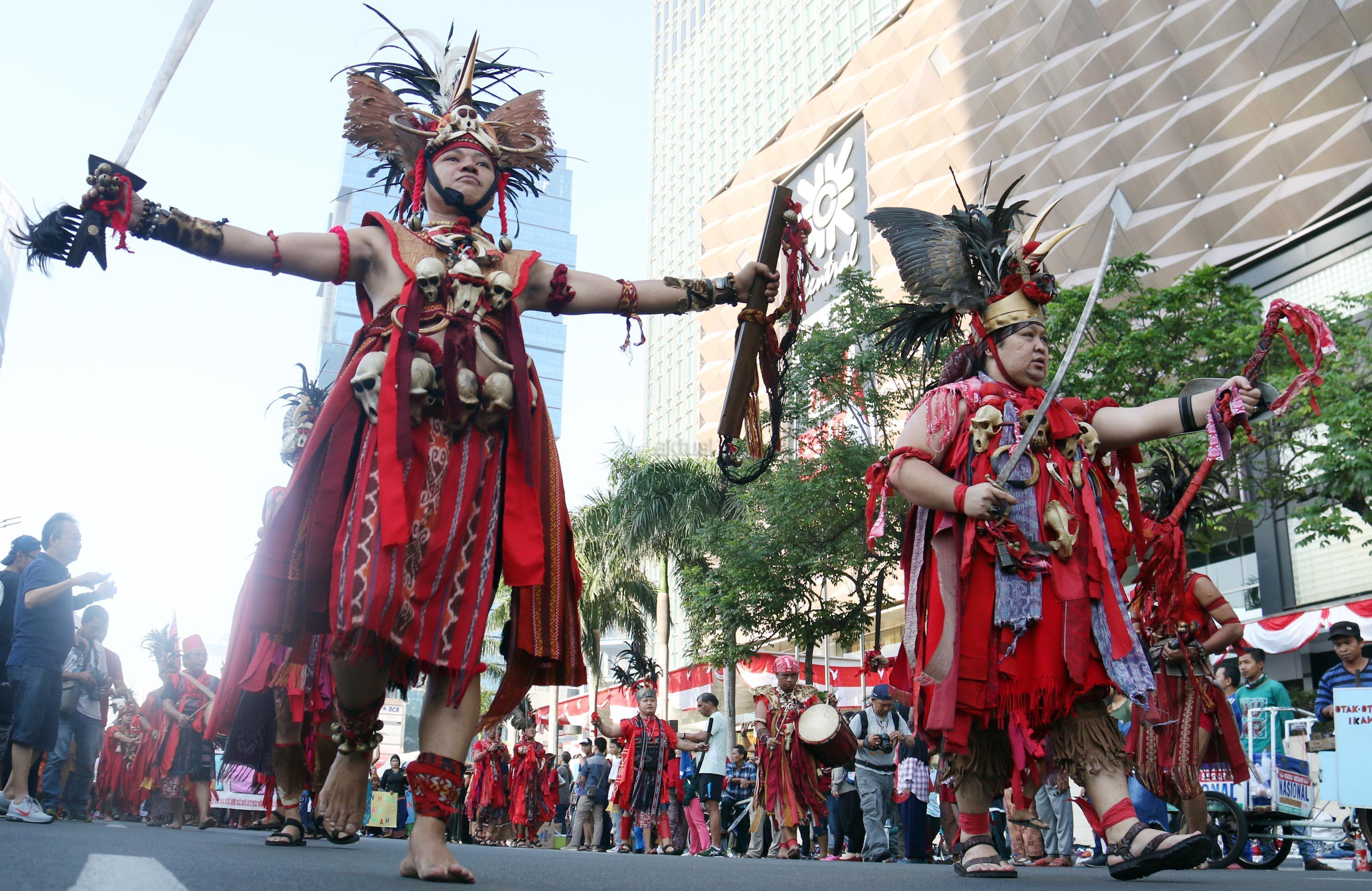 Peserta pawai Parade Kain Nusantara saat berkeliling di Kawasan Bundaran HI, Jakarta, Minggu (27/8/2017). Rangkaian acara yang digelar oleh Aliansi Masyarakat Adat Nusantara (AMAN) bersama Kementerian Pendidikan dan Budaya (Kemendikbud) dan Komnas HAM ini untuk memperingati Hari International Masyarakat Adat Sedunia. AKTUAL/Munzir