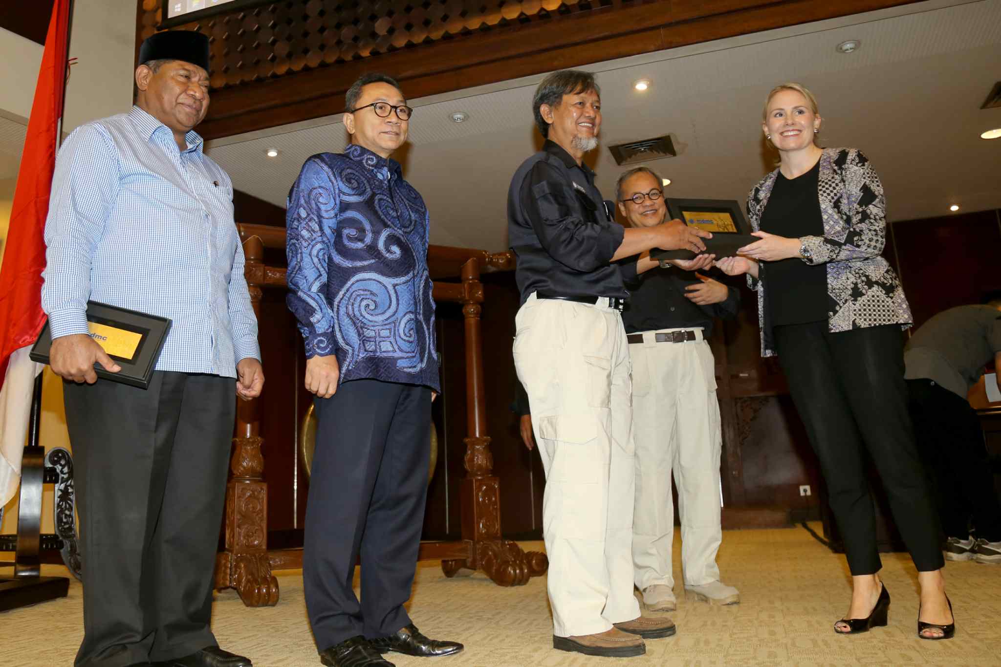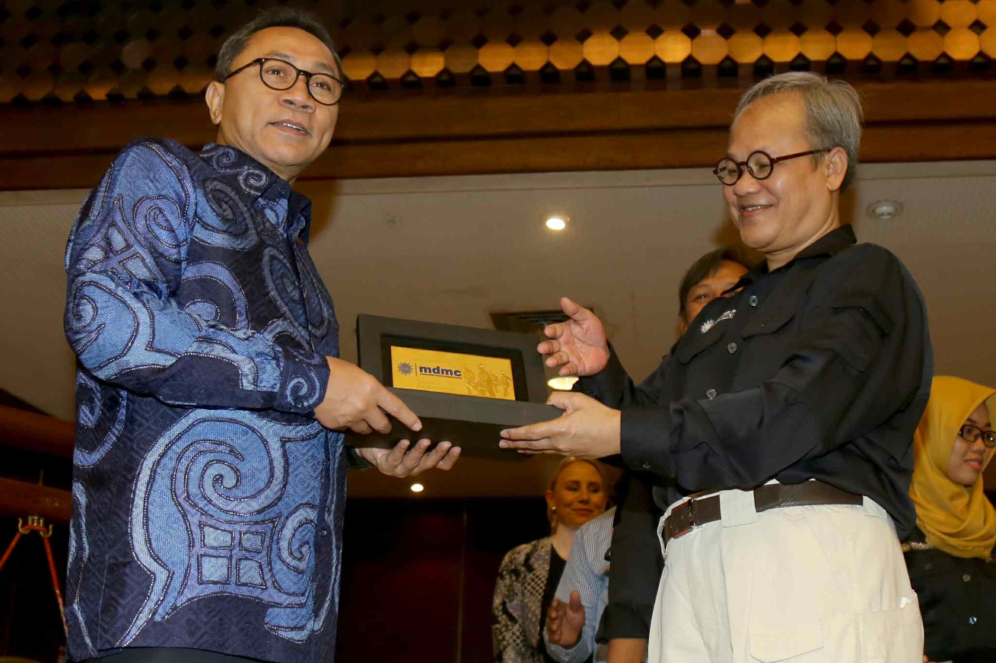 Ketua MPR Zulkifli Hasan menerima cinderamata dari Ketua Muhammadiyah Disarter Management Center (MDMC) Hajriyanto Y Thohari seusai membuka seminar dan lokakarya nasional dengan tema ‘Paradigma Baru Implementasi Rumah Sakit Siaga Bencana di Indonesia’ di Nusantara V, Gedung Parlemen Senayan, Jakarta, Kamis (1/9). Seminar tersebut membahas persiapan, kesiapsiagaan rumah sakit dan kesiapan masyarakat dalam kedaruratan dan bencana di Indonesia. AKTUAL/TINO OKTAVIANO
