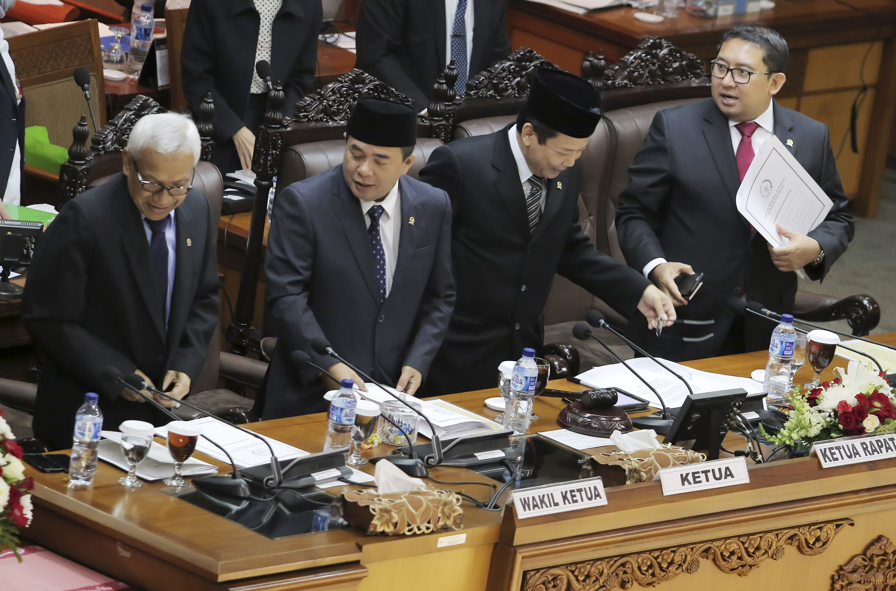 Ketua DPR Ade Komarudin (kedua kiri) didampingi Wakil Ketua DPR Fadli Zon (kedua kanan), Agus Hermanto (kiri), serta Taufik Kurniawan (kedua kanan) memimpin Rapat Paripurna membahas RUU tentang pertanggungjawaban atas APBN 2015 di Kompleks Parlemen Senayan, Jakarta, Senin (25/7). Agenda Paripurna antara lain laporan Banggar atas pendahuluan RAPBN 2017 dan tanggapan Pemerintah atas pandangan fraksi terkait APBN 2015. ANTARA FOTO/Yudhi Mahatma/aww/16.