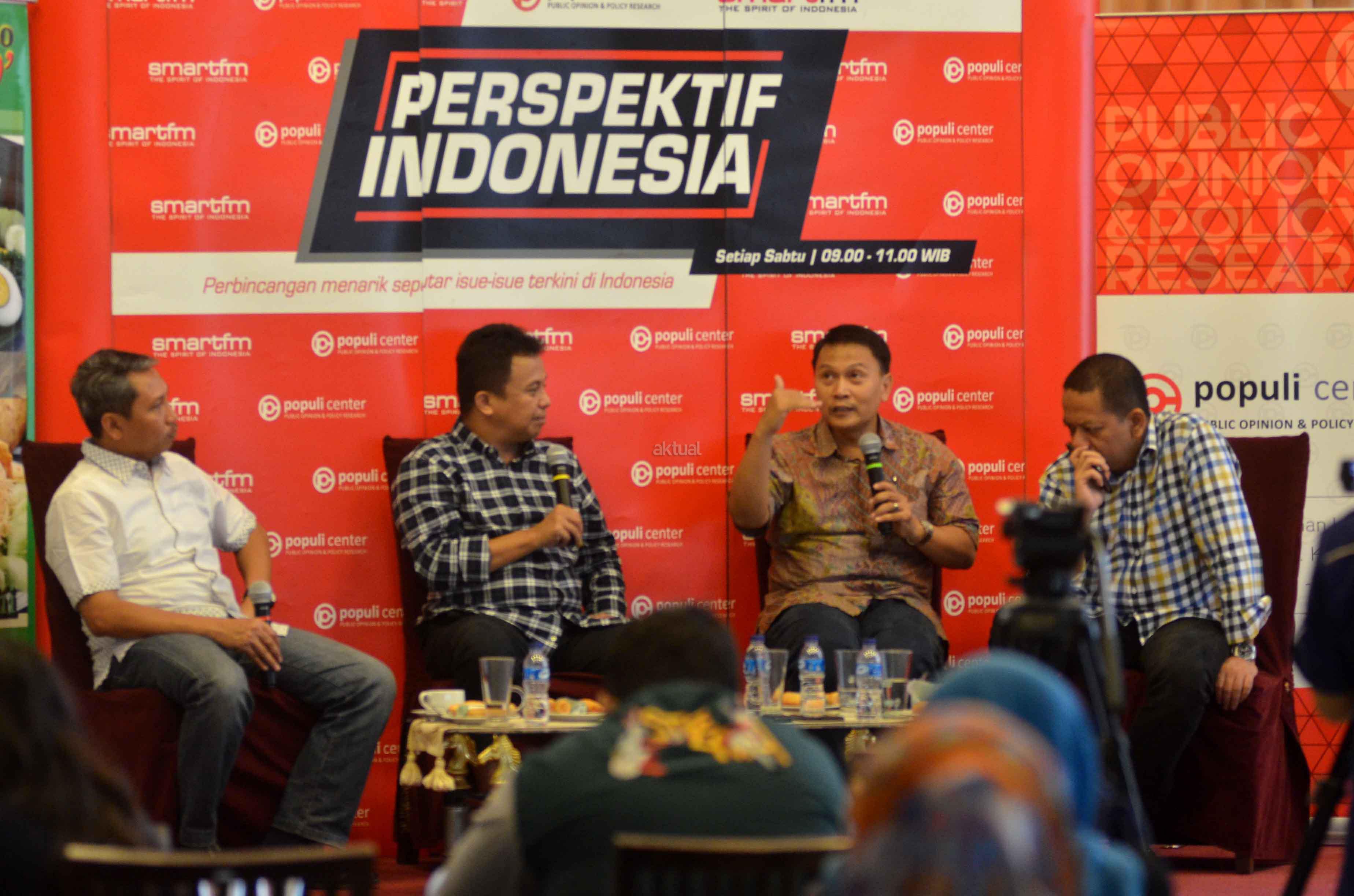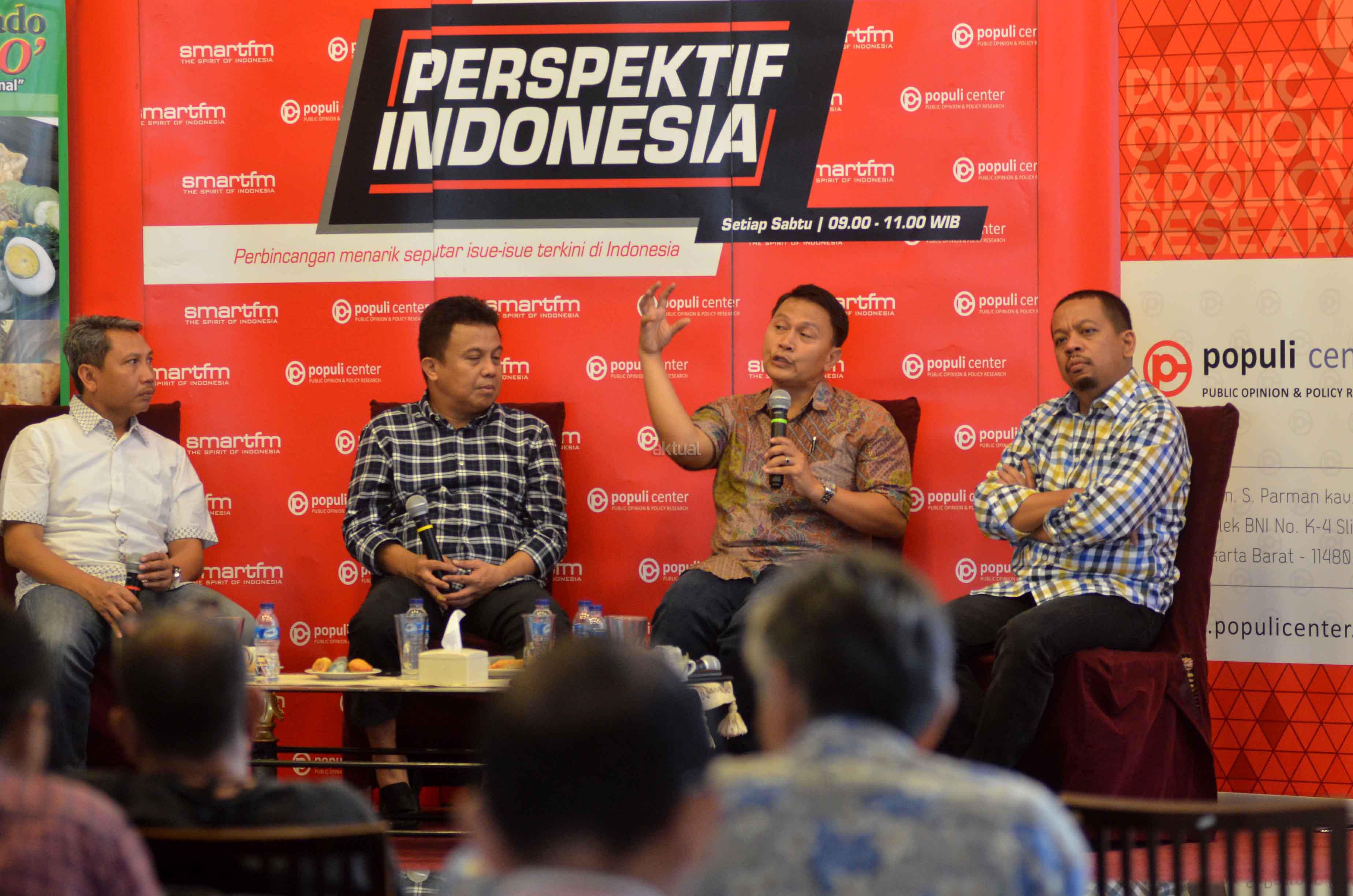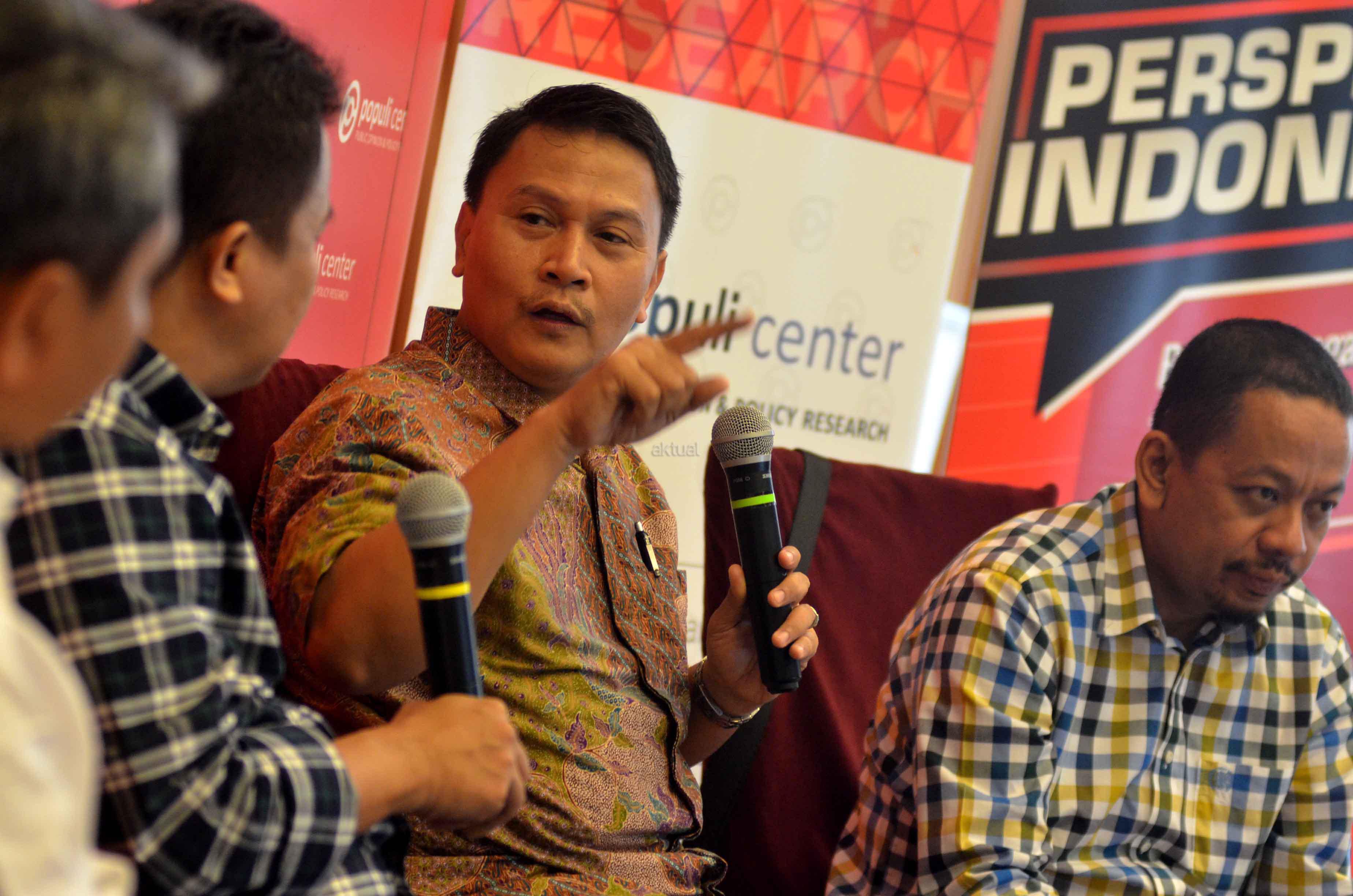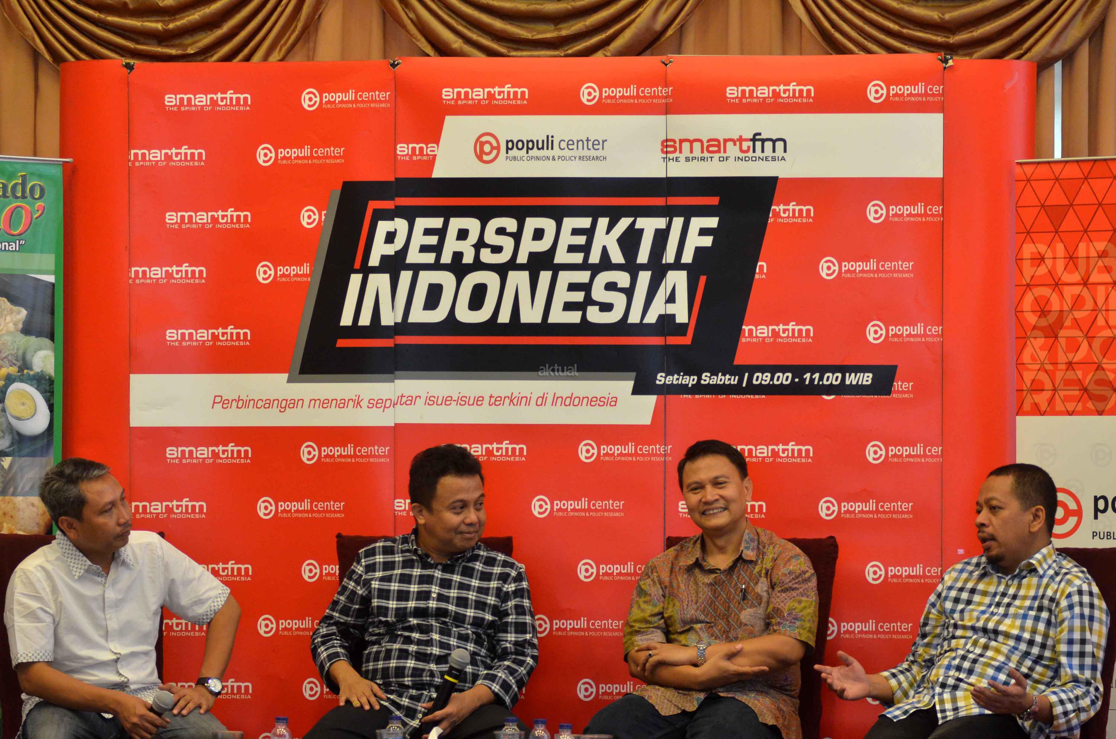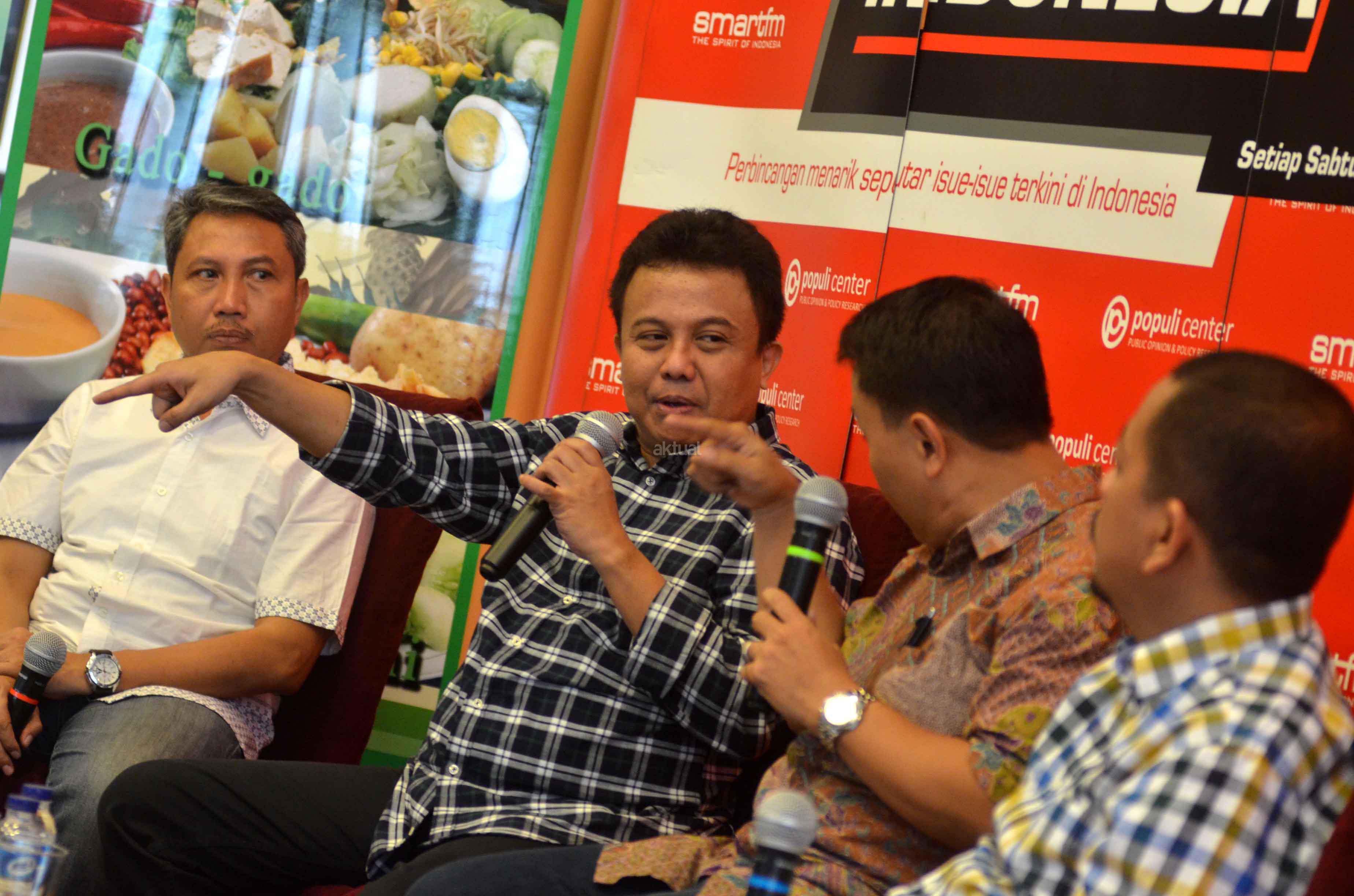 Dari Kiri-Kanan : Ahli Politik Islam Pengajar UIN, Ali Munhanif, Moderator, Ichan Loulembah, Wakil Sekjen DPP PKS, Mardani Sera dan Direktur Eksekutif IndoBarometer, Mohamad Qodari saat menjadi pembicara di Prespektif Indonesia, Jakarta, Sabtu (7/10/2015). diskui tersebut dengan tema "Partai Dakwah Sedang Berbenah" di tengah keriuhan politik nasional, Partai Keadilan Sejahtera (PKS) melakukan perombakan struktur dan personalia kepengurusannya.