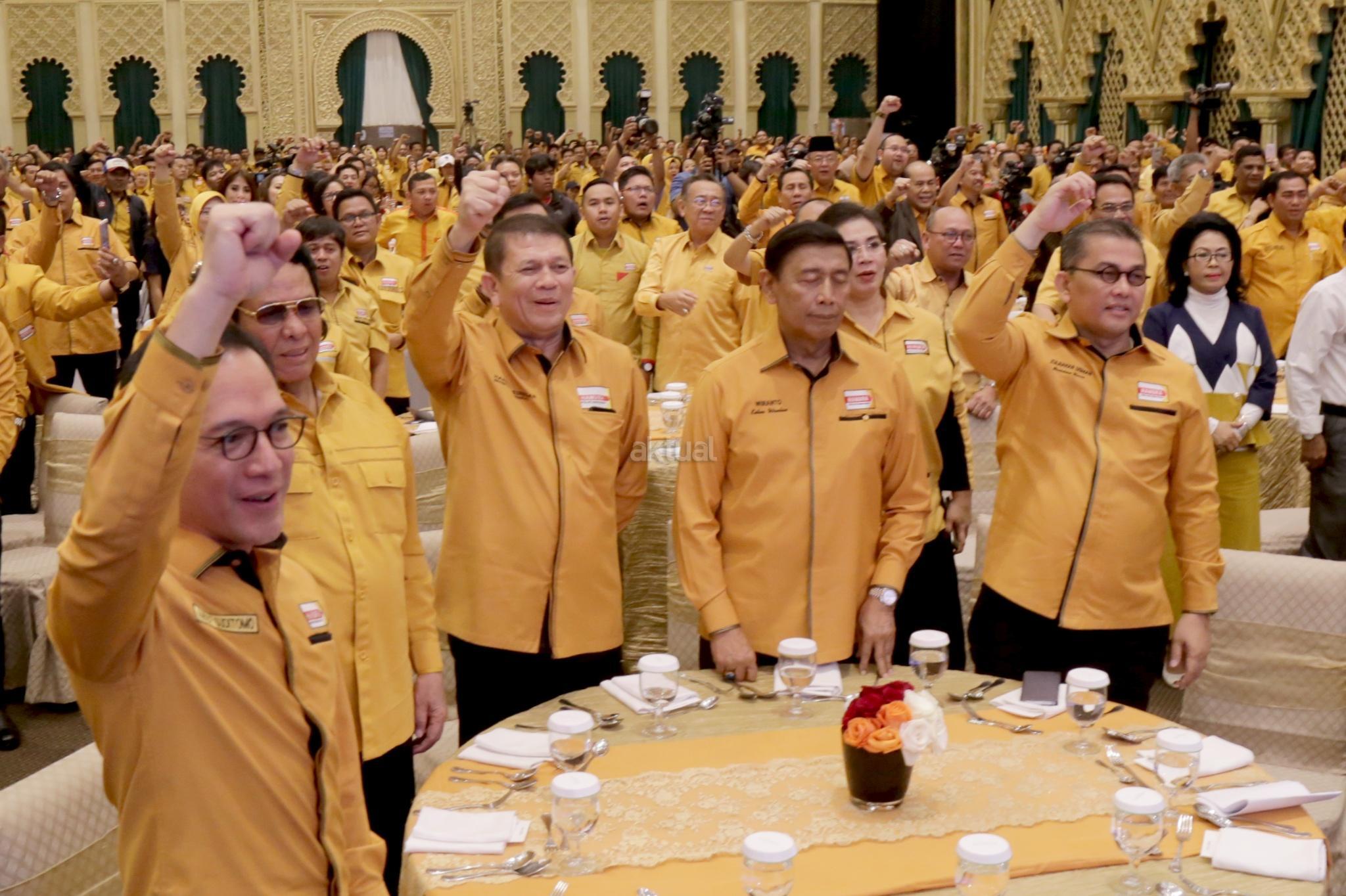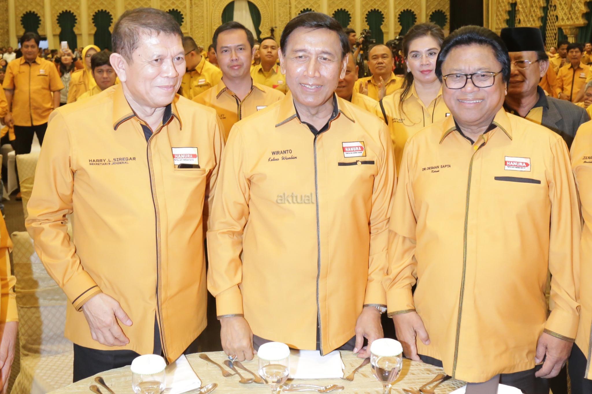 Ketua Umum Partai Hanura Oesman Sapta Odang (OSO), Ketua Dewan Pembina Partai Hanura Wiranto dan Sekjen Partai Hanura Herry Lontung saat acara syukuran partai di kediaman OSO, Jalan Karang Asem Utara, Kuningan Timur, Jakarta Selatan, Kamis (22/2/2018). Partai Hanura resmi mencalonkan Wiranto sebagai calon wakil presiden di Pilpres 2019, yang disampaikan langsung oleh Ketum Hanura Oesman Sapta Odang. AKTUAL/Tino Oktaviano