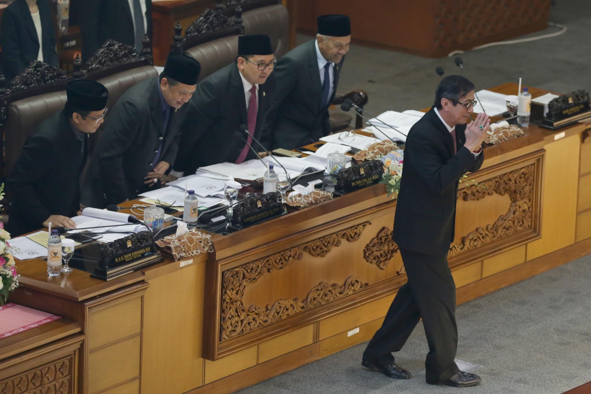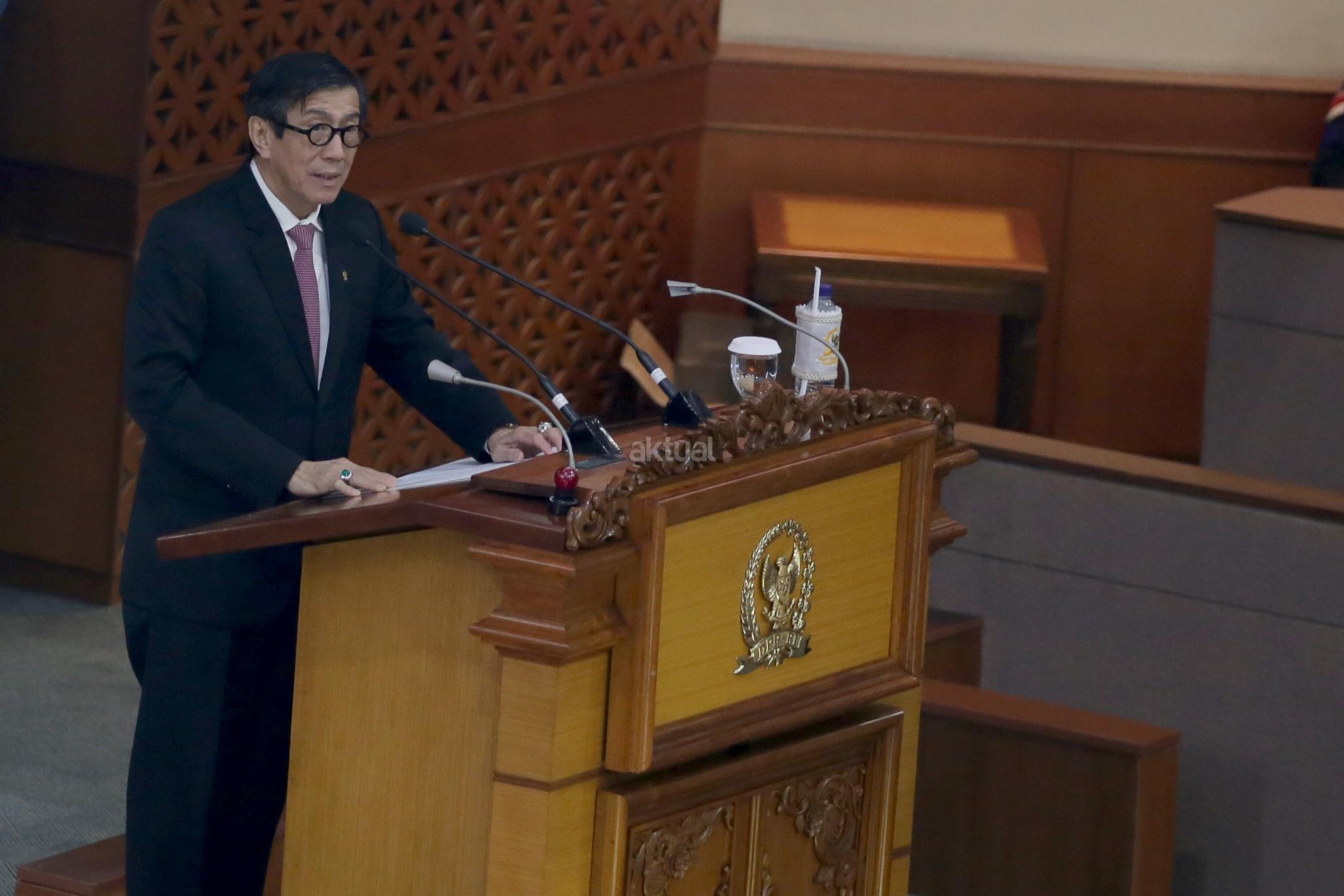 Menteri Hukum dan HAM Yasonna Laolly menyampaikan pandangan akhir pemerintah saat Rapat Paripurna Pengesahan RUU MD3 menjadi UU di gedung Parlemen, Senayan, Jakarta, Senin (12/2/18). Rapat Paripurna DPR resmi mengesahkan RUU No 17/2014 tentang MPR, DPR, DPRD dan DPD menjadi Undang Undang. AKTUAL/Tino Oktaviano