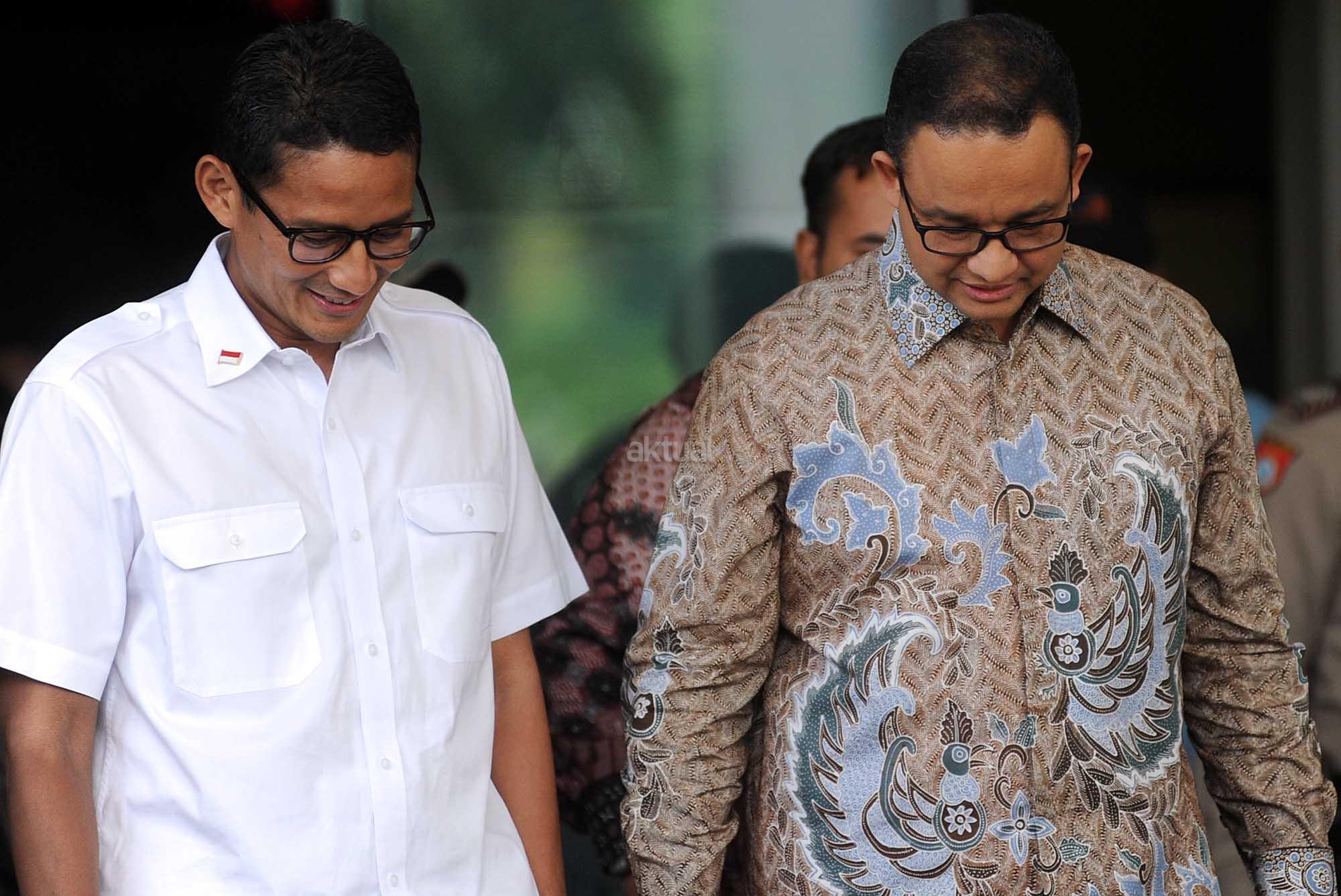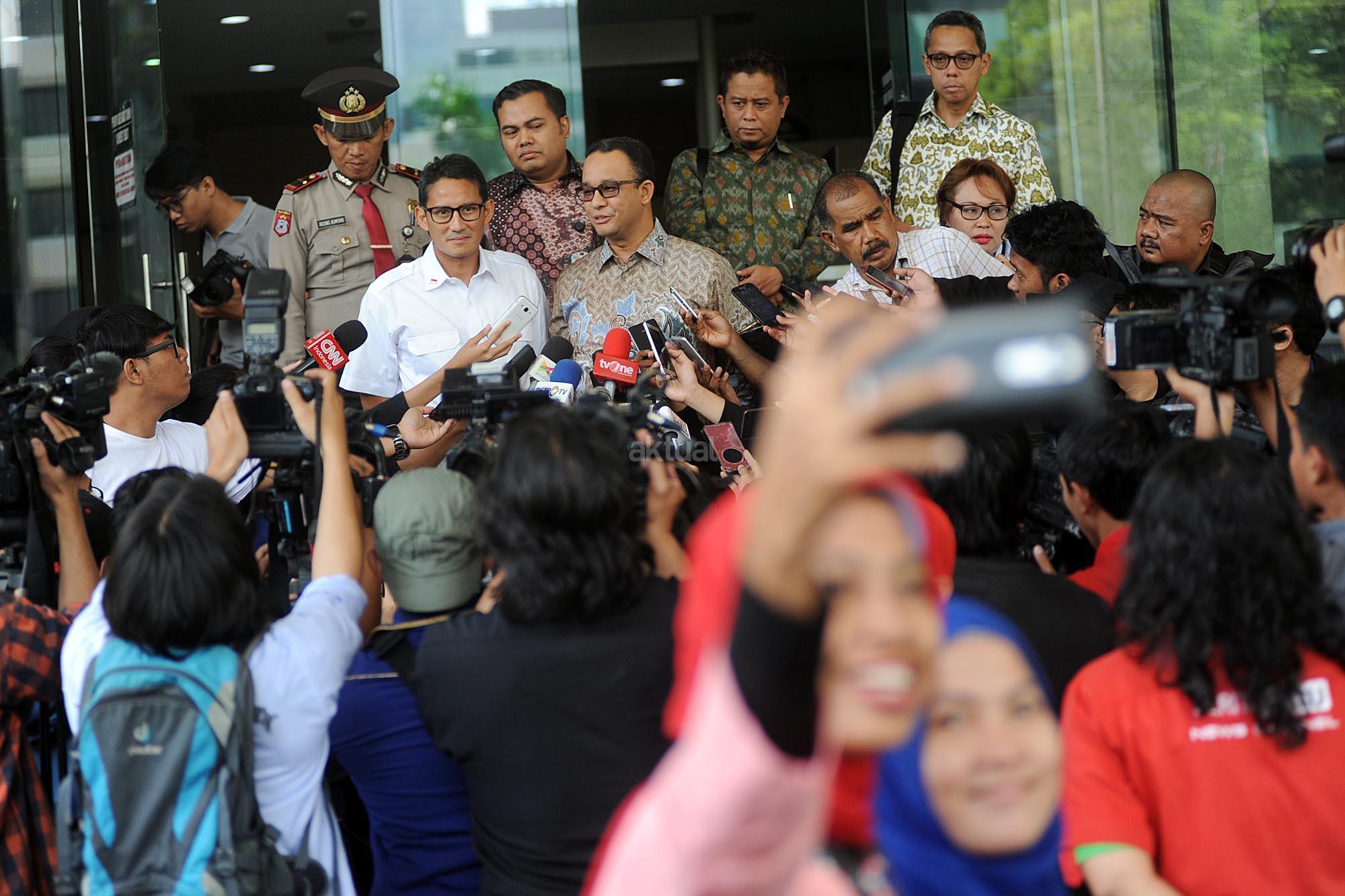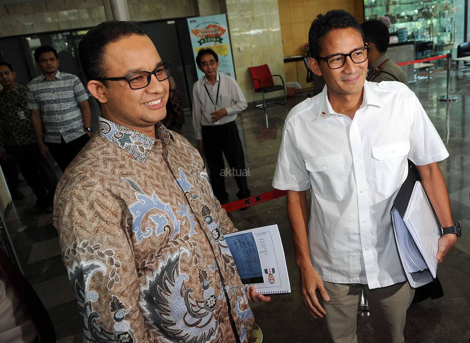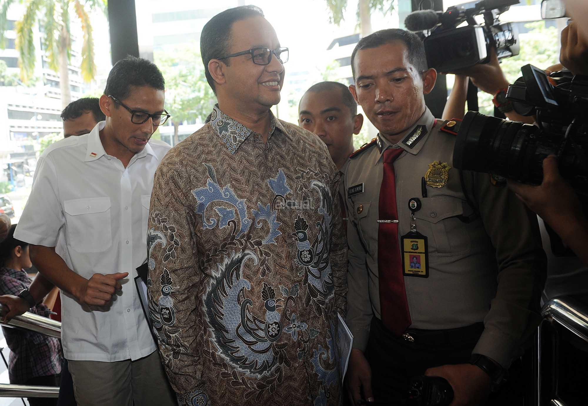 Pasangan Bakal Calon Gubernur dan Wakil Gubernur DKI, Anies Baswedan dan Sandiaga Uno, mendatangi Gedung Komisi Pemberantasan Korupsi (KPK), Jakarta, Kamis (29/9). Sandiaga mengaku kehadirannya untuk menyerahkan Laporan Harta Kekayaan Penyelenggara Negara (LHKPN). Sementara Anies sebelumnya sudah melaporkan harta kekayaannya kepada Lembaga Antikorupsi. Aktual/Tino Oktaviano