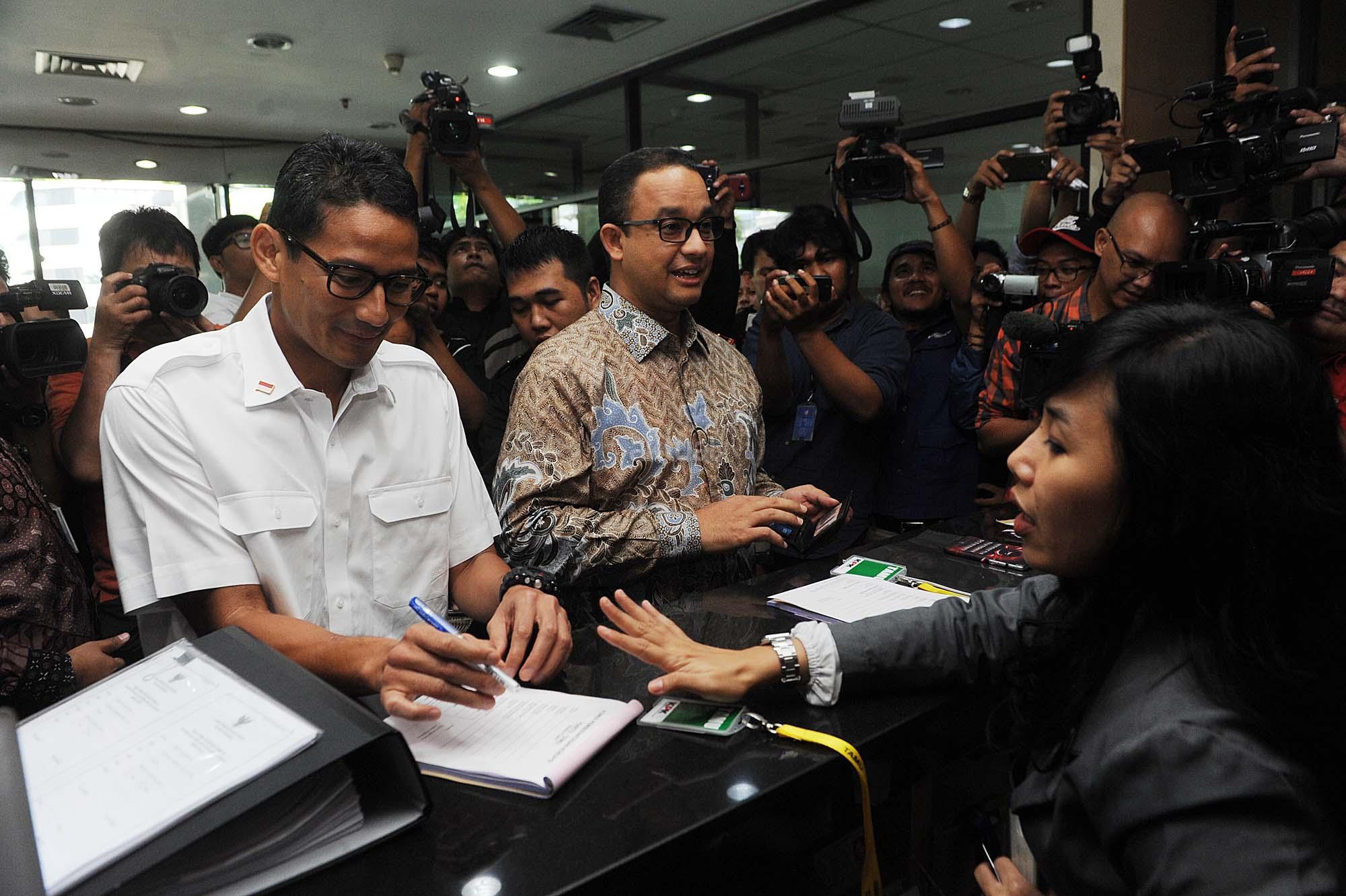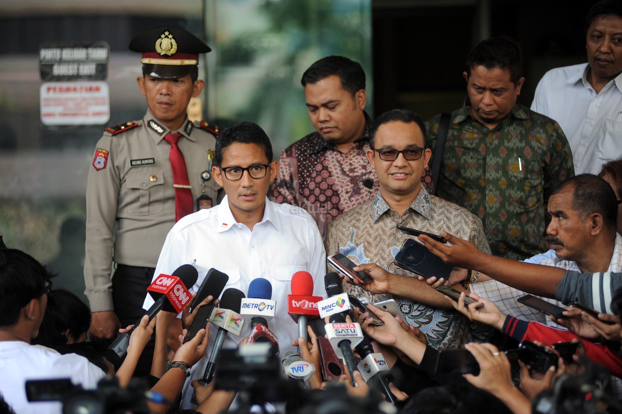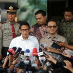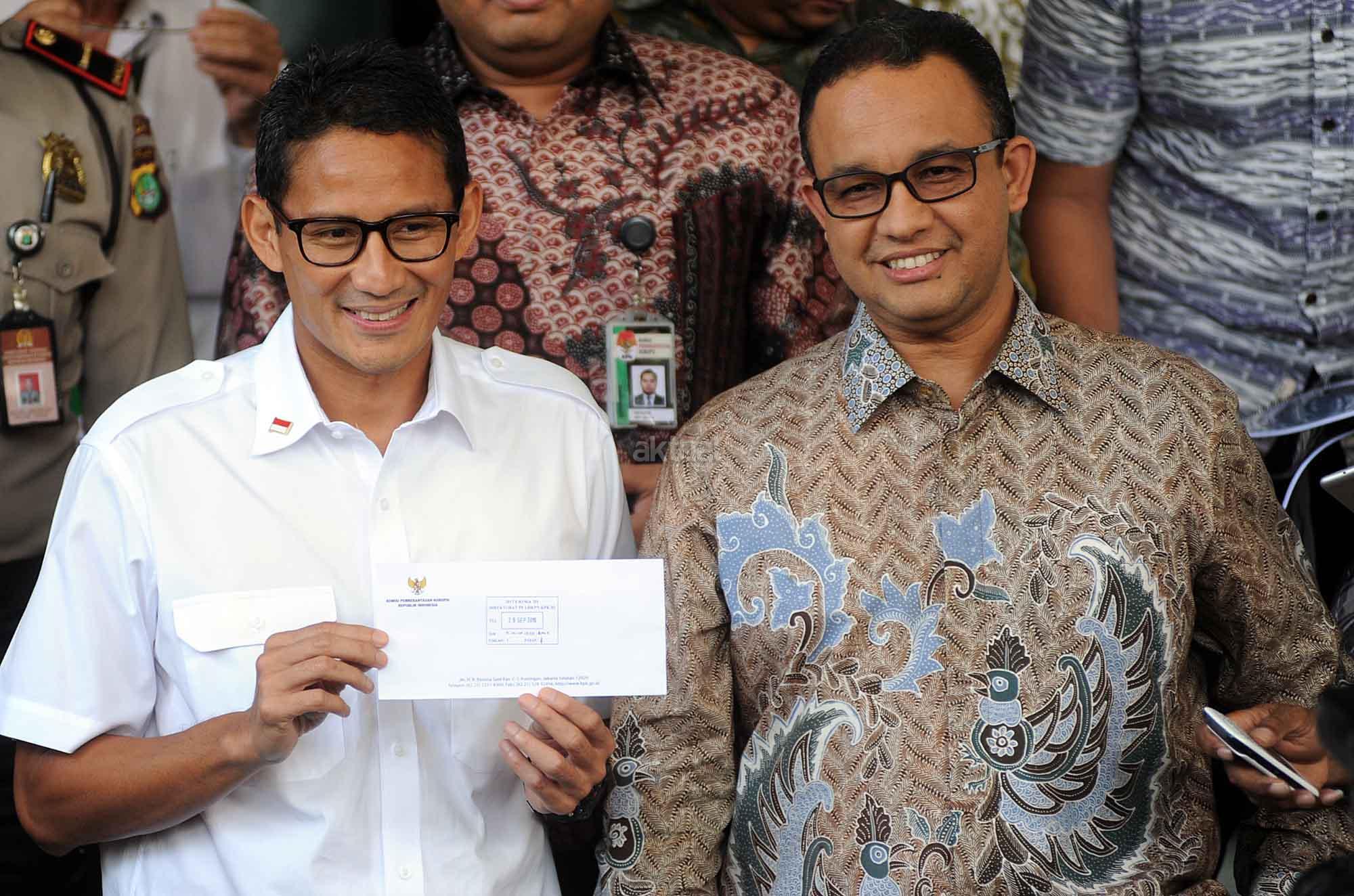 Pasangan Bakal Calon Gubernur dan Wakil Gubernur DKI, Anies Baswedan dan Sandiaga Uno, mendatangi Gedung Komisi Pemberantasan Korupsi (KPK), Jakarta, Kamis (29/9). Sandiaga mengaku kehadirannya untuk menyerahkan Laporan Harta Kekayaan Penyelenggara Negara (LHKPN). Sementara Anies sebelumnya sudah melaporkan harta kekayaannya kepada Lembaga Antikorupsi. Aktual/Tino Oktaviano