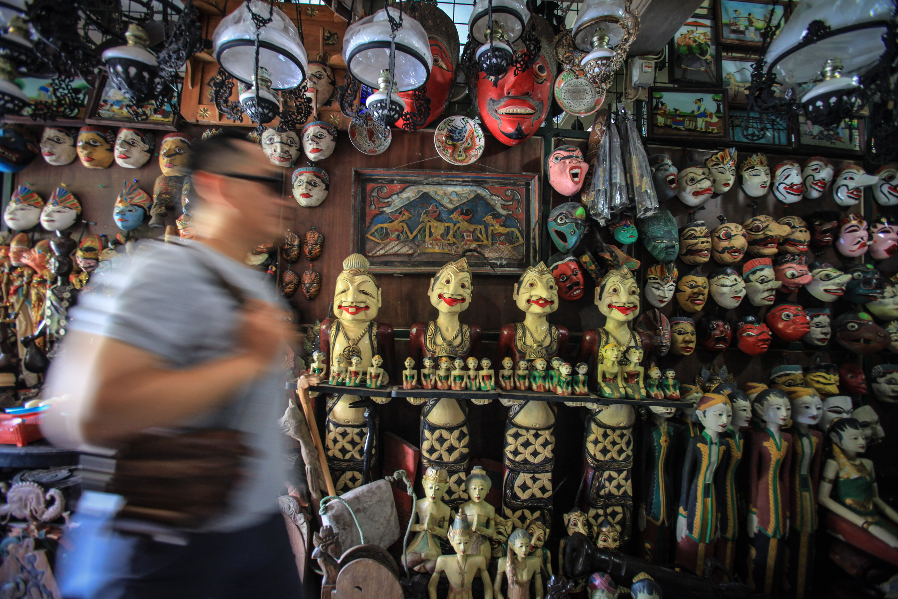 Pengunjung melihat-lihat barang antik dan kuno yang dijual di Pasar Windujenar, kawasan Ngarsopuro, Solo, Jawa Tengah, Senin (9/5). Pasar antik Windujenar di kawasan Ngarsopuro merupakan salah satu tempat wisata andalan Kota Solo yang menjual berbagai souvenir berupa barang-barang antik dan kuno seperti peralatan rumah tangga zaman dulu, barang-barang elektronik kuno, uang-uang kuno, dan patung-patung. ANTARA FOTO/Maulana Surya/aww/16.