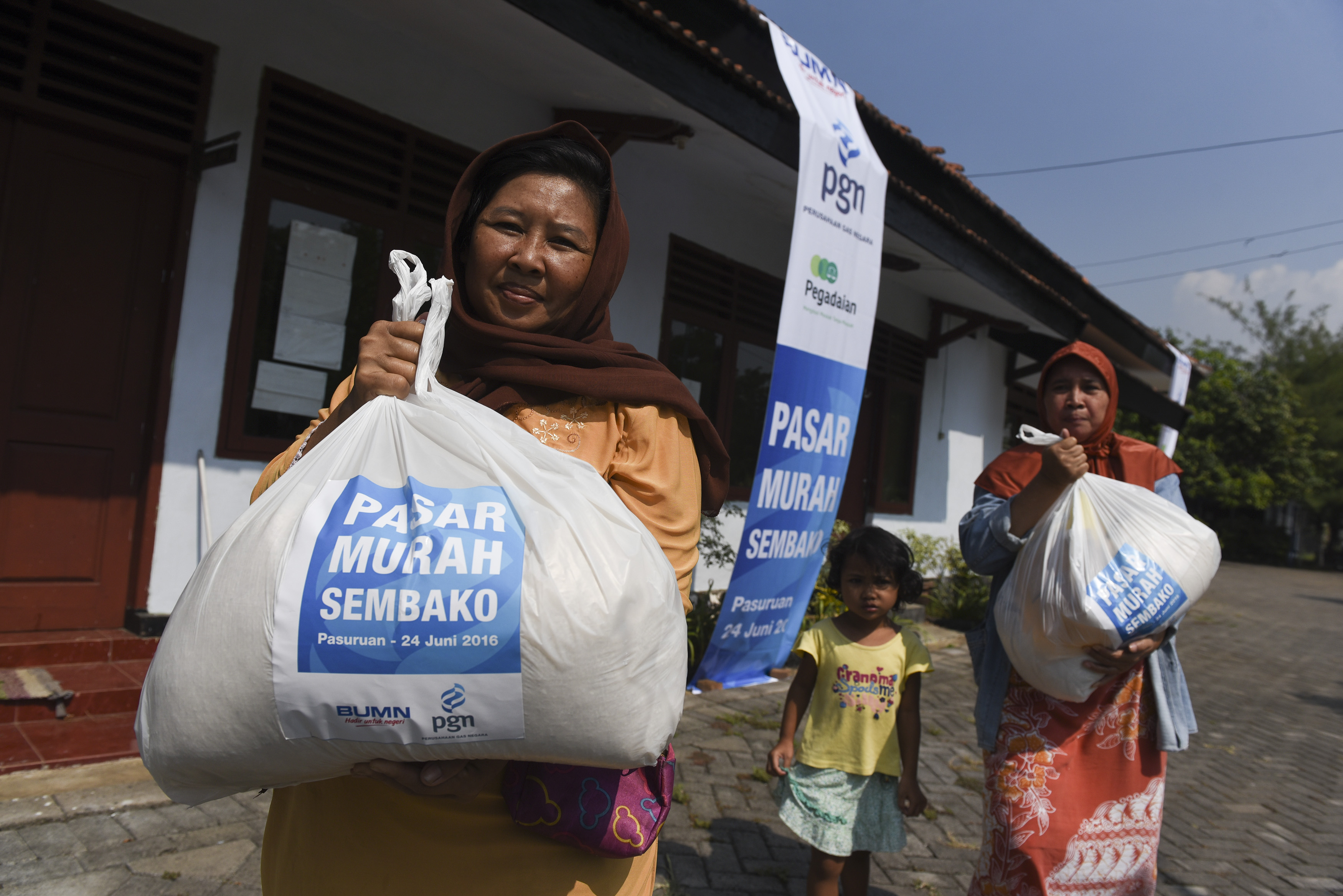 Warga membawa bungkusan yang berisi sembako hasil penukaran kupon paket sembako saat digelar pasar murah sembako PGN di Pasuruan, Jawa Timur, Jumat (24/6). Pasar murah tersebut digelar guna membantu warga memenuhi kebutuhan pokoknya di bulan Ramadan dengan harga murah serta mengantisipasi lonjakan harga barang kebutuhan pokok di pasaran. ANTARA FOTO/Zabur Karuru/foc/16.