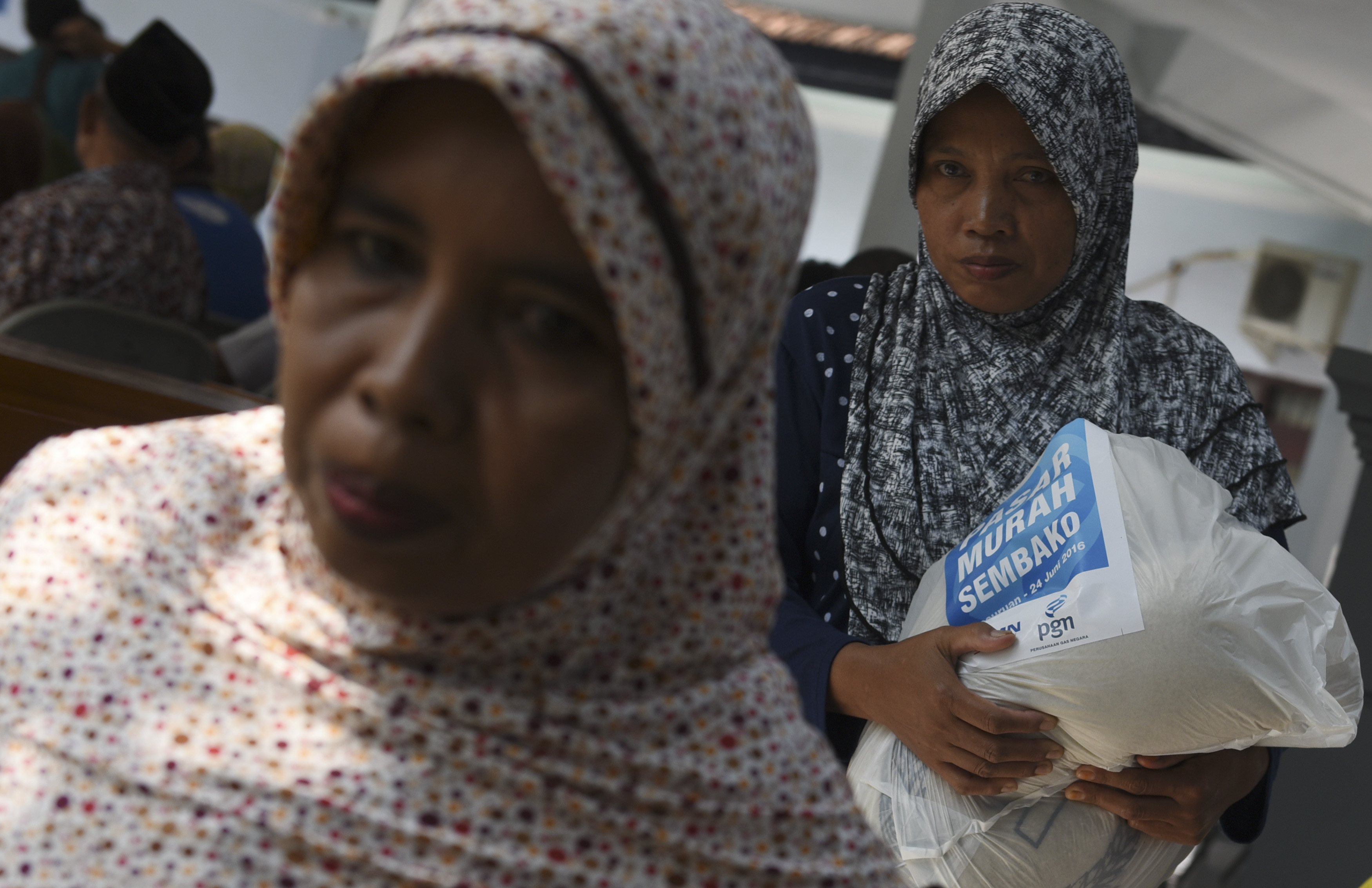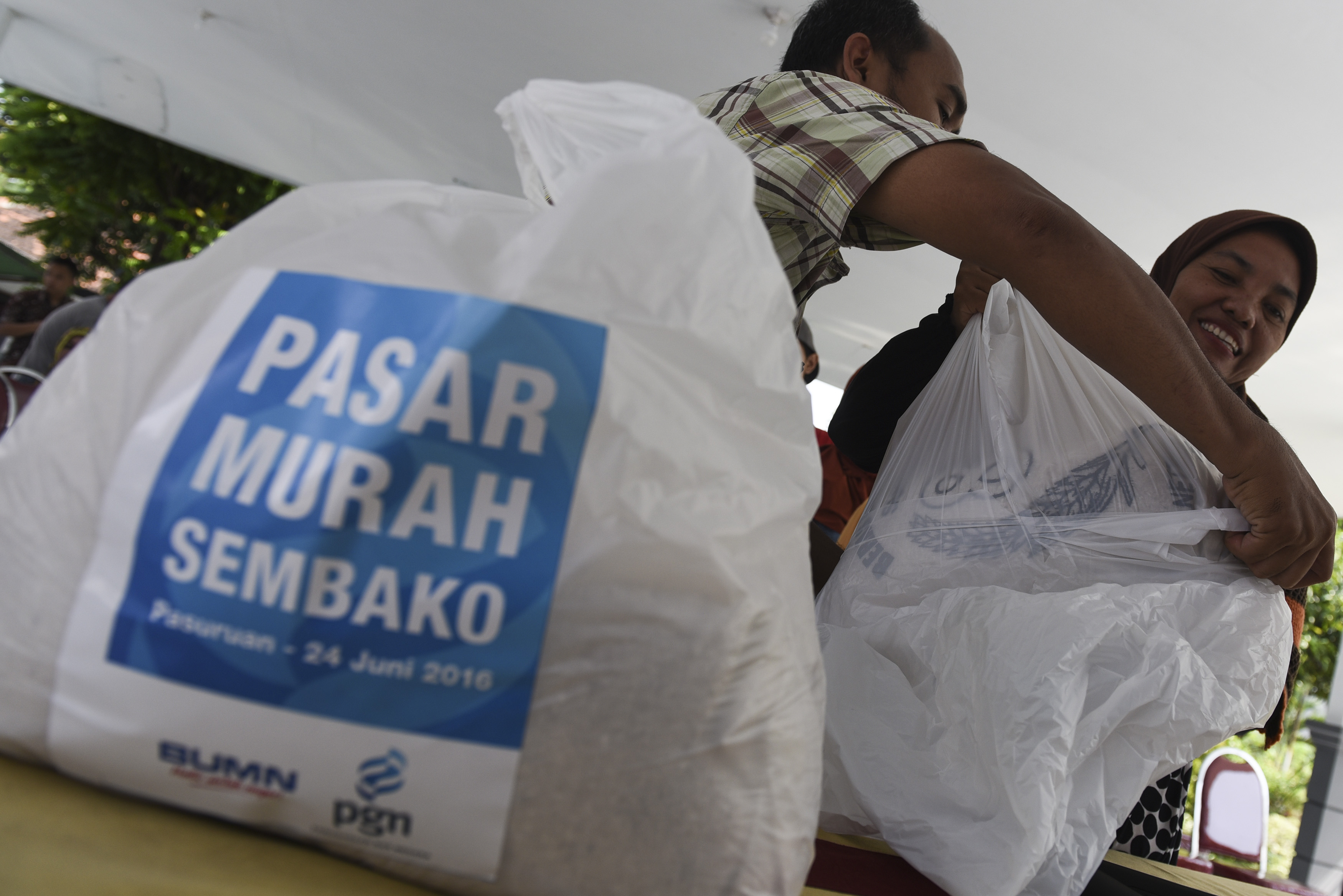 Warga mengantri bungkusan yang berisi sembako saat digelar pasar murah sembako PGN di Pasuruan, Jawa Timur, Jumat (24/6). Pasar murah tersebut digelar guna membantu warga memenuhi kebutuhan pokoknya di bulan Ramadan dengan harga murah serta mengantisipasi lonjakan harga barang kebutuhan pokok di pasaran. ANTARA FOTO/Zabur Karuru/foc/16.