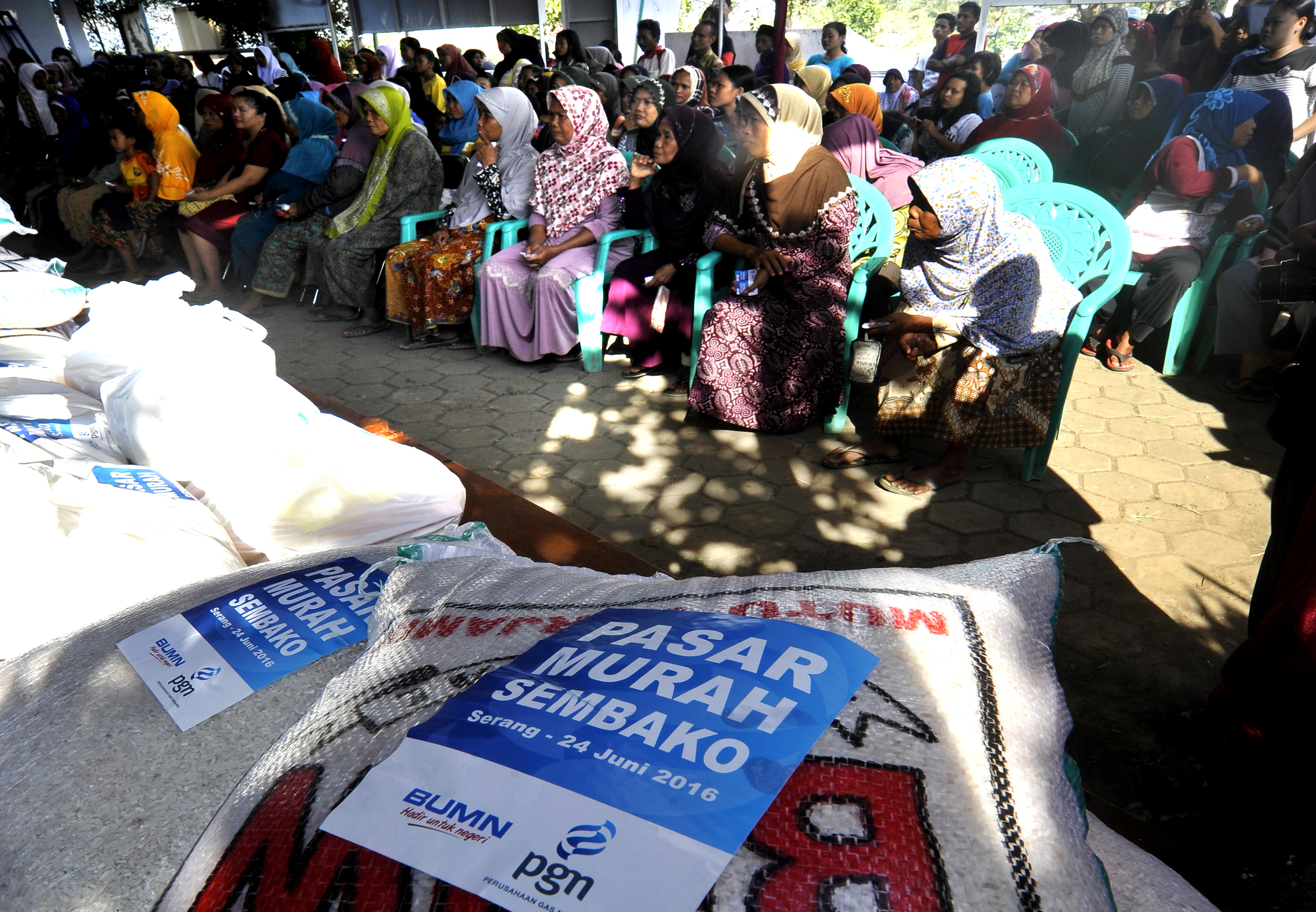 Ratusan warga Desa Teluk Terate, Kramatwatu, Serang, Banten, hadir di area pasar murah yang digelar PT Perusahaan Gas Negara (PGN), Jumat (24/6). Dalam rangkaian program BUMN Hadir Untuk Negeri itu PT PGN menyediakan 1500 paket sembako murah untuk 4 Desa di lokasi itu. ANTARA FOTO/Asep Fathulrahman/foc/16.